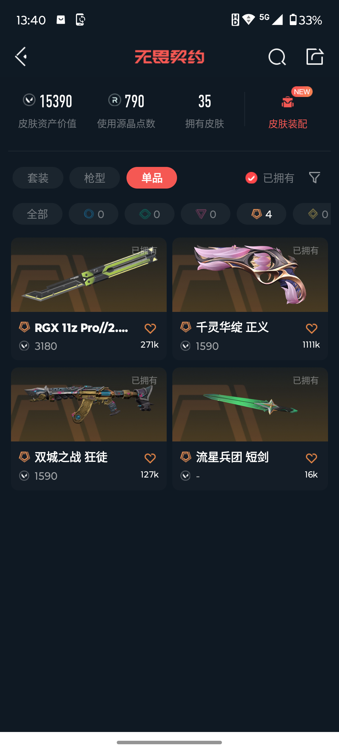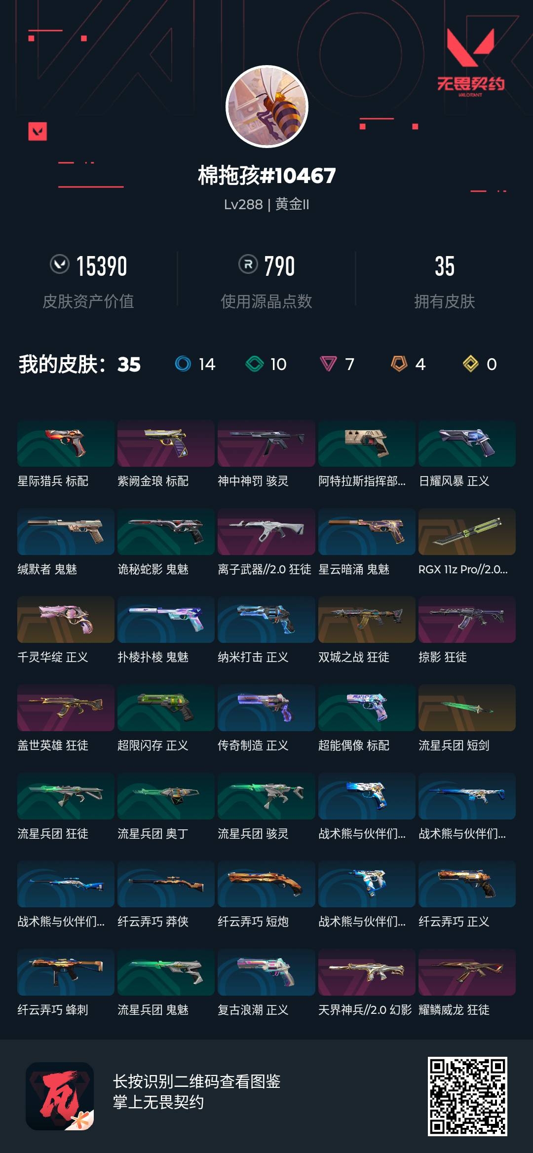 [14473377]q191708 无畏契约/等级288/段位黄金2/英雄17/皮肤35/资产15390/已使用r点790/剩余r点190/流星兵团-短剑,rgx-11z-pro//2.0-蝴蝶刀,双城之战-狂徒,离子武器//2.0-狂徒,天界神兵//2.0-幻影,盖世英雄-狂徒,耀鳞威龙-狂徒-,掠影-狂徒,神中神罚-骇灵,千灵华绽-正义,紫阙金琅-标配