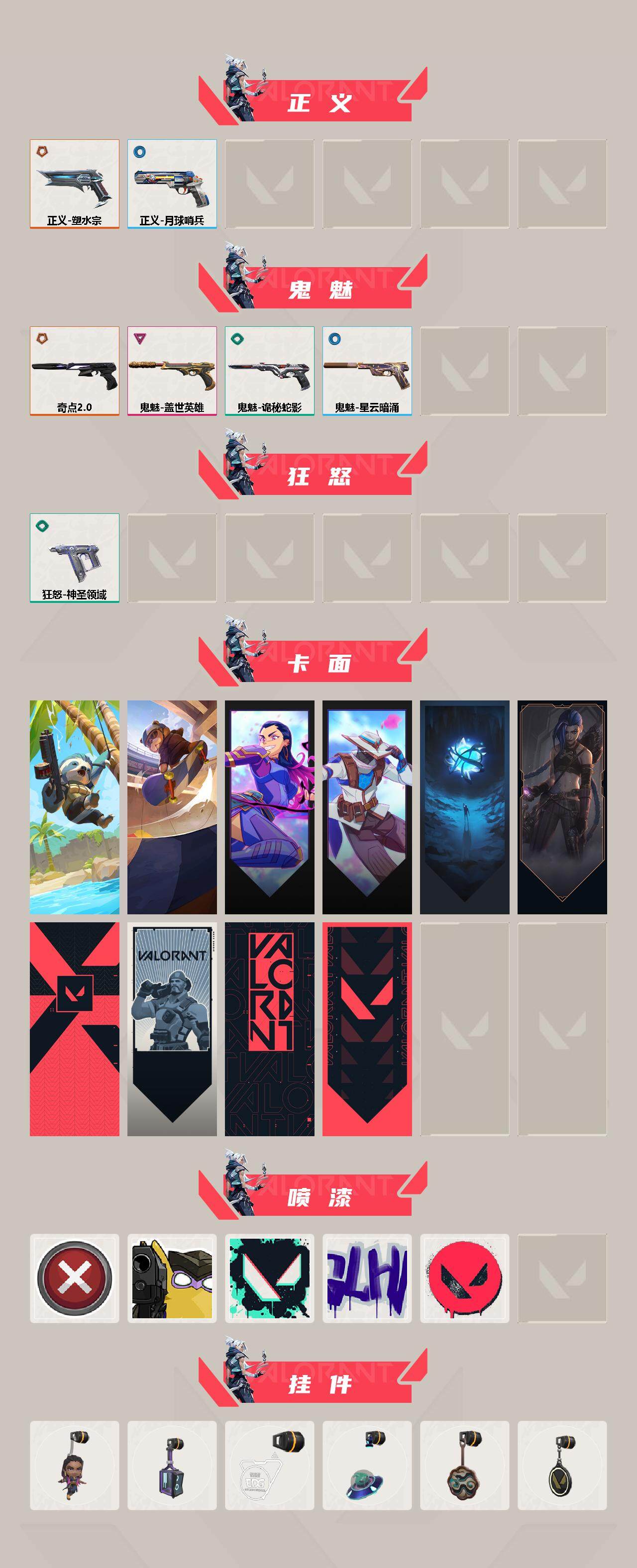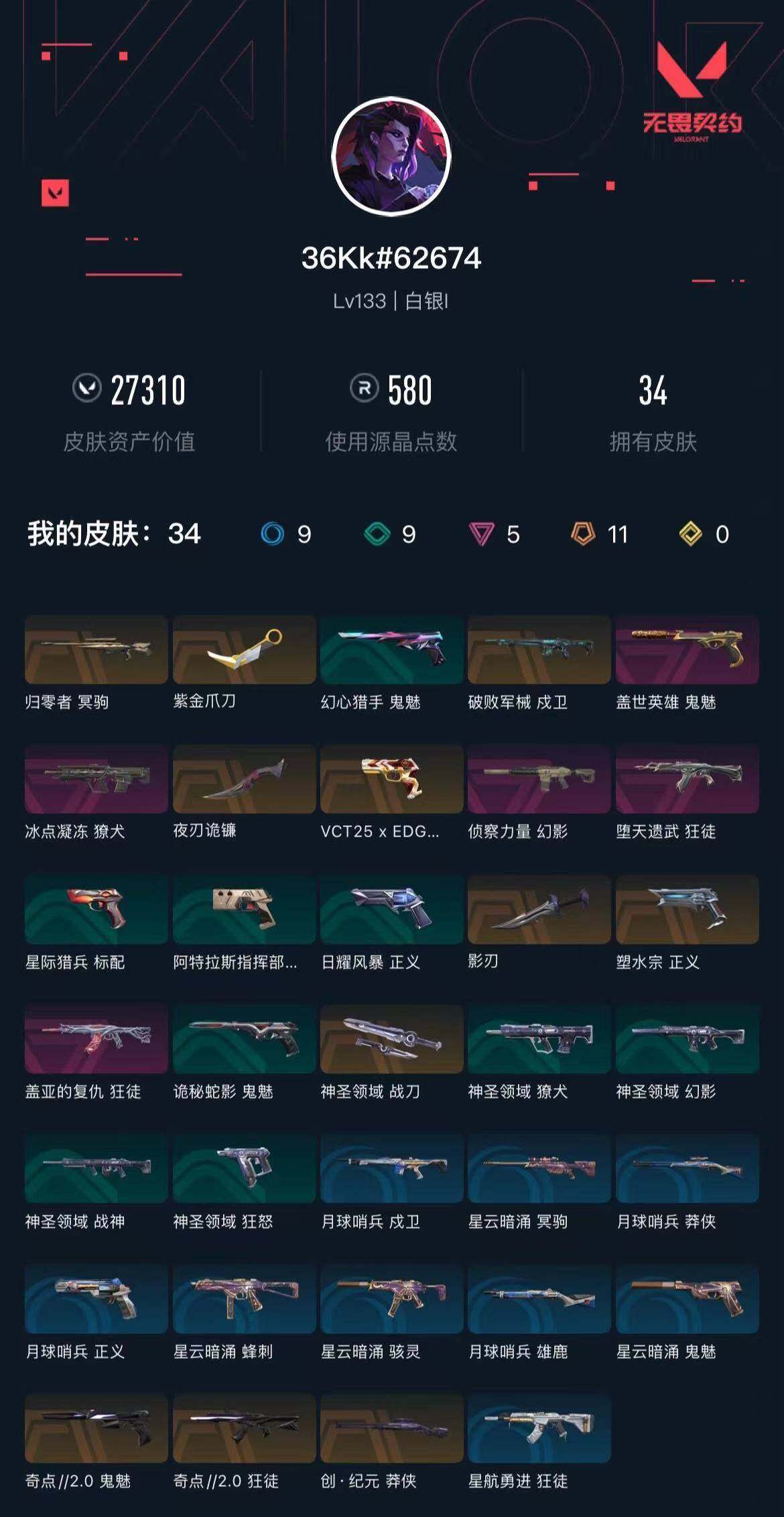 [14473604]【英雄】:幻棱,炼狱,维斯,暮蝶,钛狐,壹决,铁臂,捷风,雷兹,幽影,不死鸟,贤者,猎枭,蝰蛇,零,芮娜,奇乐,尚勃勒,霓虹,斯凯,夜露,k/o,海神,盖可,黑梦,钢锁 【近战 武器】:近战武器-紫金爪刀,近战武器-夜刃诡镰,近战武器-影刃,近战武器-神圣领域 战刀 【狂徒】:狂徒-奇点//2.0,狂徒-堕天遗武,狂徒-盖亚的复仇,狂徒-星航勇进 【幻影】:幻影-侦察力量,幻影-神圣领域 【戍卫】:戍卫-破败军械,戍卫-月球哨兵 【獠犬】:獠犬-冰点凝冻,獠犬-神圣领域 【冥驹】:冥驹-归零者,冥驹-星云暗涌 【莽侠】:莽侠-创·纪元,莽侠-月球哨兵 【战神】:战神-神圣领域 【雄鹿】:雄鹿-月球哨兵 【骇灵】:骇灵-星云暗涌 【蜂刺】:蜂刺-星云暗涌 【vct手呛】:标配-vct25 x edg 【正义】:正义-塑水宗,正义-月球哨兵 【鬼魅】:鬼魅-奇点//2.0,鬼魅-盖世英雄,鬼魅-诡秘蛇影,鬼魅-星云暗涌 【狂怒】:狂怒-神圣领域 【卡面】:树懒大作战 卡面,clutch 卡面,无畏契约go!第一卷:芮娜 卡面,无畏契约go!第一卷:零 卡面,无垠星环 卡面,《双城之战》金克丝 卡面,代号红色 卡面,新兵报到 卡面,v契约 卡面,无畏契约 卡面 【喷漆】:买装还是存钱 喷漆,放下武器 喷漆,胜利属于无畏契约 喷漆,glhf 喷漆,无畏契约 喷漆 【挂饰】:无畏契约go!第一卷 芮娜 挂饰,动力机箱 挂饰,vct x edg 挂饰,天外飞客 挂饰,萌彩剪影 挂饰,无畏契约 纪念币 挂饰