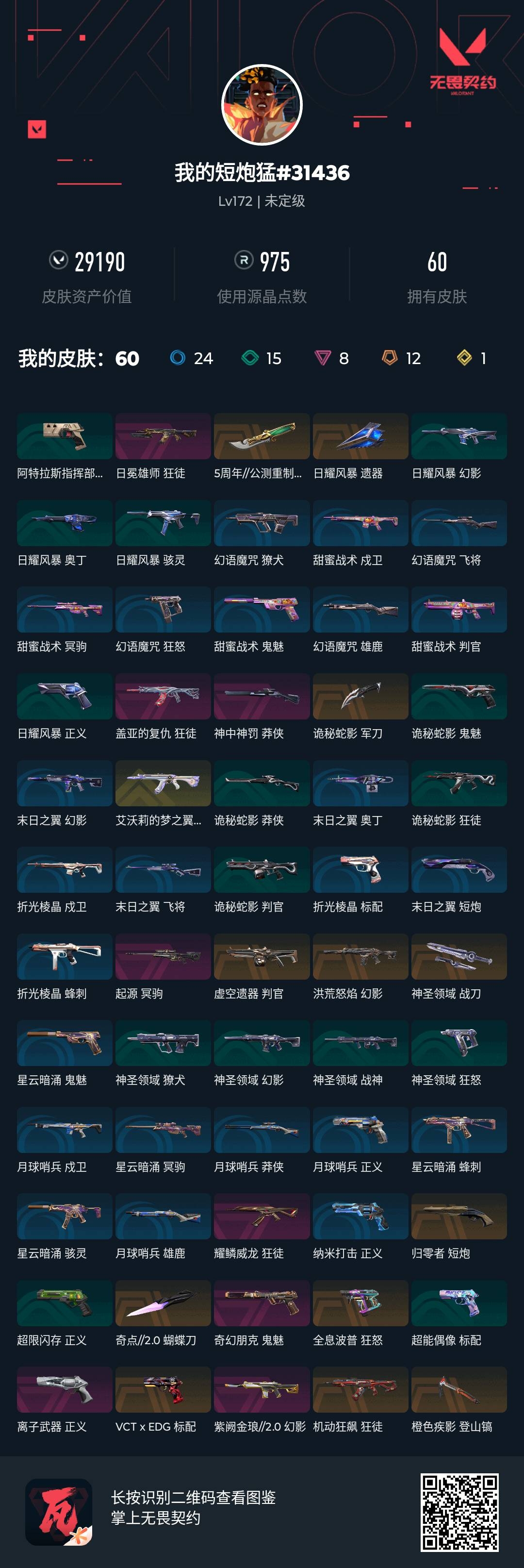 [14477226]b190258 无畏契约/172等级/未定级/27英雄/60皮肤/29190资产/已使用r点975/剩余r点155/5周年//公测重制版-苍龙之刃,日耀风暴-遗器,诡秘蛇影-军刀,神圣领域-战刀,橙色疾影-登山镐,奇点//2.0-蝴蝶刀,洪荒怒焰-幻影,机动狂飙-狂徒,艾沃莉的梦之翼-狂徒,紫阙金琅//2.0-幻影,盖亚的复仇-狂徒,耀鳞威龙-狂徒-,日冕雄师-狂徒,神中神罚-莽侠,起源-冥驹,虚空遗器-判官,vct-x-edg-标配,全息波普-狂怒,归零者-短炮,离子武器-正义,奇幻朋克-鬼魅