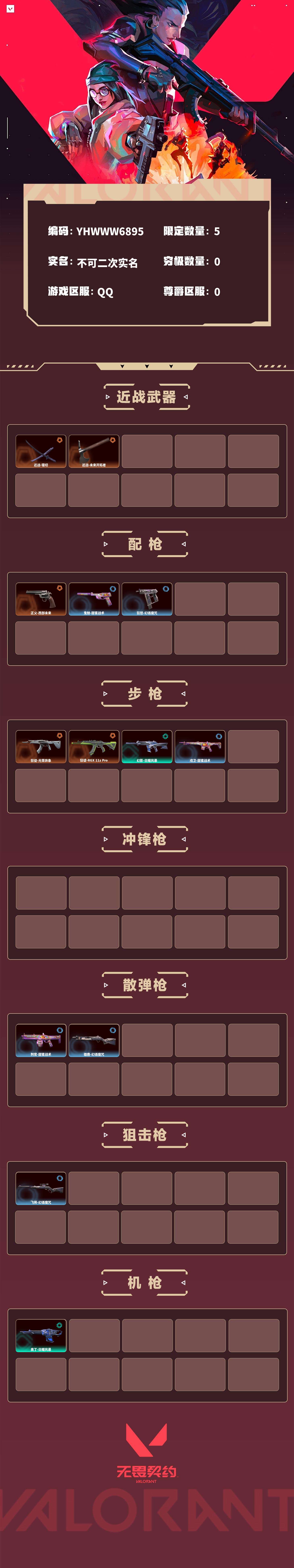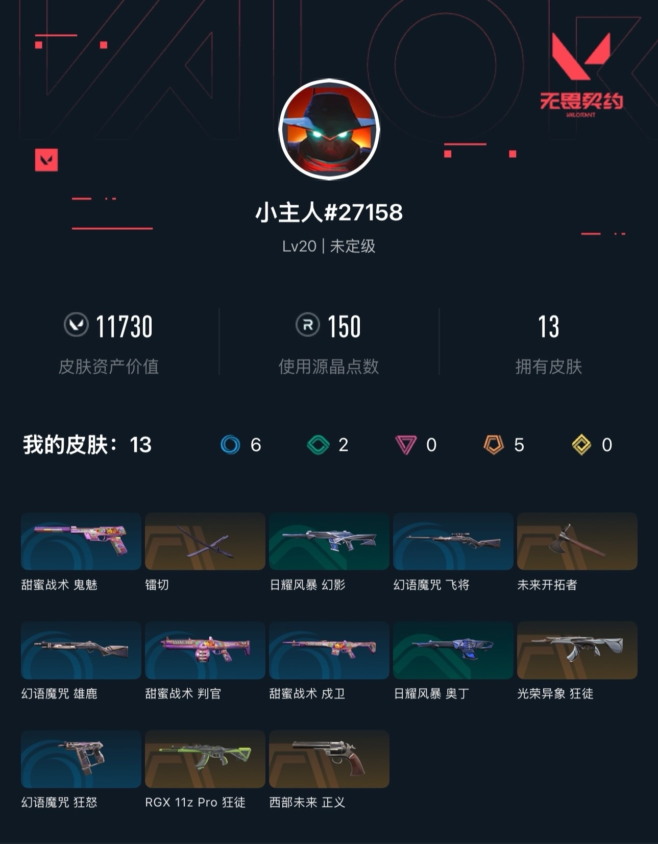 【无畏契约】【yhwww6895】等级:20,已用无畏点11730,已用源晶点150,段位:未定级__橙皮:近战-镭切|正义-西部未来|近战-未来开拓者|狂徒-光荣异象|狂徒-rgx 11z pro__绿皮:幻影-日耀风暴|奥丁-日耀风暴__蓝皮:鬼魅-甜蜜战术|判官-甜蜜战术|戍卫-甜蜜战术|雄鹿-幻语魔咒|飞将-幻语魔咒|狂怒-幻语魔咒__英雄:壹决|炼狱|贤者|猎枭|芮娜|捷风|不死鸟|幻棱