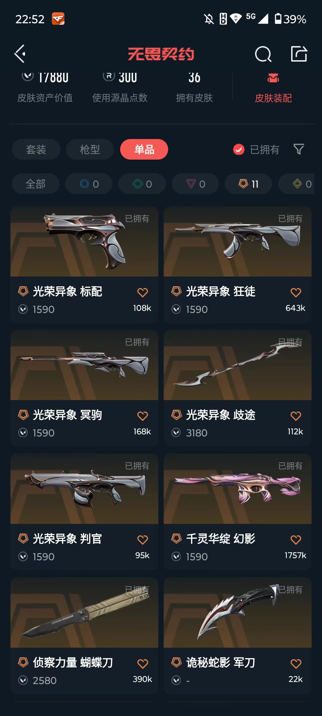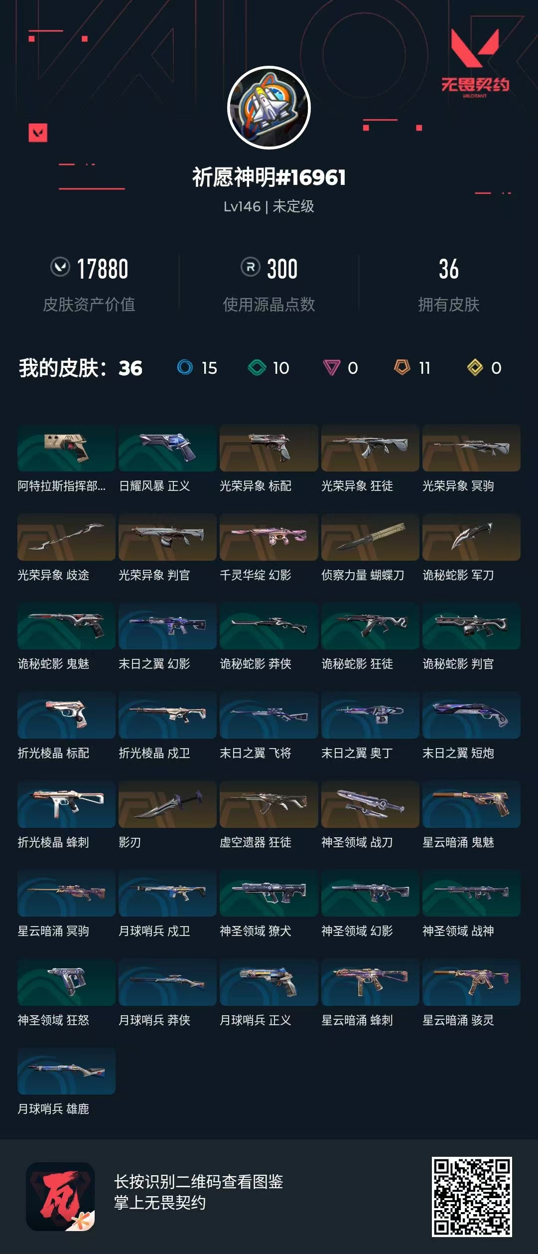 [14399874]s192279(光荣异象套装)无畏契约/146等级/未定级段位/27英雄/36皮肤/资产17880/已使用r点300/剩余r点310/光荣异象-狂徒光荣异象-冥驹光荣异象-判官光荣异象-标配光荣异象-歧途,诡秘蛇影-军刀,神圣领域-战刀,侦察力量-蝴蝶刀,影刃,虚空遗器-狂徒,千灵华绽-幻影