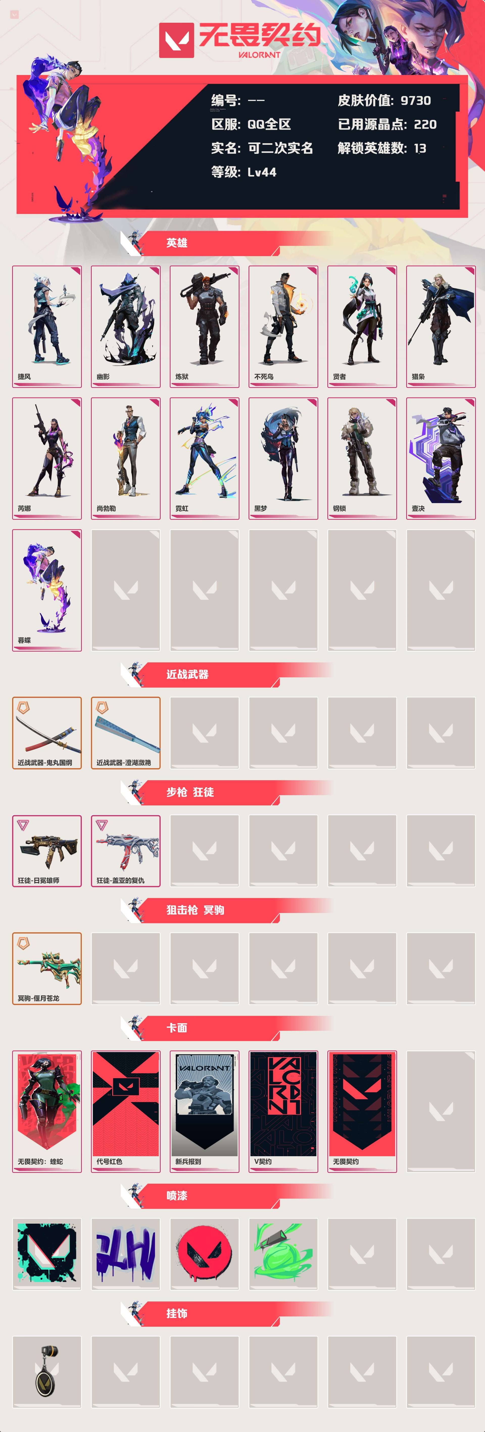 [14342302]等级:lv44 | 青铜iii/ 已用源晶点:220/ 皮肤价值:9730/ 英雄数:13/ 【英雄】 捷风 幽影 炼狱 不死鸟 贤者 猎枭 芮娜 尚勃勒 霓虹 黑梦 钢锁 壹决 暮蝶 【套装】 偃月苍龙套装(偃月苍龙冥驹) 盖亚的复仇套装(盖亚的复仇狂徒) 日冕雄师(日冕雄师狂徒) 般若假面//2.0 礼包(鬼丸国纲) 【步呛 獠犬】 獠犬-幻语魔咒 【近战武器】 近战武器-鬼丸国纲 近战武器-日耀风暴 遗器 近战武器-澄湖潋滟 【佩呛 狂怒】 狂怒-幻语魔咒 【佩呛 鬼魅】 鬼魅-甜蜜战术 【佩呛 正义】 正义-日耀风暴 【佩呛 标配】 标配-阿特拉斯指挥部 【冲锋呛 骇灵】 骇灵-日耀风暴 【霰弹呛 雄鹿】 雄鹿-幻语魔咒 【霰弹呛 判官】 判官-甜蜜战术 【步呛 戍卫】 戍卫-甜蜜战术 【步呛 幻影】 幻影-日耀风暴 【步呛 狂徒】 狂徒-日冕雄师 狂徒-盖亚的复仇 【狙击呛 冥驹】 冥驹-甜蜜战术 冥驹-偃月苍龙 【狙击呛 飞将】 飞将-幻语魔咒 【机呛 奥丁】 奥丁-日耀风暴 【卡面】 无畏契约:蝰蛇 代号红色 新兵报到 v契约 无畏契约 【喷漆】 胜利属于无畏契约 glhf 无畏契约 喜欢哪种毒? 【挂饰】 无畏契约