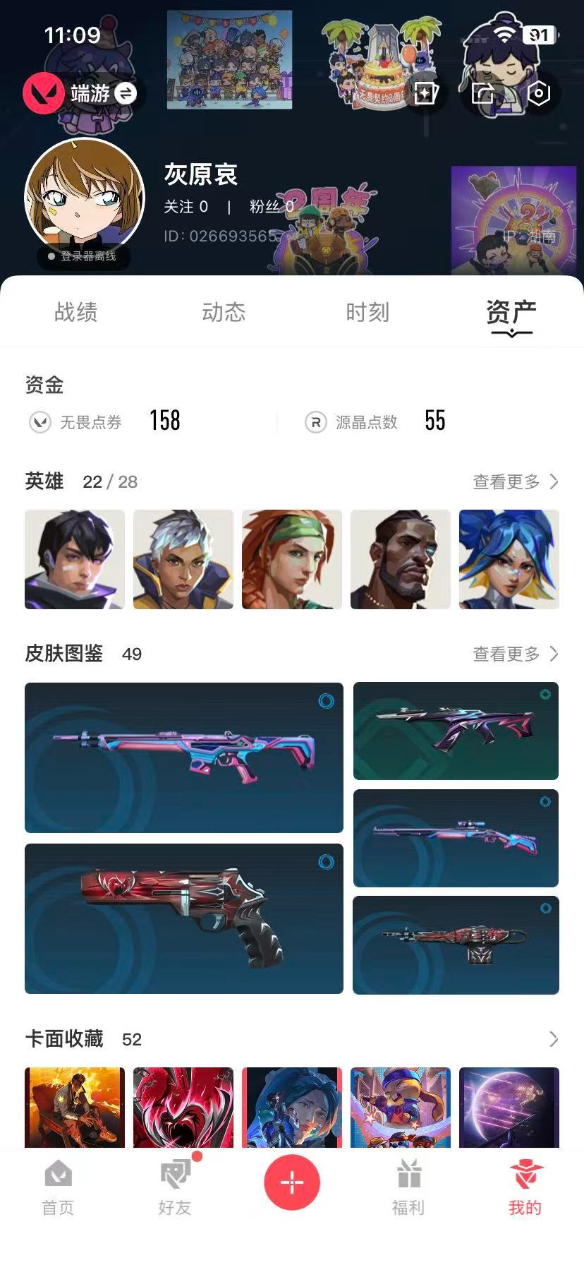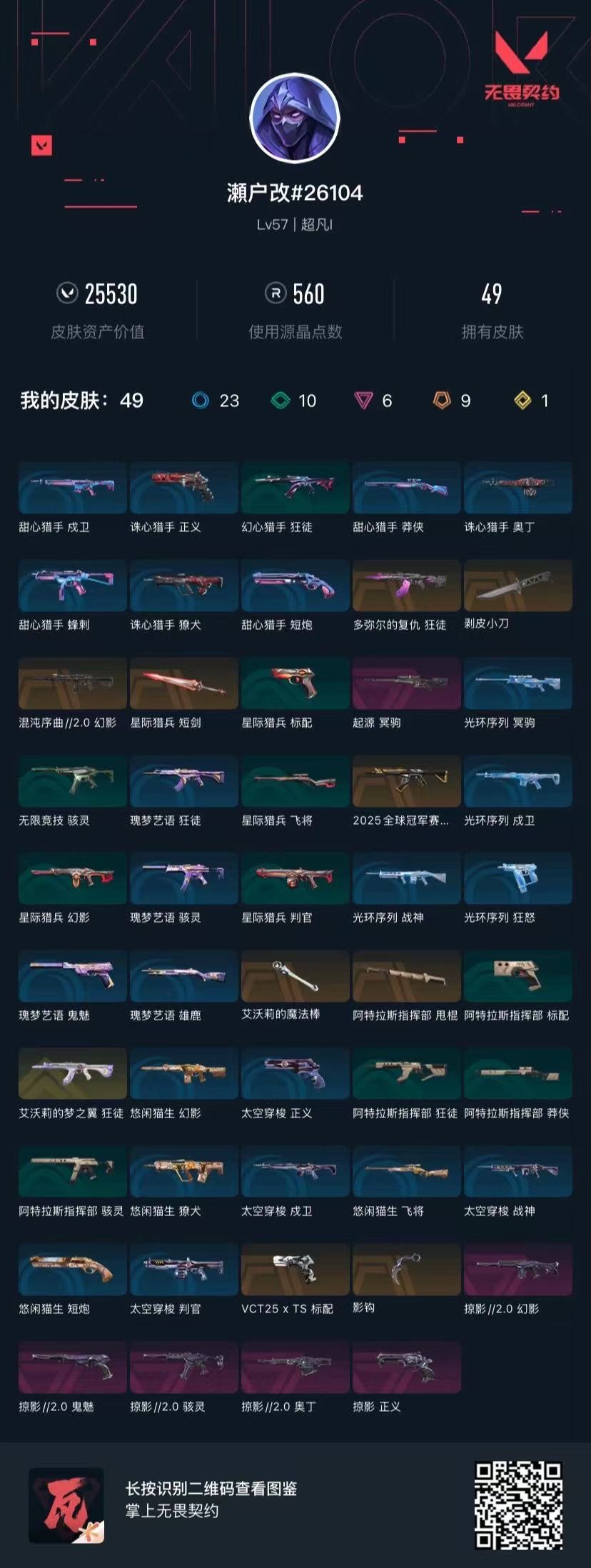 9橙皮 1金皮 6紫皮 49皮肤 22英雄 52卡面 560已用源晶 超凡段位 【套装】:掠影2.0套装 【近战武器皮肤】:影钩阿特拉斯指挥部星际猎兵 短剑艾沃莉的魔法棒剥皮小刀 【佩呛皮肤】:标配-vct25xts正义-掠影鬼魅-掠影2.0 【冲锋呛皮肤】:骇灵-掠影2.0 【步呛皮