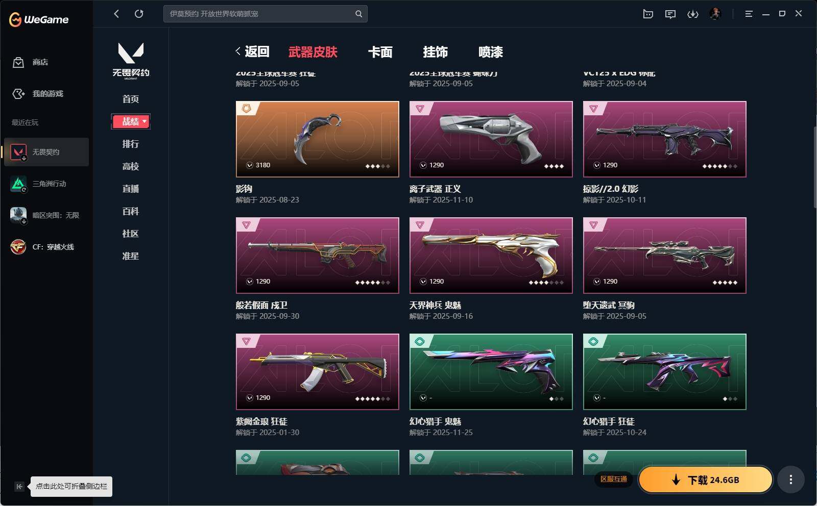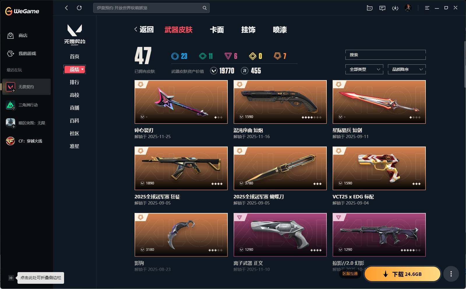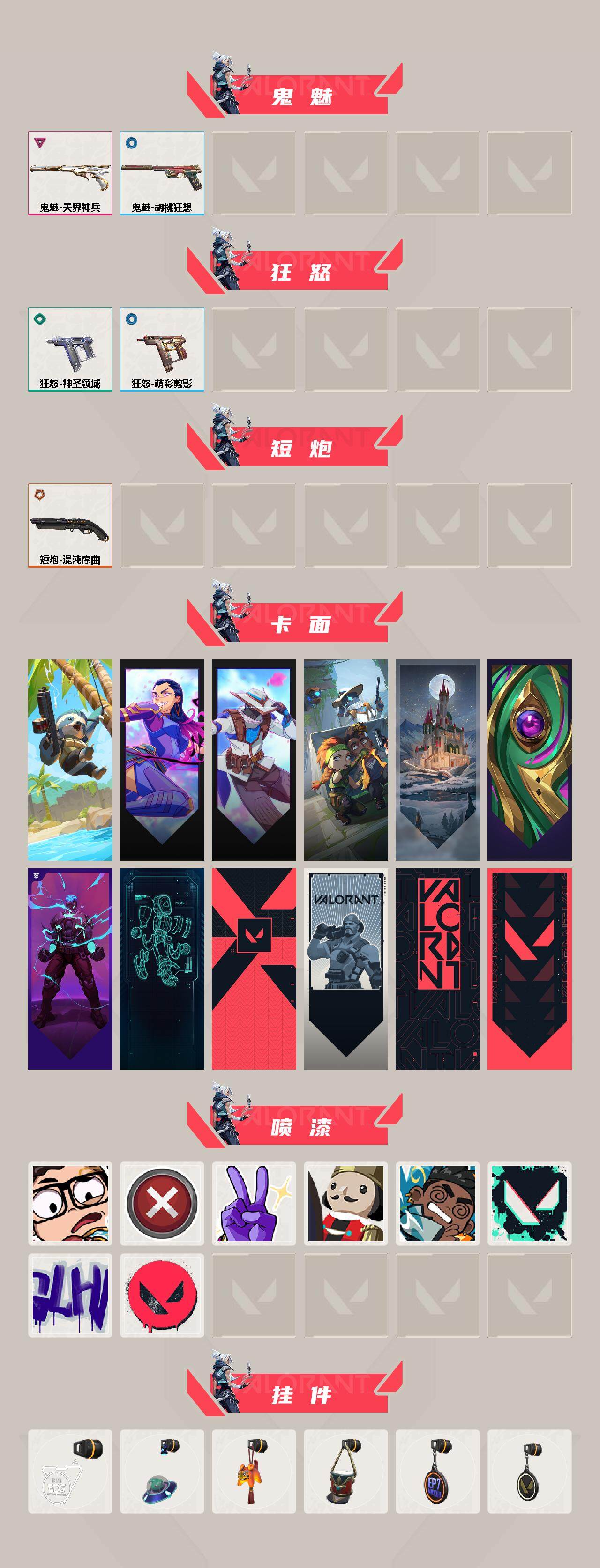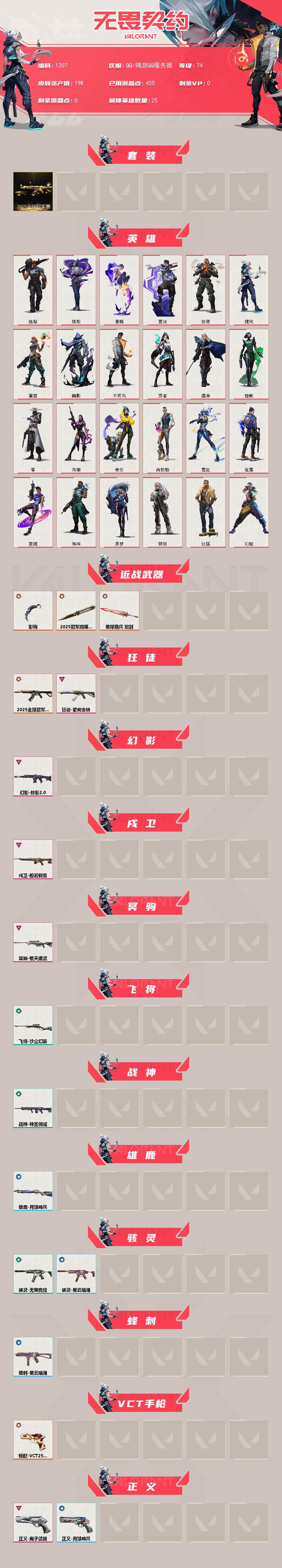 【1207】xq36296 【套装】:2025全球冠军赛套装 【英雄】:幻棱,炼狱,维斯,暮蝶,钛狐,壹决,铁臂,捷风,雷兹,幽影,不死鸟,贤者,猎枭,蝰蛇,零,芮娜,奇乐,尚勃勒,霓虹,夜露,星礈,海神,黑梦,钢锁 【近战 武器】:近战武器-2025全球冠军赛 蝴蝶刀,近战武器-影钩,近战武器-星际猎兵 短剑 【狂徒】:狂徒-2025全球冠军赛,狂徒-紫阙金琅 【幻影】:幻影-掠影//2.0 【戍卫】:戍卫-般若假面 【冥驹】:冥驹-堕天遗武 【飞将】:飞将-沙尘幻旅 【战神】:战神-神圣领域 【雄鹿】:雄鹿-月球哨兵 【骇灵】:骇灵-无限竞技,骇灵-星云暗涌 【蜂刺】:蜂刺-星云暗涌 【vct手呛】:标配-vct25 x edg 【正义】:正义-离子武器,正义-月球哨兵 【鬼魅】:鬼魅-天界神兵,鬼魅-胡桃狂想 【狂怒】:狂怒-神圣领域,狂怒-萌彩剪影 【短炮】:短炮-混沌序曲 【卡面】:树懒大作战 卡面,无畏契约go!第一卷:芮娜 卡面,无畏契约go!第一卷:零 卡面,别冒尖 卡面,胡桃狂想 卡面,沙尘幻旅 卡面,势不可挡//k/o 卡面,铁臂设计图 卡面,代号红色 卡面,新兵报到 卡面,v契约 卡面,无畏契约 卡面 【喷漆】:新潮流 喷漆,买装还是存钱 喷漆,沙尘幻旅 喷漆,胡桃狂想 喷漆,爆泉领域 喷漆,胜利属于无畏契约 喷漆,glhf 喷漆,无畏契约 喷漆 【挂饰】:vct x edg 挂饰,天外飞客 挂饰,好运福爪 挂饰,胡桃狂想 挂饰,第七季//第三幕 纪念币 挂饰,无畏契约 纪念币 挂饰