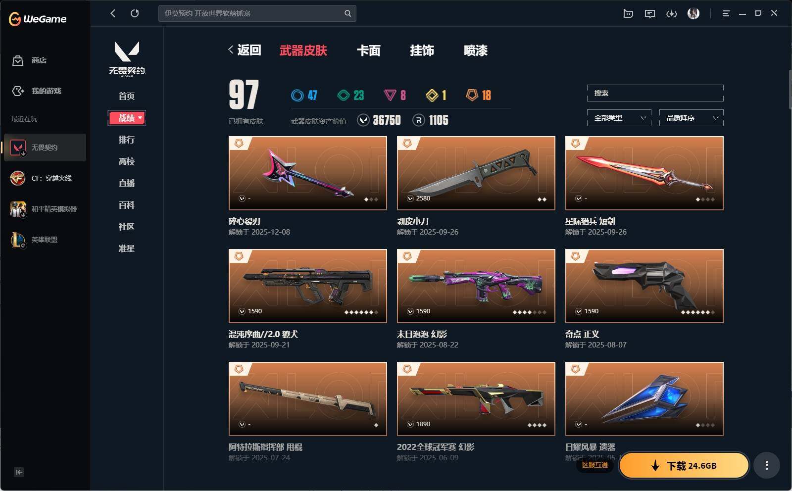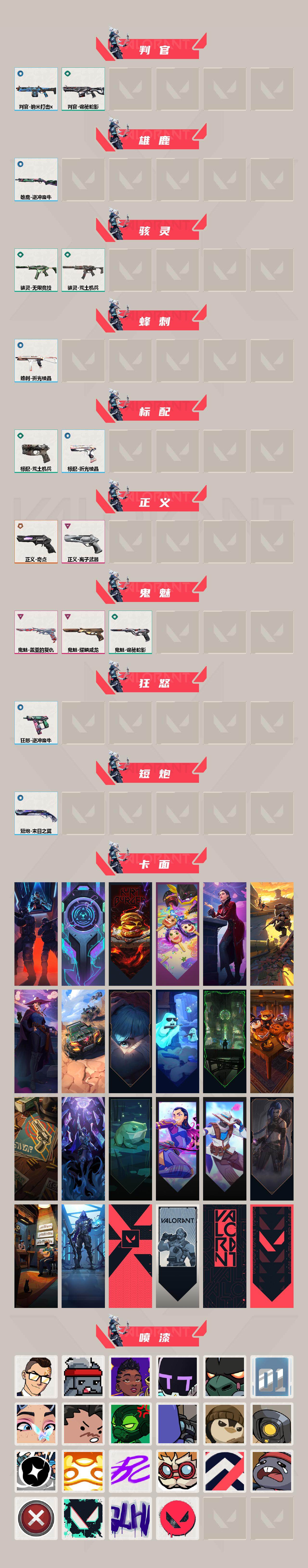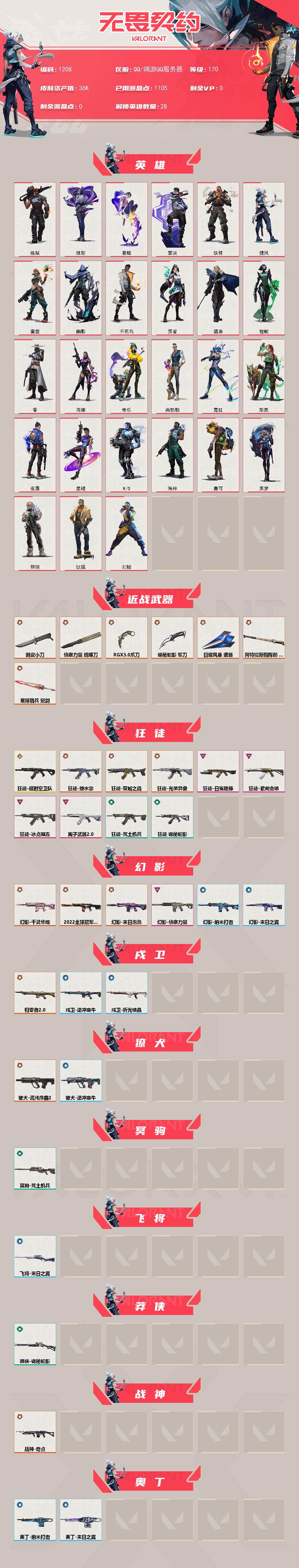 【1208】xq29826 【英雄】:幻棱,炼狱,维斯,暮蝶,钛狐,壹决,铁臂,捷风,雷兹,幽影,不死鸟,贤者,猎枭,蝰蛇,零,芮娜,奇乐,尚勃勒,霓虹,斯凯,夜露,星礈,k/o,海神,盖可,黑梦,钢锁 【近战 武器】:近战武器-侦察力量 蝴蝶刀,近战武器-剥皮小刀,近战武器-rgx 11z pro//3.0 爪刀,近战武器-诡秘蛇影 军刀,近战武器-日耀风暴 遗器,近战武器-阿特拉斯指挥部 甩棍,近战武器-星际猎兵 短剑 【狂徒】:狂徒-超时空卫队,狂徒-双城之战,狂徒-塑水宗,狂徒-光荣异象,狂徒-冰点凝冻,狂徒-日冕雄师,狂徒-紫阙金琅,狂徒-离子武器//2.0,狂徒-荒土机兵,狂徒-诡秘蛇影 【幻影】:幻影-2022全球冠军赛,幻影-千灵华绽,幻影-末日泡泡,幻影-侦察力量,幻影-纳米打击,幻影-末日之翼 【戍卫】:戍卫-归零者//2.0,戍卫-逆冲蛮牛,戍卫-折光棱晶 【獠犬】:獠犬-混沌序曲//2.0,獠犬-逆冲蛮牛 【冥驹】:冥驹-荒土机兵 【飞将】:飞将-末日之翼 【莽侠】:莽侠-诡秘蛇影 【战神】:战神-奇点 【奥丁】:奥丁-纳米打击,奥丁-末日之翼 【判官】:判官-诡秘蛇影,判官-纳米打击x 【雄鹿】:雄鹿-逆冲蛮牛 【骇灵】:骇灵-荒土机兵,骇灵-无限竞技 【蜂刺】:蜂刺-折光棱晶 【标配】:标配-荒土机兵,标配-折光棱晶 【正义】:正义-奇点,正义-离子武器 【鬼魅】:鬼魅-盖亚的复仇,鬼魅-耀鳞威龙,鬼魅-诡秘蛇影 【狂怒】:狂怒-逆冲蛮牛 【短炮】:短炮-末日之翼 【卡面】:纳米打击 卡面,抑制技术 卡面,激斗汉堡 卡面,瓦娃脸雪糕 p2 卡面,从黄昏到黎明 卡面,荒土机兵 卡面,银弹猎手 卡面,逆冲蛮牛 卡面,《双城之战》拥抱 卡面,精灵大战 卡面,欢迎来到底城 卡面,南瓜盛典 卡面,正义的化身 卡面,失而复得 卡面,霓帧牛蛙 卡面,无畏契约go!第一卷:芮娜 卡面,无畏契约go!第一卷:零 卡面,《双城之战》金克丝 卡面,完美调谐 卡面 ,暗呛 卡面,代号红色 卡面,新兵报到 卡面,v契约 卡面,无畏契约 卡面 【喷漆】:小小心意 喷漆,战“素”兔 喷漆,宇宙的指引 喷漆,请求重启 喷漆,逆冲蛮牛 喷漆,纳米打击 喷漆,鼻尖上的蝴蝶 喷漆,简笔画黯兽 喷漆,独守蝰腹 喷漆,他们将落荒而逃 喷漆,通缉:战术企鹅 喷漆,荒土机兵 喷漆,别挡我吃球! 喷漆,嗨宝南瓜灯 喷漆,嘭! 喷漆,都算到了 喷漆,控场勿近 喷漆,熊抱 喷漆,买装还是存钱 喷漆,胜利属于无畏契约 喷漆,glhf 喷漆,无畏契约 喷漆 【挂饰】:悠闲鸡块 挂饰,猫猫木乃伊 挂饰,水壶 挂饰,纳米打击 挂饰,逆冲蛮牛 挂饰,可爱糖糖 挂饰,伞绳 挂饰,《双城之战》小蛋糕 挂饰,第九季//第三幕 纪念币 挂饰,第九季//第二幕 纪念币 挂饰,薰衣草之心 挂饰,z世代特饮 挂饰,天外飞客 挂饰,无畏契约 纪念币 挂饰