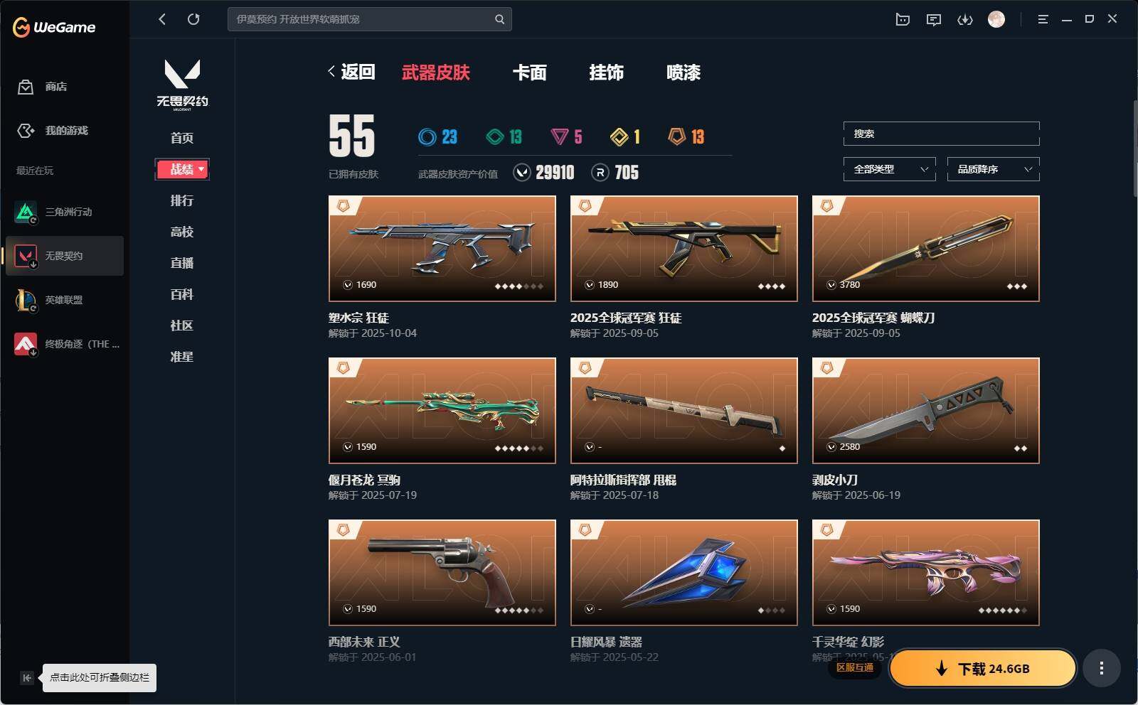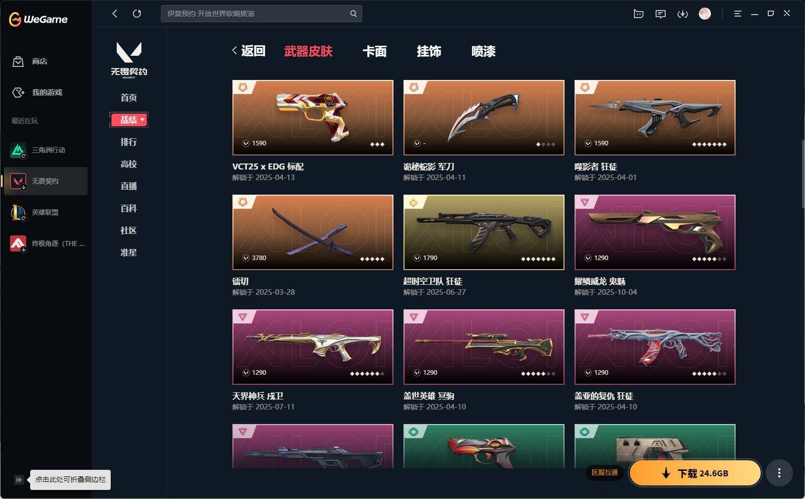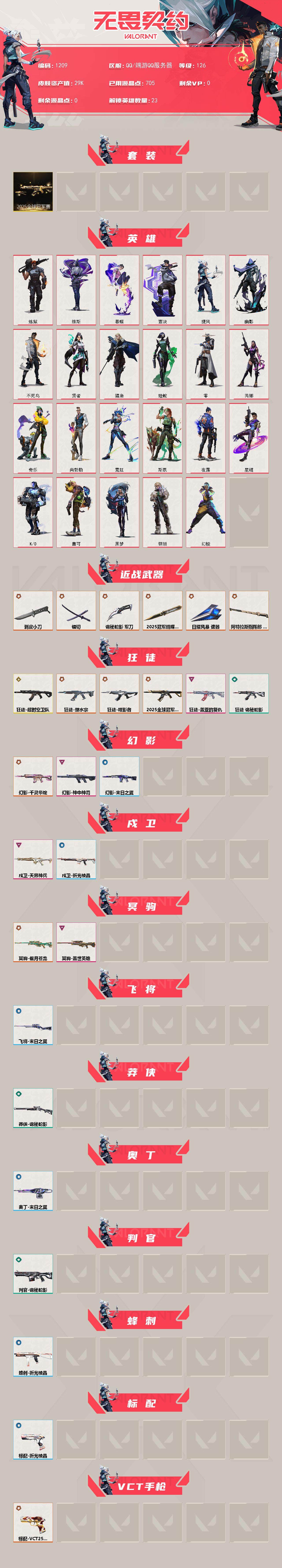【1209】xq20304 【套装】:2025全球冠军赛套装 【英雄】:幻棱,炼狱,维斯,暮蝶,壹决,捷风,幽影,不死鸟,贤者,猎枭,蝰蛇,零,芮娜,奇乐,尚勃勒,霓虹,斯凯,夜露,星礈,k/o,盖可,黑梦,钢锁 【近战 武器】:近战武器-2025全球冠军赛 蝴蝶刀,近战武器-剥皮小刀,近战武器-镭切,近战武器-诡秘蛇影 军刀,近战武器-日耀风暴 遗器,近战武器-阿特拉斯指挥部 甩棍 【狂徒】:狂徒-超时空卫队,狂徒-2025全球冠军赛,狂徒-塑水宗,狂徒-噬影者,狂徒-盖亚的复仇,狂徒-诡秘蛇影 【幻影】:幻影-千灵华绽,幻影-神中神罚,幻影-末日之翼 【戍卫】:戍卫-天界神兵,戍卫-折光棱晶 【冥驹】:冥驹-偃月苍龙,冥驹-盖世英雄 【飞将】:飞将-末日之翼 【莽侠】:莽侠-诡秘蛇影 【奥丁】:奥丁-末日之翼 【判官】:判官-诡秘蛇影 【蜂刺】:蜂刺-折光棱晶 【标配】:标配-折光棱晶 【vct手呛】:标配-vct25 x edg 【正义】:正义-西部未来 【鬼魅】:鬼魅-耀鳞威龙,鬼魅-诡秘蛇影 【短炮】:短炮-末日之翼 【卡面】:树懒大作战 卡面,无畏契约go!第一卷:芮娜 卡面,无畏契约go!第一卷:零 卡面,《双城之战》金克丝 卡面,代号红色 卡面,新兵报到 卡面,v契约 卡面,无畏契约 卡面 【喷漆】:买装还是存钱 喷漆,胜利属于无畏契约 喷漆,glhf 喷漆,无畏契约 喷漆 【挂饰】:vct x edg 挂饰,天外飞客 挂饰,无畏契约 纪念币 挂饰