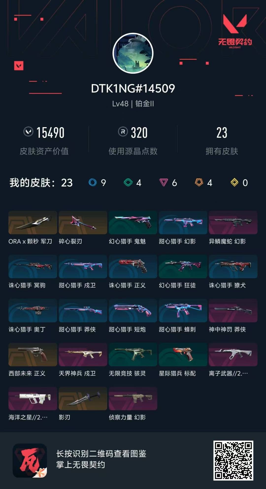4橙皮 6紫皮 23皮肤 13英雄 38卡面 320已用源晶 铂金段位 【近战武器皮肤】:ax颗秒 军刀影刃碎心裂刃 【佩呛皮肤】:正义-西部未来 【步呛皮肤】:獠犬-海洋之星2.0幻影-异鳞魔蛇狂徒-离子武器2.0幻影-侦察力量戍卫-天界神兵 【狙击呛皮肤】:莽侠-神中神罚 【挂