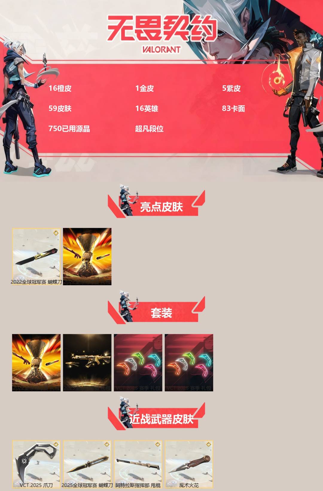 16橙皮 1金皮 5紫皮 59皮肤 16英雄 83卡面 750已用源晶 超凡段位 【亮点皮肤】:幻影-2022全球冠军赛蝴蝶刀-2022全球冠军赛 【套装】:2025全球冠军赛2022全球冠军赛vct 2025赛季礼包vcn2025套装 【近战武器皮肤】:阿特拉斯指挥部vct 202