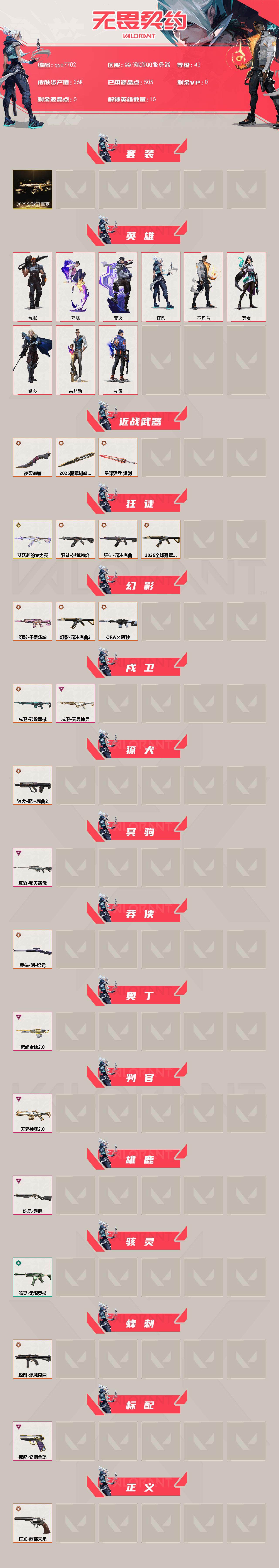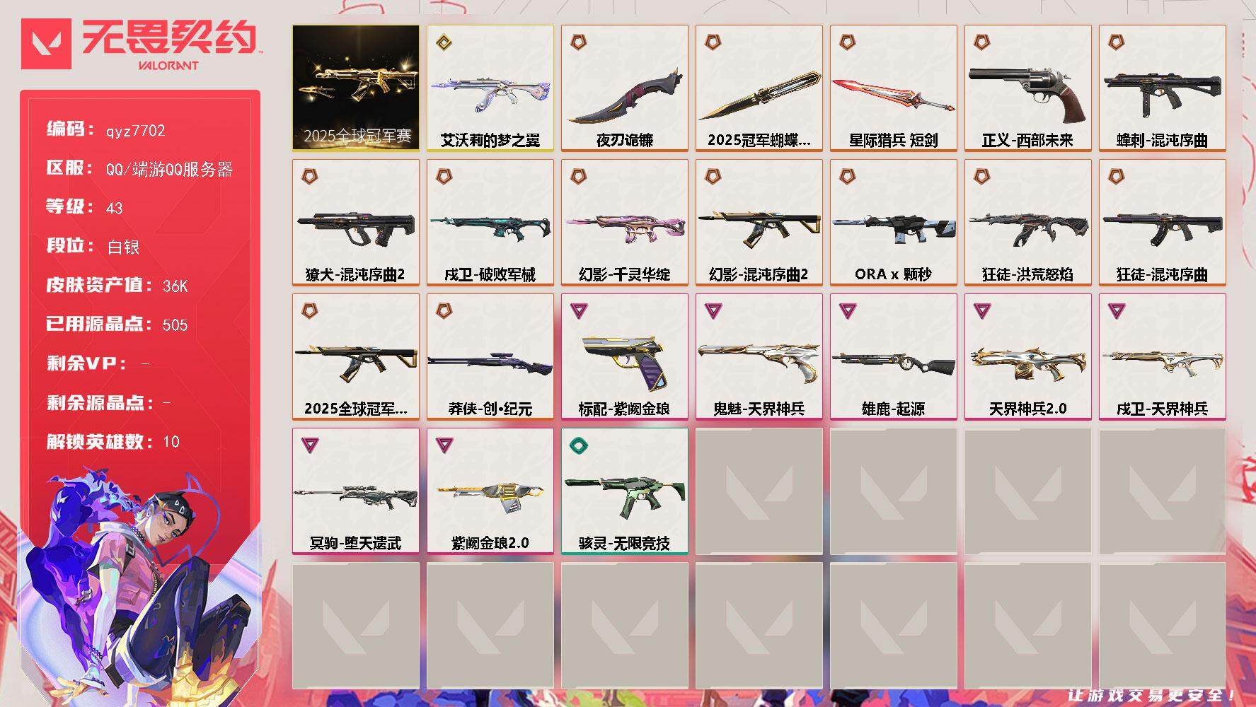 白银小号25冠军套洪荒艾沃莉混沌狂徒千灵颗秒幻影弃王大狙还有很多热门-qyz7702-近战武器皮肤:-夜刃诡镰-步呛皮肤:-戍卫-天界神兵戍卫-破败军械狂徒-洪荒怒焰幻影-千灵华绽狂徒-艾沃莉的梦之翼狂徒-混沌序曲-佩呛皮肤:-标配-紫阙金琅鬼魅-天界神兵正义-西部未来-狙击呛皮肤:-冥驹-堕天遗武莽侠-创纪元-冲锋呛皮肤:-蜂刺-混沌序曲-霰弹呛皮肤:-雄鹿-起源判官-天界神兵20-机呛皮肤:-奥丁-紫阙金琅20-亮点:-【qyz7702】【套装】:2025全球冠军赛套装【英雄】:炼狱,暮蝶,壹决,捷风,不死鸟,贤者,猎枭,尚勃勒,夜露【近战-武器】:近战武器-2025全球冠军赛-蝴蝶刀,近战武器-夜刃诡镰,近战武器-星际猎兵-短剑【狂徒】:狂徒-艾沃莉的梦之翼,狂徒-2025全球冠军赛,狂徒-洪荒怒焰,狂徒-混沌序曲【幻影】:幻影-千灵华绽,幻影-混沌序曲//20,幻影-a-x-颗秒【戍卫】:戍卫-破败军械,戍卫-天界神兵【獠犬】:獠犬-混沌序曲//20【冥驹】:冥驹-堕天遗武【莽侠】:莽侠-创纪元【奥丁】:奥丁-紫阙金琅//20【判官】:判官-天界神兵//20【雄鹿】:雄鹿-起源【骇灵】:骇灵-无限竞技【蜂刺】:蜂刺-混沌序曲【标配】:标配-紫阙金琅【正义】:正义-西部未来【鬼魅】:鬼魅-天界神兵【卡面】:clutch-卡面,无畏契约go!第一卷:芮娜-卡面,无畏契约go!第一卷:零-卡面,钢锁vs盖可-卡面,代号红色-卡面,新兵报到-卡面,v契约-卡面,无畏契约-卡面【喷漆】:买装还是存钱-喷漆,暴走萝莉-喷漆,胜利属于无畏契约-喷漆,glhf-喷漆,无畏契约-喷漆【挂饰】:逆冲蛮牛-挂饰,薰衣草之心-挂饰,天外飞客-挂饰,《双城之战》魄罗-挂饰,彩糖面包-挂饰,无畏契约-纪念币-挂饰