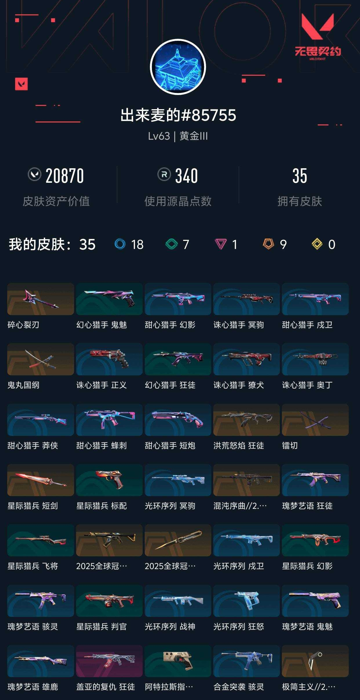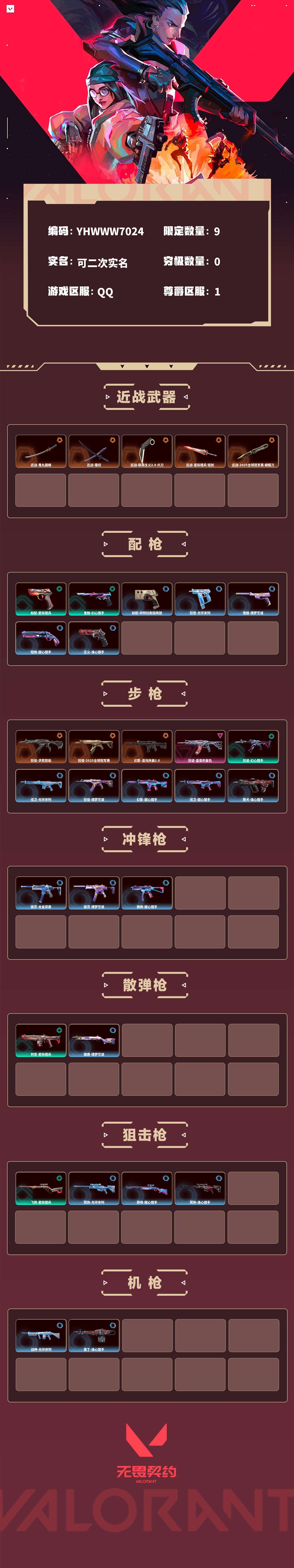 【无畏契约】【yhwww7024】等级:63,已用无畏点20870,已用源晶点340,橙皮:狂徒-洪荒怒焰|近战-鬼丸国纲|近战-镭切|近战-极简主义2.0 爪刀|近战-星际猎兵 短剑|狂徒-2025全球冠军赛|近战-2025全球冠军赛 蝴蝶刀|幻影-混沌序曲2.0__紫皮:狂徒-盖亚的复仇__段位:黄金__蓝皮:骇灵-合金突袭|标配-阿特拉斯指挥部|狂怒-光环序列|戍卫-光环序列|冥驹-光环序列|战神-光环序列|狂徒-瑰梦艺语|鬼魅-瑰梦艺语|骇灵-瑰梦艺语|雄鹿-瑰梦艺语|蜂刺-甜心猎手|短炮-甜心猎手|莽侠-甜心猎手|幻影-甜心猎手|戍卫-甜心猎手|正义-诛心猎手|冥驹-诛心猎手|獠犬-诛心猎手|奥丁-诛心猎手__绿皮:判官-星际猎兵|飞将-星际猎兵|标配-星际猎兵|狂徒-幻心猎手|鬼魅-幻心猎手__英雄:尚勃勒|黑梦|暮蝶|盖可|霓虹|壹决|k/o|幽影|夜露|炼狱|铁臂|贤者|猎枭|芮娜|零|捷风|不死鸟|幻棱|禁灭