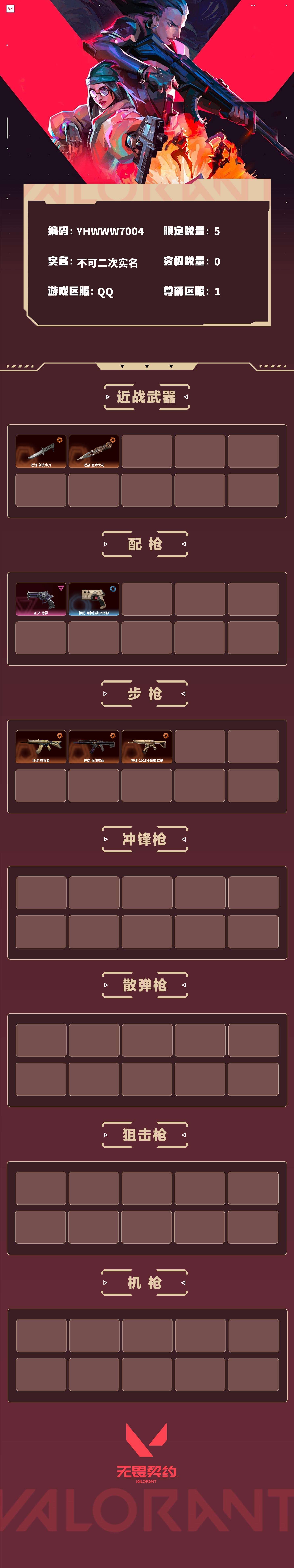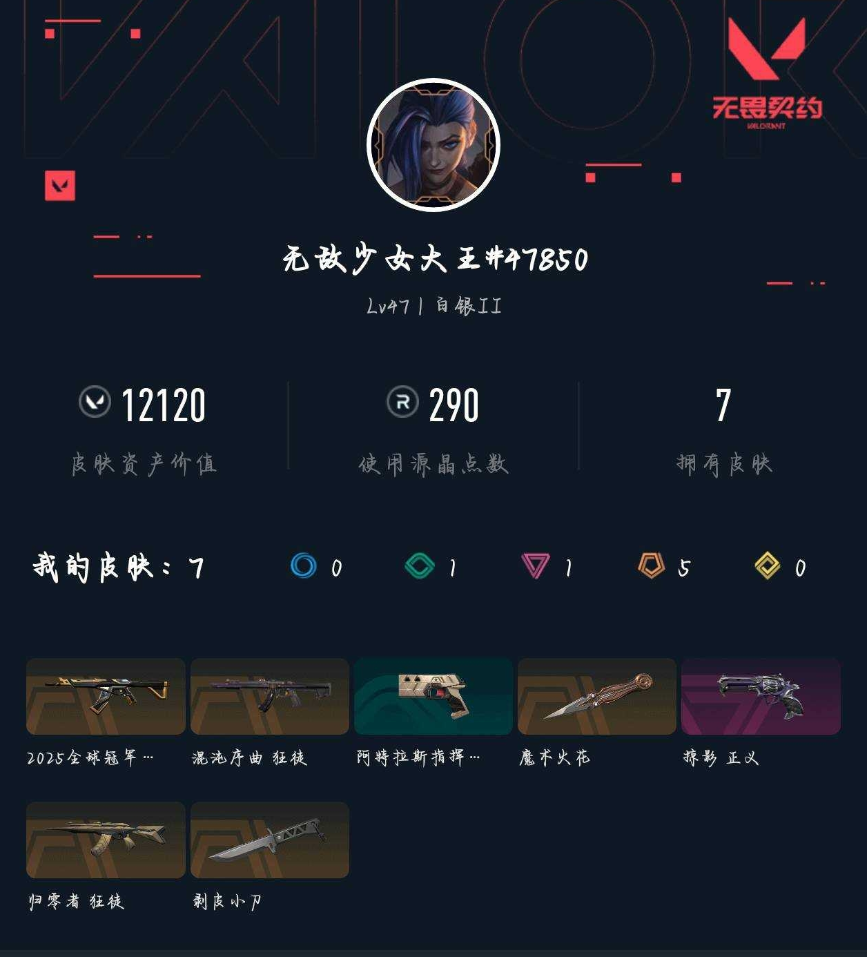 【无畏契约】【yhwww7004】等级:47,已用无畏点12120,已用源晶点290,橙皮:近战-剥皮小刀|狂徒-归零者|狂徒-混沌序曲|近战-魔术火花|狂徒-2025全球冠军赛__段位:白银__紫皮:正义-掠影__蓝皮:标配-阿特拉斯指挥部__英雄:尚勃勒|暮蝶|壹决|幽影|炼狱|贤者|猎枭|芮娜|零|捷风|不死鸟