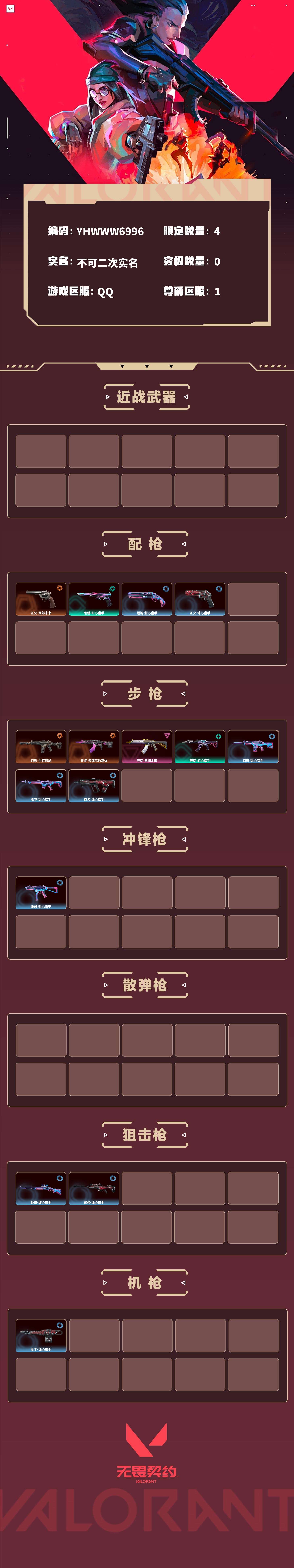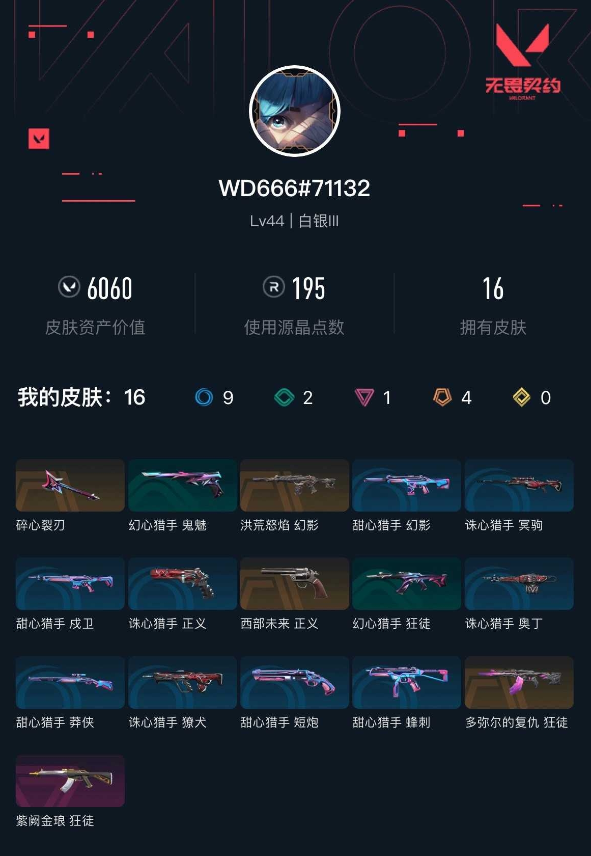 【无畏契约】【yhwww6996】等级:44,已用无畏点6060,已用源晶点195,橙皮:幻影-洪荒怒焰|正义-西部未来|狂徒-多弥尔的复仇__紫皮:狂徒-紫阙金琅__段位:白银__英雄:尚勃勒|维斯|斯凯|暮蝶|霓虹|壹决|k/o|幽影|夜露|炼狱|贤者|猎枭|芮娜|捷风|不死鸟|幻棱|禁灭__蓝皮:蜂刺-甜心猎手|短炮-甜心猎手|莽侠-甜心猎手|幻影-甜心猎手|戍卫-甜心猎手|正义-诛心猎手|冥驹-诛心猎手|獠犬-诛心猎手|奥丁-诛心猎手__绿皮:狂徒-幻心猎手|鬼魅-幻心猎手