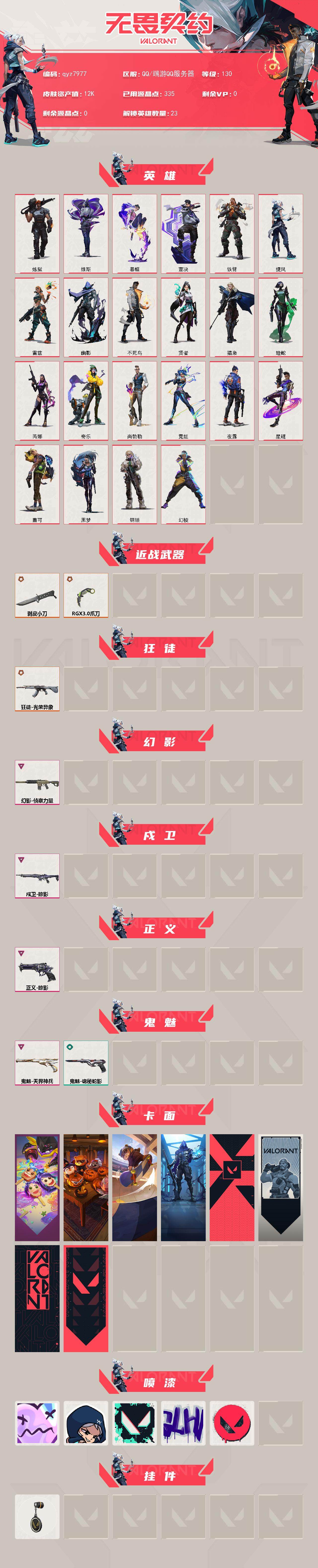 精品小号-rgx爪刀-剥皮小刀-光荣狂徒-侦查幻影-天界鬼魅-qyz7977-近战武器皮肤:-剥皮小刀爪刀-rgx-11z-pro-30-步呛皮肤:-幻影-侦察力量戍卫-掠影狂徒-光荣异象-佩呛皮肤:-鬼魅-天界神兵正义-掠影-亮点:-【qyz7977】【英雄】:幻棱,炼狱,维斯,暮蝶,壹决,铁臂,捷风,雷兹,幽影,不死鸟,贤者,猎枭,蝰蛇,芮娜,奇乐,尚勃勒,霓虹,夜露,星礈,盖可,黑梦,钢锁【近战-武器】:近战武器-剥皮小刀,近战武器-rgx-11z-pro//30-爪刀【狂徒】:狂徒-光荣异象【幻影】:幻影-侦察力量【戍卫】:戍卫-掠影【正义】:正义-掠影【鬼魅】:鬼魅-天界神兵,鬼魅-诡秘蛇影【卡面】:瓦娃脸雪糕-p2-卡面,南瓜盛典-卡面,clutch-卡面,暗呛-卡面,代号红色-卡面,新兵报到-卡面,v契约-卡面,无畏契约-卡面【喷漆】:伤心心-喷漆,捷风差距-喷漆,胜利属于无畏契约-喷漆,glhf-喷漆,无畏契约-喷漆【挂饰】:无畏契约-纪念币-挂饰