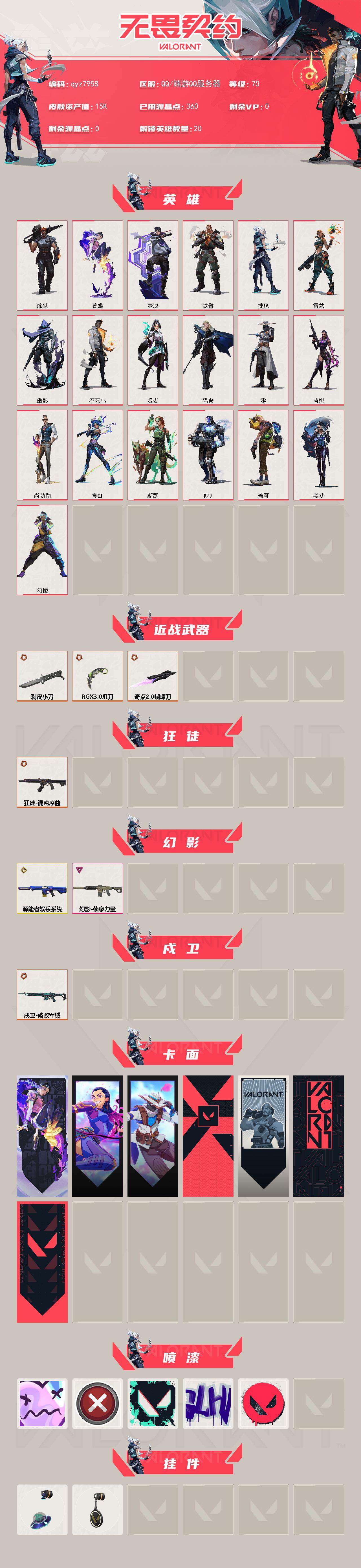 精品小号-混沌狂徒-侦查幻影-源能者幻影-配rgx爪刀剥皮小刀奇点蝴蝶刀-qyz7958-lv70-黄金i,-刀皮数量4,呛皮数量17-绝版0限定6终极1卓越1-;皮肤资产价值15500,已用r点360;【刀皮】:近战武器-显卡30爪刀,近战武器-剥皮小刀,近战武器-奇点20蝴蝶刀,近战武器-碎心裂刃;-【呛皮】:狂徒-混沌序曲,戍卫-破败军械,幻影-源能者娱乐系统,幻影-侦察力量,标配-星际猎兵,狂徒-幻心猎手,鬼魅-幻心猎手,标配-阿特拉斯指挥部,幻影-甜心猎手,戍卫-甜心猎手,獠犬-诛心猎手,冥驹-诛心猎手,莽侠-甜心猎手,正义-诛心猎手,短炮-甜心猎手,蜂刺-甜心猎手,奥丁-诛心猎手;【热门喷漆】:买装还是存钱喷漆;详情看图【皮肤可能含有某些特权皮肤,具体以游戏内实际拥有为准】