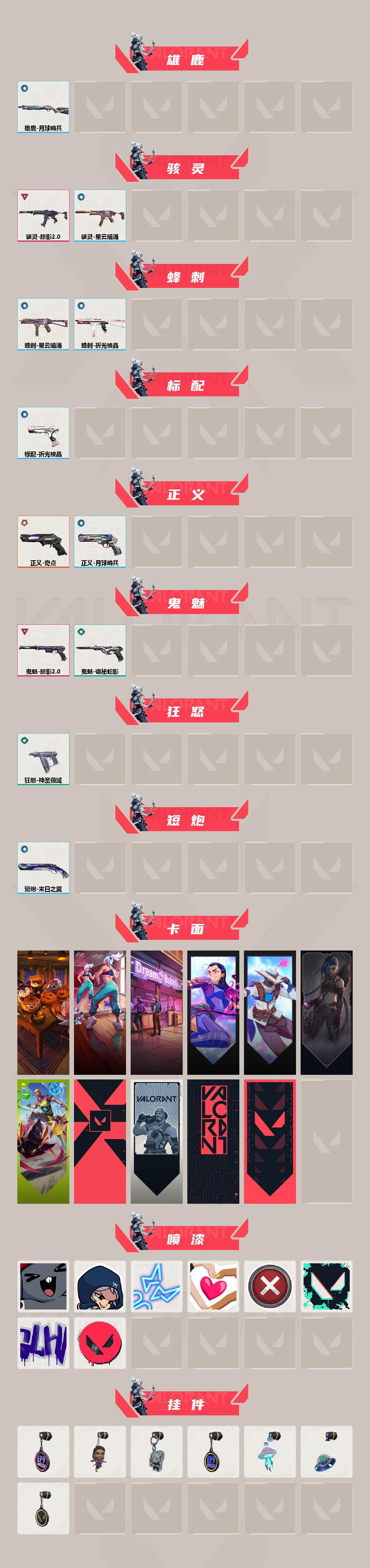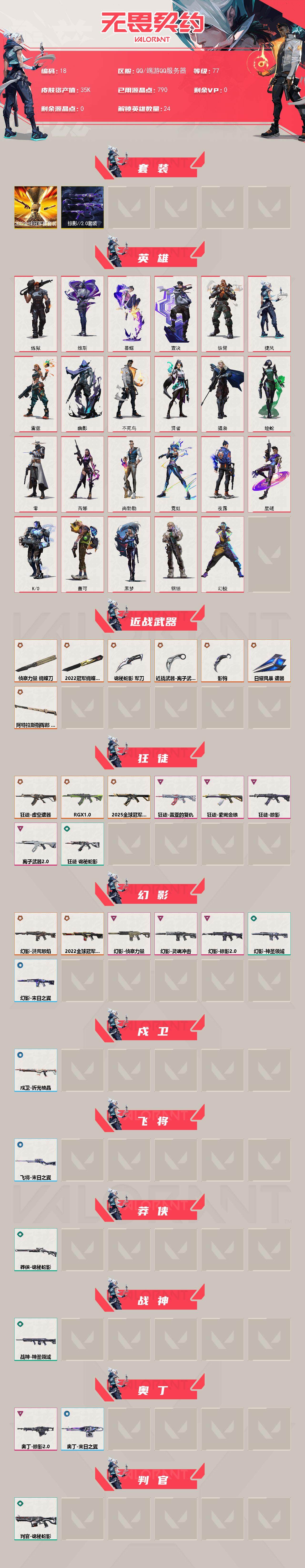 [14500048]【套装】:2022全球冠军赛套装,掠影//2.0套装 【英雄】:幻棱,炼狱,维斯,暮蝶,壹决,铁臂,捷风,雷兹,幽影,不死鸟,贤者,猎枭,蝰蛇,零,芮娜,尚勃勒,霓虹,夜露,星礈,k/o,盖可,黑梦,钢锁 【近战 武器】:近战武器-2022全球冠军赛 蝴蝶刀,近战武器-影钩,近战武器-侦察力量 蝴蝶刀,近战武器-离子武器//2.0 爪刀,近战武器-诡秘蛇影 军刀,近战武器-日耀风暴 遗器,近战武器-阿特拉斯指挥部 甩棍 【狂徒】:狂徒-2025全球冠军赛,狂徒-虚空遗器,狂徒-rgx 11z pro,狂徒-掠影,狂徒-盖亚的复仇,狂徒-紫阙金琅,狂徒-离子武器//2.0,狂徒-诡秘蛇影 【幻影】:幻影-2022全球冠军赛,幻影-洪荒怒焰,幻影-灵魂冲击,幻影-侦察力量,幻影-掠影//2.0,幻影-神圣领域,幻影-末日之翼 【戍卫】:戍卫-折光棱晶 【飞将】:飞将-末日之翼 【莽侠】:莽侠-诡秘蛇影 【战神】:战神-神圣领域 【奥丁】:奥丁-掠影//2.0,奥丁-末日之翼 【判官】:判官-诡秘蛇影 【雄鹿】:雄鹿-月球哨兵 【骇灵】:骇灵-掠影//2.0,骇灵-星云暗涌 【蜂刺】:蜂刺-星云暗涌,蜂刺-折光棱晶 【标配】:标配-折光棱晶 【正义】:正义-奇点,正义-月球哨兵 【鬼魅】:鬼魅-掠影//2.0,鬼魅-诡秘蛇影 【狂怒】:狂怒-神圣领域 【短炮】:短炮-末日之翼 【卡面】:南瓜盛典 卡面,热舞环节 卡面,梦幻奶茶 卡面,无畏契约go!第一卷:芮娜 卡面,无畏契约go!第一卷:零 卡面,《双城之战》金克丝 卡面,势不可挡//盖可 卡面,代号红色 卡面,新兵报到 卡面,v契约 卡面,无畏契约 卡面 【喷漆】:超级粉丝 喷漆,捷风差距 喷漆,霓光四射 喷漆,双人比心 喷漆,买装还是存钱 喷漆,胜利属于无畏契约 喷漆,glhf 喷漆,无畏契约 喷漆 【挂饰】:第九季//第三幕 纪念币 挂饰,无畏契约go!第一卷 芮娜 挂饰,袖珍捷风 挂饰,第九季//第一幕 纪念币 挂饰,深海水母 挂饰,天外飞客 挂饰,无畏契约 纪念币 挂饰