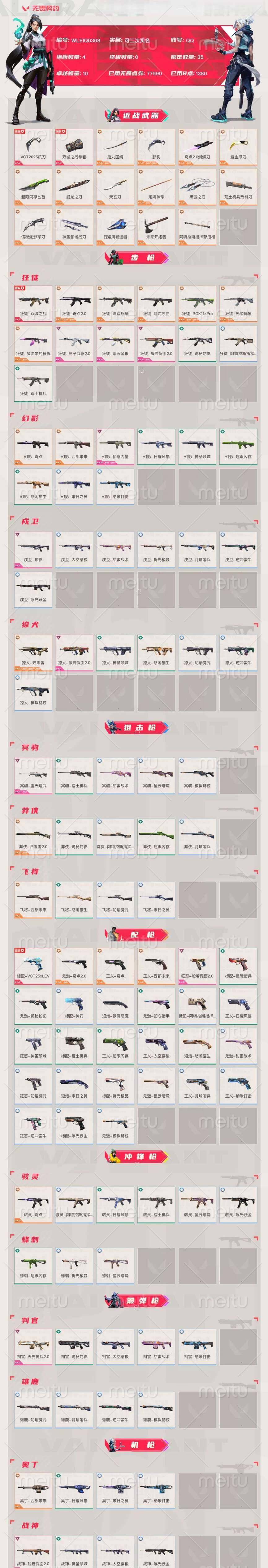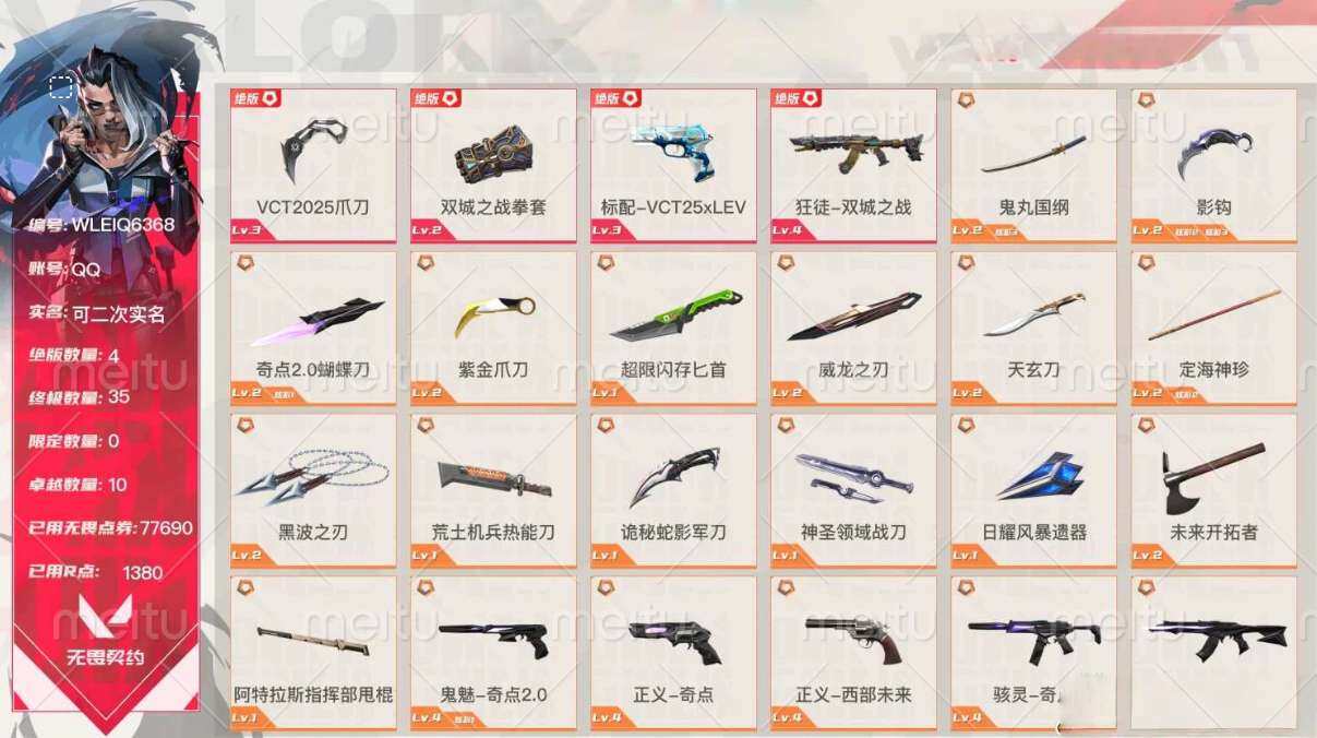 [14501367]k1210/可二次/官服【营地id:020040107/资产:77690】【套装】:vct 2025 赛季套装,西部未来套装,《双城之战》收藏套装,奇点//2.0套装,回火礼包:奇点套装,般若假面//2.0套装 【近战 武器】:近战武器-影钩,近战武器-奇点//2.0 蝴蝶刀,近战武器-vct 2025 爪刀,近战武器-紫金爪刀,近战武器-黑波之刃,近战武器-威龙之刃,近战武器-鬼丸国纲,近战武器-双城之战 拳套,近战武器-未来开拓者,近战武器-超限闪存 匕首,近战武器-定海神珍,近战武器-荒土机兵 热能刀,近战武器-天玄刀,近战武器-诡秘蛇影 军刀,近战武器-神圣领域 战刀,近战武器-日耀风暴 遗器,近战武器-阿特拉斯指挥部 甩棍 【狂徒】:狂徒-洪荒怒焰,狂徒-混沌序曲,狂徒-奇点//2.0,狂徒-双城之战,狂徒-rgx 11z pro,狂徒-光荣异象,狂徒-多弥尔的复仇,狂徒-般若假面//2.0,狂徒-紫阙金琅,狂徒-离子武器//2.0,狂徒-荒土机兵,狂徒-诡秘蛇影 【幻影】:幻影-奇点,幻影-西部未来,幻影-侦察力量,幻影-超限闪存,幻影-神圣领域,幻影-纳米打击,幻影-末日之翼, 【正义】:正义-奇点,正义-西部未来,正义-超限闪存,正义-纳米打击,正义-月球哨兵 鬼魅】:鬼魅-奇点//2.0,鬼魅-诡秘蛇影,鬼魅-模拟赫兹,鬼魅-星云暗涌 【狂怒】:狂怒-般若假面//2.0,狂怒-神圣领域,狂怒-逆冲蛮牛 【短炮】:短炮-梦魇恶魔,短炮-末日之翼 /详情看图