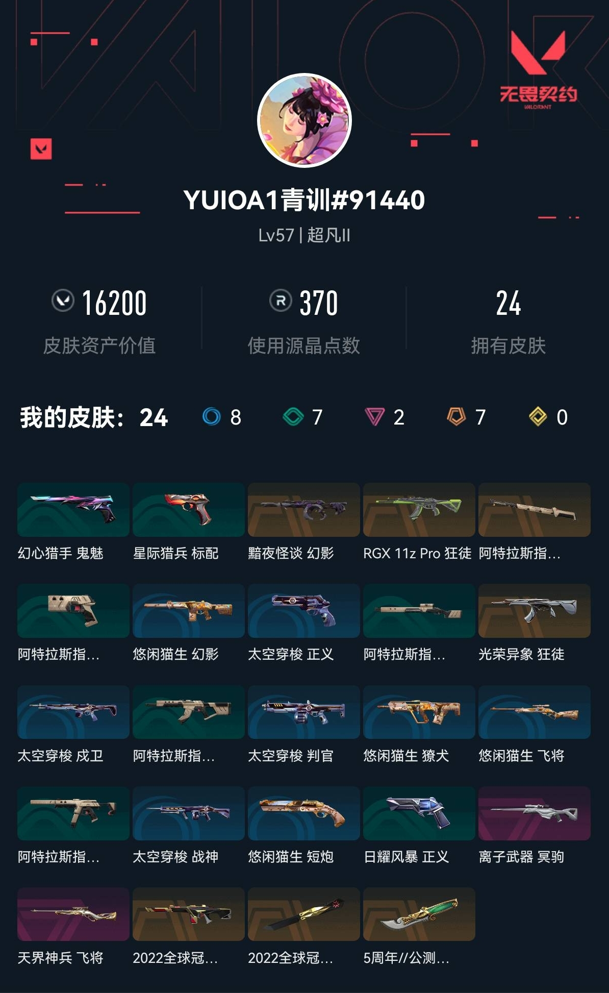 【无畏契约】【yhwww7040】等级:57,已用无畏点16200,已用源晶点370,橙皮:幻影-黯夜怪谈|近战-5周年公测重制版 苍龙之刃|狂徒-光荣异象|狂徒-rgx 11z pro|近战-2022全球冠军赛 蝴蝶刀|幻影-2022全球冠军赛|近战-阿特拉斯指挥部 甩棍__紫皮:飞将-天界神兵|冥驹-离子武器__段位:超凡__绿皮:正义-日耀风暴|短炮-悠闲猫生|飞将-悠闲猫生|幻影-悠闲猫生|獠犬-悠闲猫生|标配-星际猎兵|鬼魅-幻心猎手__蓝皮:正义-太空穿梭|战神-太空穿梭|判官-太空穿梭|戍卫-太空穿梭|骇灵-阿特拉斯指挥部|莽侠-阿特拉斯指挥部|标配-阿特拉斯指挥部|狂徒-阿特拉斯指挥部__英雄:黑梦|暮蝶|盖可|夜露|钢锁|炼狱|贤者|猎枭|芮娜|零|捷风|不死鸟|幻棱|雷兹|禁灭