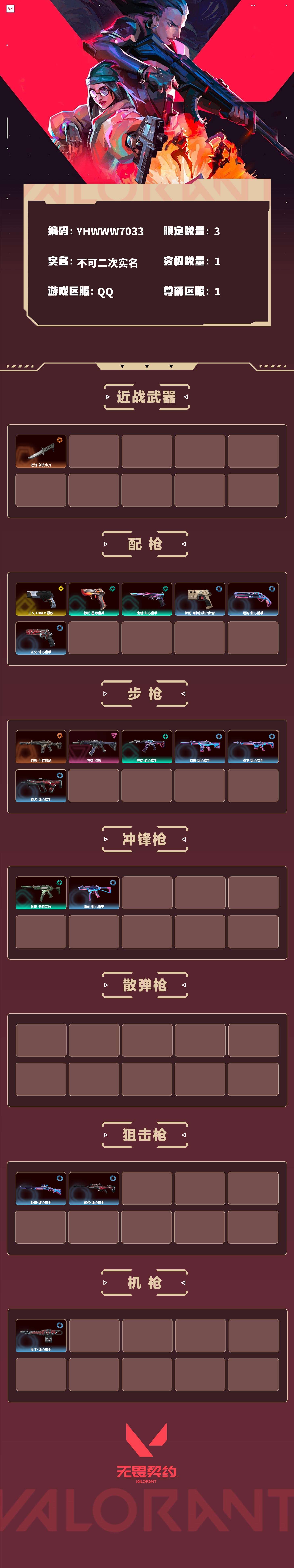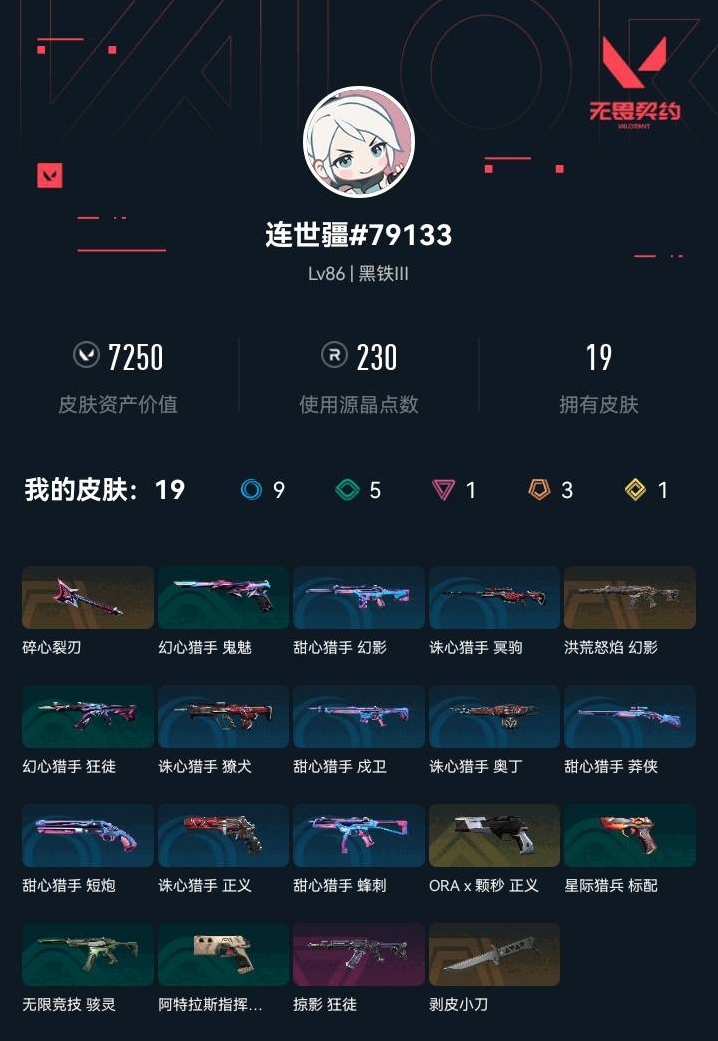 【无畏契约】【yhwww7033】等级:86,已用无畏点7250,已用源晶点230,橙皮:幻影-洪荒怒焰|近战-剥皮小刀__段位:黑铁__绿皮:骇灵-无限竞技|标配-星际猎兵|狂徒-幻心猎手|鬼魅-幻心猎手__紫皮:狂徒-掠影__蓝皮:标配-阿特拉斯指挥部|蜂刺-甜心猎手|短炮-甜心猎手|莽侠-甜心猎手|幻影-甜心猎手|戍卫-甜心猎手|正义-诛心猎手|冥驹-诛心猎手|獠犬-诛心猎手|奥丁-诛心猎手__英雄:尚勃勒|维斯|黑梦|斯凯|暮蝶|盖可|霓虹|壹决|k/o|幽影|夜露|钢锁|海神|炼狱|铁臂|贤者|猎枭|钛狐|芮娜|零|捷风|不死鸟|幻棱|雷兹|禁灭__金皮:正义-a x 颗秒