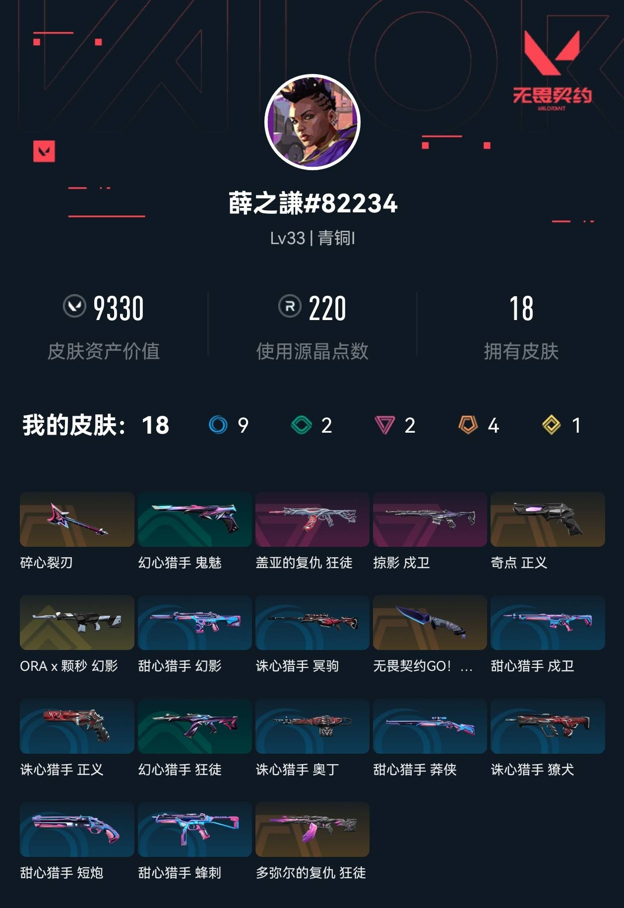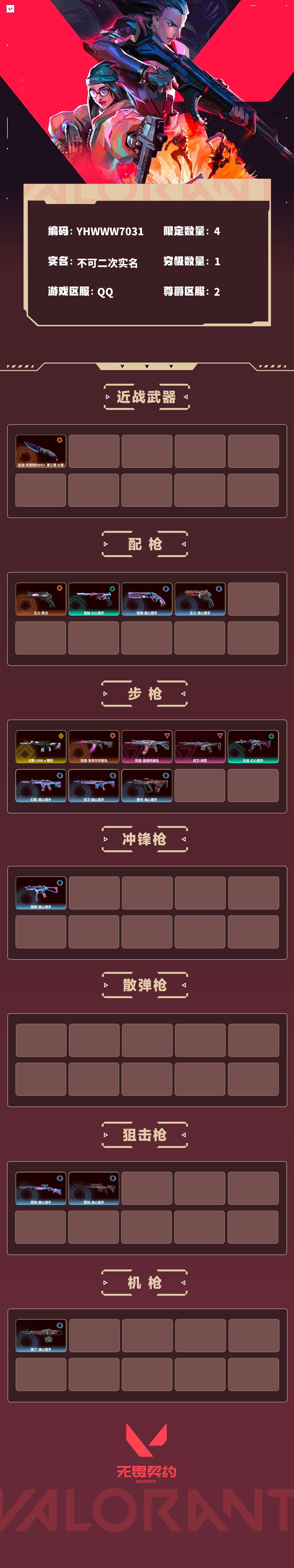 【无畏契约】【yhwww7031】等级:33,已用无畏点9330,已用源晶点220,橙皮:正义-奇点|近战-无畏契约go!第三卷 匕首|狂徒-多弥尔的复仇__紫皮:狂徒-盖亚的复仇|戍卫-掠影__段位:青铜__英雄:尚勃勒|暮蝶|盖可|壹决|炼狱|铁臂|贤者|猎枭|芮娜|捷风|不死鸟|禁灭__蓝皮:蜂刺-甜心猎手|短炮-甜心猎手|莽侠-甜心猎手|幻影-甜心猎手|戍卫-甜心猎手|正义-诛心猎手|冥驹-诛心猎手|獠犬-诛心猎手|奥丁-诛心猎手__绿皮:狂徒-幻心猎手|鬼魅-幻心猎手__金皮:幻影-a x 颗秒