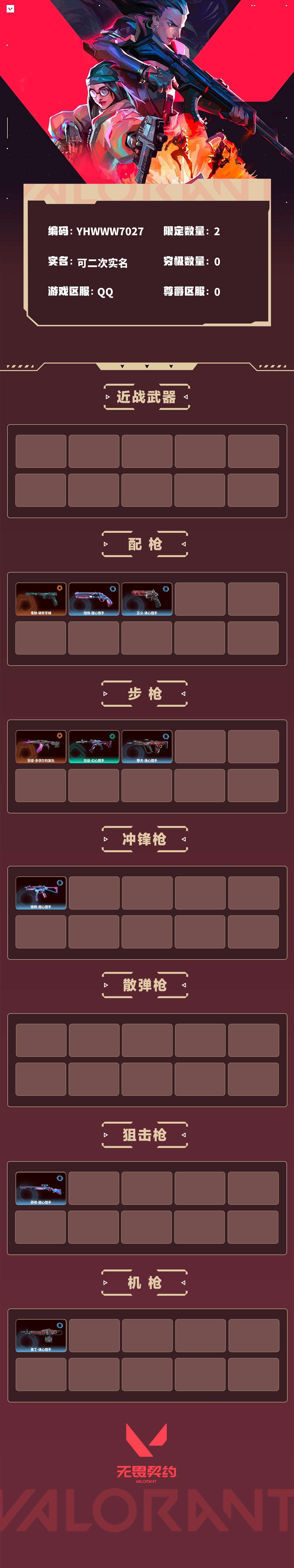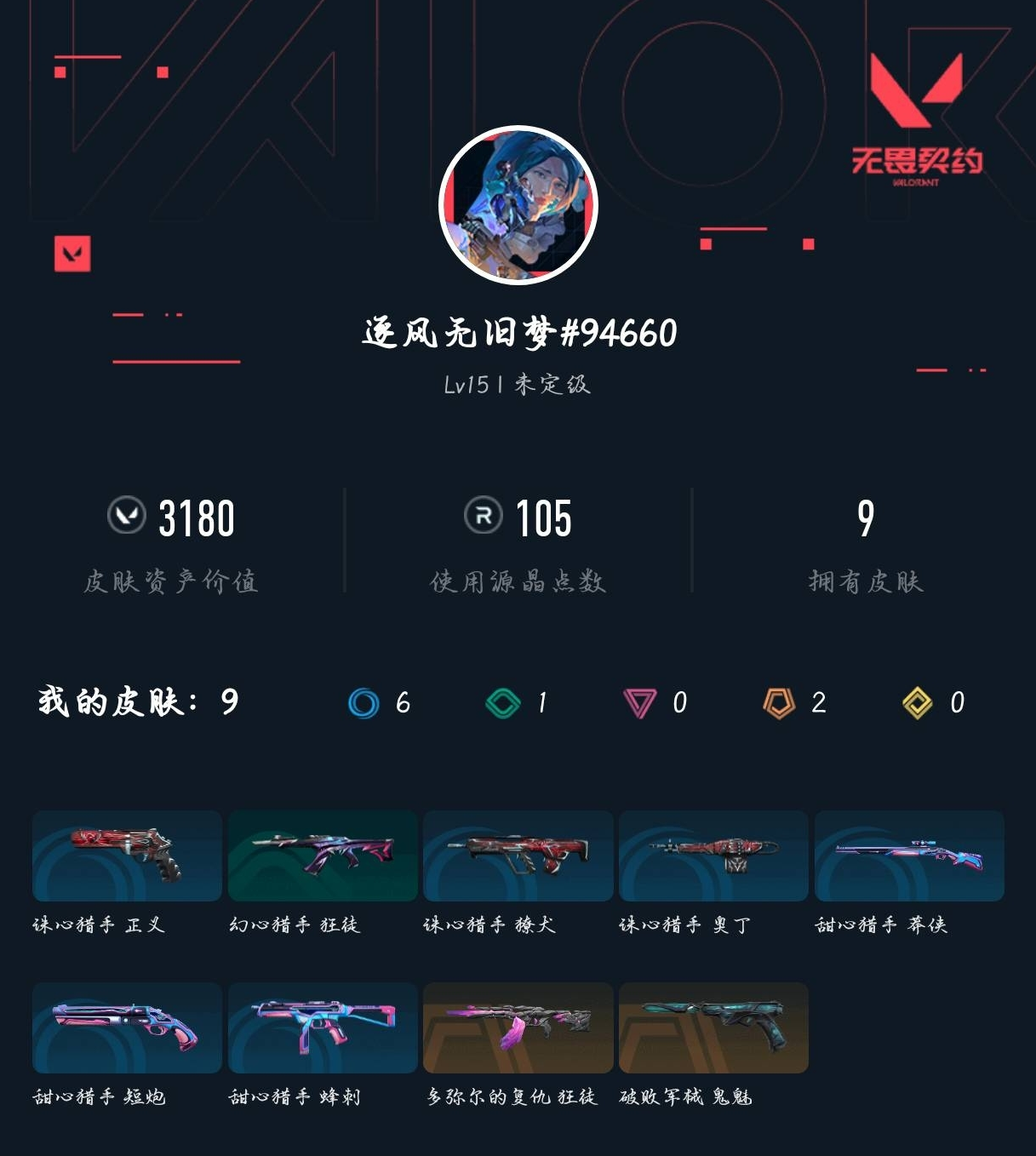 【无畏契约】【yhwww7027】等级:15,已用无畏点3180,已用源晶点105,橙皮:鬼魅-破败军械|狂徒-多弥尔的复仇__段位:未定级__英雄:尚勃勒|暮蝶|炼狱|贤者|猎枭|捷风|不死鸟|禁灭__蓝皮:蜂刺-甜心猎手|短炮-甜心猎手|莽侠-甜心猎手|正义-诛心猎手|獠犬-诛心猎手|奥丁-诛心猎手__绿皮:狂徒-幻心猎手