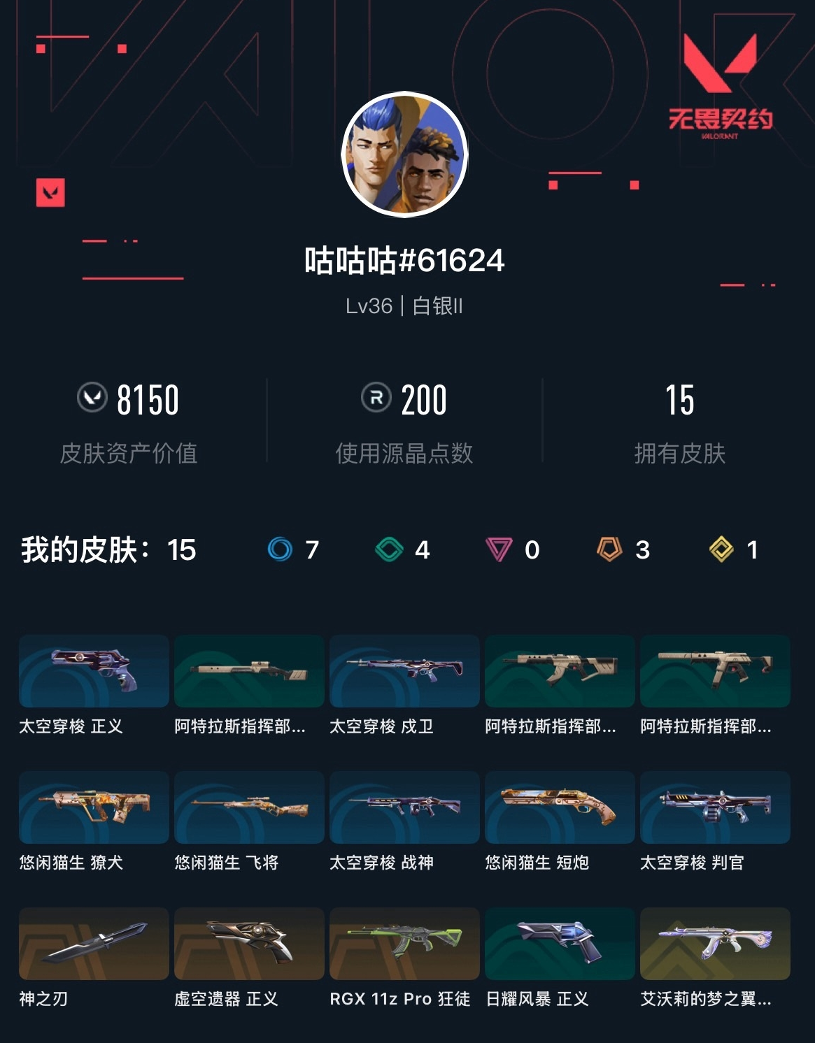 【无畏契约】【yhwww7011】等级:36,已用无畏点8150,已用源晶点200,金皮:狂徒-艾沃莉的梦之翼__段位:白银__橙皮:正义-虚空遗器|近战-神之刃|狂徒-rgx 11z pro__绿皮:正义-日耀风暴|短炮-悠闲猫生|飞将-悠闲猫生|獠犬-悠闲猫生__蓝皮:正义-太空穿梭|战神-太空穿梭|判官-太空穿梭|戍卫-太空穿梭|骇灵-阿特拉斯指挥部|莽侠-阿特拉斯指挥部|狂徒-阿特拉斯指挥部__英雄:尚勃勒|暮蝶|盖可|霓虹|壹决|奇乐|炼狱|贤者|猎枭|芮娜|零|捷风|不死鸟