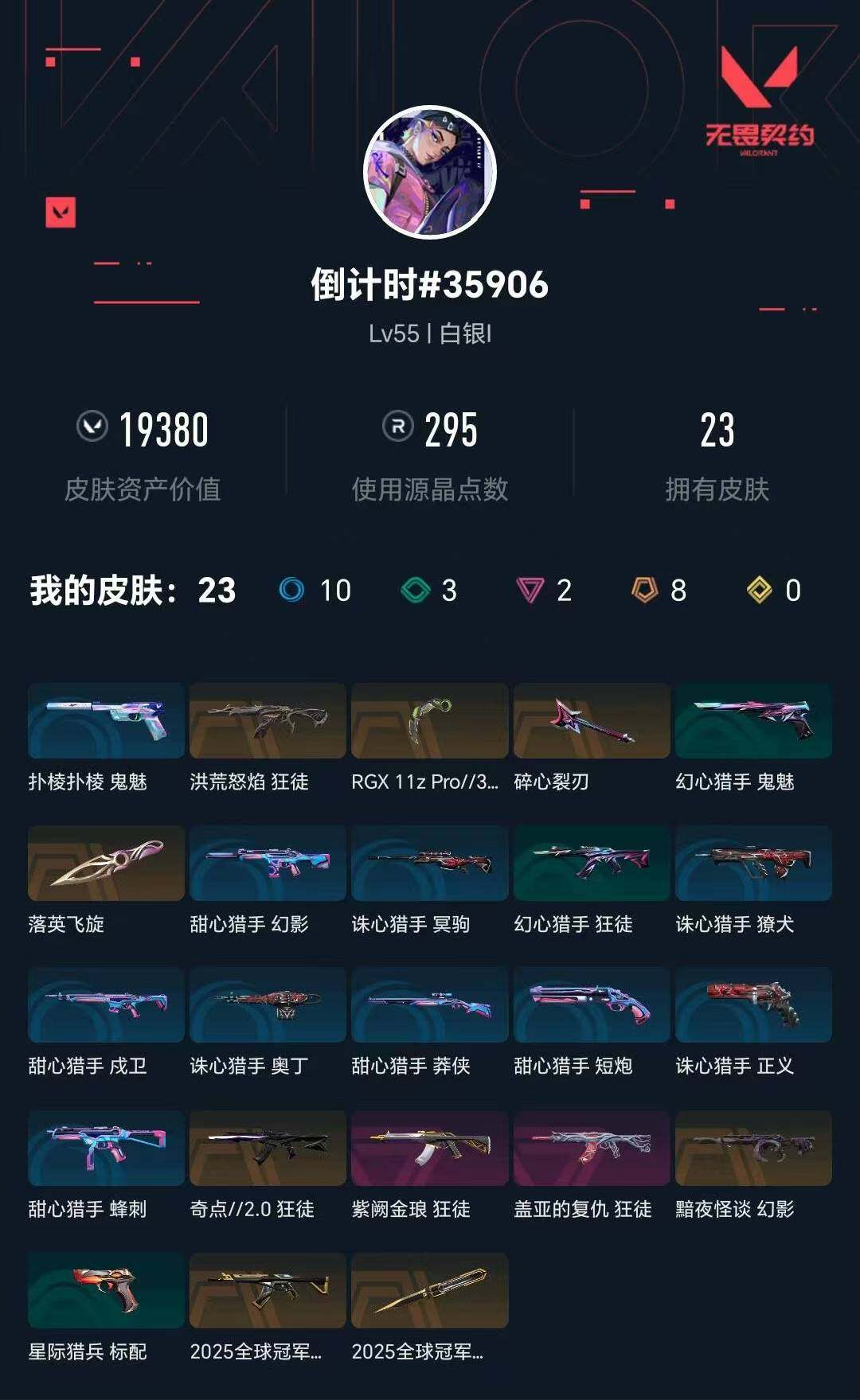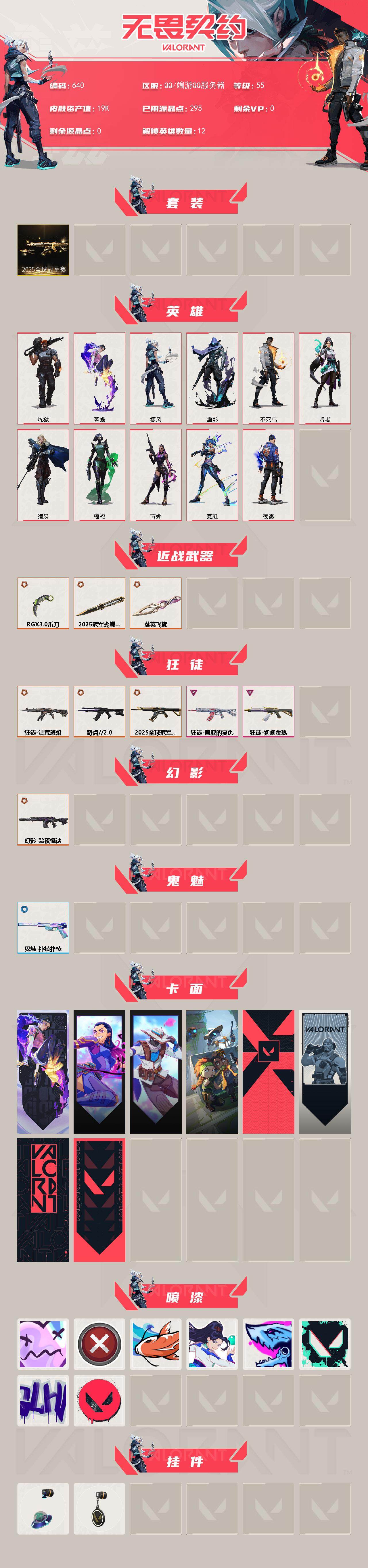 [14503801]【套装】:2025全球冠军赛套装 【英雄】:炼狱,暮蝶,捷风,幽影,不死鸟,贤者,猎枭,蝰蛇,芮娜,霓虹,夜露 【近战 武器】:近战武器-2025全球冠军赛 蝴蝶刀,近战武器-rgx 11z pro//3.0 爪刀,近战武器-落英飞旋 【狂徒】:狂徒-2025全球冠军赛,狂徒-洪荒怒焰,狂徒-奇点//2.0,狂徒-盖亚的复仇,狂徒-紫阙金琅 【幻影】:幻影-黯夜怪谈 【鬼魅】:鬼魅-扑棱扑棱 【卡面】:无畏契约:暮蝶 卡面,无畏契约go!第一卷:芮娜 卡面,无畏契约go!第一卷:零 卡面,别冒尖 卡面,代号红色 卡面,新兵报到 卡面,v契约 卡面,无畏契约 卡面 【喷漆】:伤心心 喷漆,买装还是存钱 喷漆,红鳞 喷漆,无畏契约go!第一卷:贤者 喷漆,暴走萝莉 喷漆,胜利属于无畏契约 喷漆,glhf 喷漆,无畏契约 喷漆 【挂饰】:天外飞客 挂饰,无畏契约 纪念币 挂饰