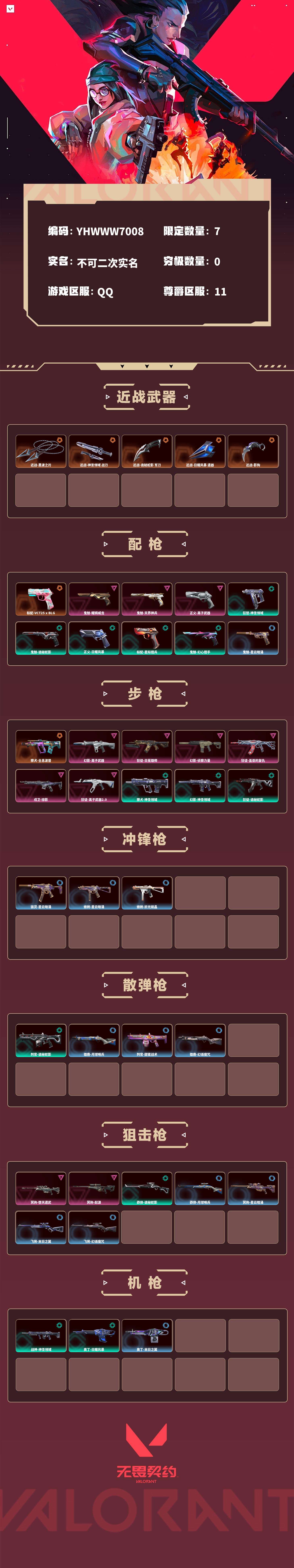 【无畏契约】【yhwww7008】等级:153,已用无畏点24330,已用源晶点630,橙皮:近战-黑波之刃|獠犬-全息波普|近战-神圣领域 战刀|标配-vct25 x blg|近战-诡秘蛇影 军刀|近战-日耀风暴 遗器|近战-影钩__紫皮:鬼魅-耀鳞威龙|鬼魅-天界神兵|幻影-离子武器|狂徒-日冕雄师|幻影-侦察力量|狂徒-盖亚的复仇|冥驹-堕天遗武|冥驹-起源|正义-离子武器|戍卫-掠影|狂徒-离子武器2.0__段位:超凡__蓝皮:鬼魅-星云暗涌|骇灵-星云暗涌|正义-月球哨兵|莽侠-月球哨兵|戍卫-月球哨兵|雄鹿-月球哨兵|冥驹-星云暗涌|蜂刺-星云暗涌|蜂刺-折光棱晶|戍卫-折光棱晶|标配-折光棱晶|飞将-末日之翼|幻影-末日之翼|短炮-末日之翼|奥丁-末日之翼|鬼魅-甜蜜战术|判官-甜蜜战术|戍卫-甜蜜战术|雄鹿-幻语魔咒|獠犬-幻语魔咒|飞将-幻语魔咒|狂怒-幻语魔咒|标配-阿特拉斯指挥部__绿皮:獠犬-神圣领域|狂怒-神圣领域|战神-神圣领域|幻影-神圣领域|判官-诡秘蛇影|鬼魅-诡秘蛇影|莽侠-诡秘蛇影|狂徒-诡秘蛇影|正义-日耀风暴|幻影-日耀风暴|奥丁-日耀风暴|标配-星际猎兵|鬼魅-幻心猎手__英雄:尚勃勒|维斯|暮蝶|盖可|霓虹|壹决|幽影|奇乐|炼狱|铁臂|贤者|猎枭|钛狐|芮娜|捷风|不死鸟|幻棱|禁灭
