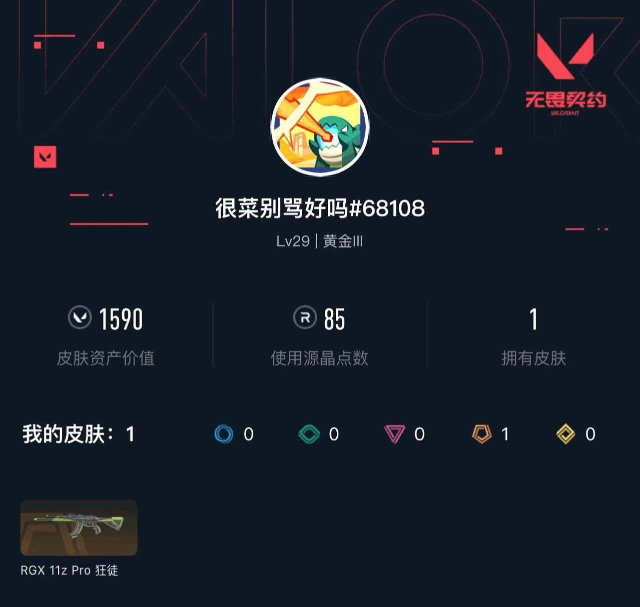 [14504065]【英雄】:炼狱,暮蝶,捷风,不死鸟,贤者,猎枭,芮娜,尚勃勒,盖可 【狂徒】:狂徒-rgx 11z pro 【卡面】:代号红色 卡面,新兵报到 卡面,v契约 卡面,无畏契约 卡面 【喷漆】:胜利属于无畏契约 喷漆,glhf 喷漆,无畏契约 喷漆 【挂饰】:无畏契约 纪念币 挂饰