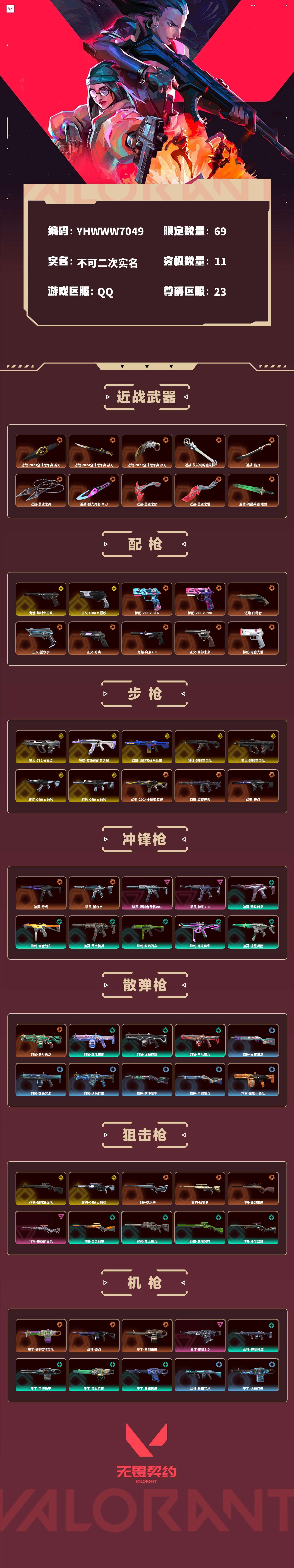 【无畏契约】【yhwww7049】等级:233,已用无畏点181340,已用源晶点2665,金皮:獠犬-781-a协议|狂徒-艾沃莉的梦之翼|幻影-源能者娱乐系统|狂徒-超时空卫队|獠犬-超时空卫队|莽侠-超时空卫队|鬼魅-超时空卫队|狂徒-a x 颗秒|幻影-a x 颗秒|冥驹-a x 颗秒|正义-a x 颗秒__橙皮:奥丁-砰砰x特攻队|标配-vct x blg|标配-vct x prx|骇灵-奇点|短炮-归零者|飞将-塑水宗|幻影-2024全球冠军赛|幻影-黯夜怪谈|近战-2023全球冠军赛 苦无|近战-2024全球冠军赛 战刀|幻影-奇点|近战-2021全球冠军赛 爪刀|骇灵-塑水宗|近战-艾沃莉的魔法棒|近战-祜刀|近战-黑波之刃|近战-弧光异彩 军刀|近战-盖亚之怒|近战-盖亚之愠|近战-流星兵团 短剑|近战-巨神铁甲 短剑|近战-魄月玄刃|近战-生物收割器|近战-珍珠棘贝 短剑|近战-紫金爪刀|獠犬-全息波普|近战-奇点 军刀|狂徒-归零者|狂徒-2021全球冠军赛|狂徒-塑水宗|狂徒-洪荒怒焰|獠犬-归零者|狂徒-混沌序曲|狂徒-2023全球冠军赛|正义-塑水宗|正义-奇点|冥驹-归零者|战神-奇点|判官-偃月苍龙|近战-合金战车 军刀|狂徒-奇点2.0|鬼魅-奇点2.0|近战-奇点2.0 蝴蝶刀|近战-荒土机兵 热能刀|近战-鬼丸国纲|近战-神圣领域 战刀|飞将-西部未来|正义-西部未来|奥丁-西部未来|幻影-西部未来|近战-未来开拓者|近战-诡秘蛇影 军刀|戍卫-电音光谱|獠犬-电音光谱|标配-电音光谱|幻影-电音光谱|近战-谐波音谱|近战-日耀风暴 遗器|狂徒-rgx 11z pro|近战-2022全球冠军赛 蝴蝶刀|幻影-2022全球冠军赛|近战-阿特拉斯指挥部 甩棍|近战-超时空卫队 三棱军刺|近战-星际猎兵 短剑|狂徒-2025全球冠军赛|近战-2025全球冠军赛 蝴蝶刀|近战-影钩|近战-a x 颗秒 军刀__紫皮:标配-堕天遗武|标配-紫阙金琅|飞将-盖亚的复仇|鬼魅-盖亚的复仇|标配-源能者危机001|骇灵-源能者危机001|鬼魅-天界神兵|幻影-般若假面|幻影-盖亚的复仇2.0|幻影-源能者危机001|幻影-侦察力量|狂徒-盖亚的复仇|狂怒-天界神兵2.0|狂徒-堕天遗武|獠犬-冰点凝冻|獠犬-日冕雄师|狂徒-紫阙金琅|戍卫-盖亚的复仇|正义-离子武器|骇灵-掠影2.0|奥丁-掠影2.0|鬼魅-掠影2.0|幻影-掠影2.0__绿皮:短炮-钢轨卫士|骇灵-珍珠棘贝|幻影-珍珠棘贝|狂怒-钢轨卫士|狂怒-珍珠棘贝|戍卫-钢轨卫士|戍卫-珍珠棘贝|蜂刺-合金战车|正义-合金战车|幻影-合金战车|飞将-合金战车|狂徒-荒土机兵|标配-荒土机兵|骇灵-荒土机兵|冥驹-荒土机兵|獠犬-神圣领域|狂怒-神圣领域|战神-神圣领域|幻影-神圣领域|幻影-巨神铁甲|奥丁-巨神铁甲|狂怒-巨神铁甲|狂徒-巨神铁甲|戍卫-超能偶像|狂徒-超能偶像|判官-超能偶像|莽侠-超限闪存|蜂刺-超限闪存|短炮-弧光异彩|獠犬-弧光异彩|蜂刺-弧光异彩|狂徒-弧光异彩|骇灵-流星兵团|鬼魅-流星兵团|狂徒-流星兵团|奥丁-流星兵团|飞将-沙尘幻旅|骇灵-沙尘幻旅|幻影-噬源兽防卫工程|判官-诡秘蛇影|鬼魅-诡秘蛇影|莽侠-诡秘蛇影|狂徒-诡秘蛇影|正义-日耀风暴|幻影-日耀风暴|奥丁-日耀风暴|短炮-悠闲猫生|飞将-悠闲猫生|幻影-悠闲猫生|獠犬-悠闲猫生|判官-星际猎兵|飞将-星际猎兵|标配-星际猎兵|狂徒-幻心猎手|鬼魅-幻心猎手__蓝皮:飞将-光导纤维|标配-光导纤维|骇灵-光导纤维|獠犬-复古浪潮|冥驹-复古浪潮|雄鹿-复古浪潮|正义-复古浪潮|标配-杀毒执行|标配-最终庇护|短炮-好搭档|狂怒-猛袭|狂怒-花漾粉红|骇灵-花漾粉红|戍卫-花漾粉红|冥驹-花漾粉红|战神-数码咒术|獠犬-数码咒术|判官-数码咒术|鬼魅-数码咒术|正义-戍卫者|判官-纳米打击|正义-纳米打击|奥丁-纳米打击|幻影-纳米打击|雄鹿-逆冲蛮牛|狂怒-逆冲蛮牛|戍卫-逆冲蛮牛|獠犬-逆冲蛮牛|鬼魅-星云暗涌|骇灵-星云暗涌|正义-月球哨兵|莽侠-月球哨兵|戍卫-月球哨兵|雄鹿-月球哨兵|鬼魅-采蜜小蜂队|战神-采蜜小蜂队|獠犬-采蜜小蜂队|判官-采蜜小蜂队|戍卫-彩梦之城|雄鹿-彩梦之城|标配-彩梦之城|骇灵-浮光跃金|标配-浮光跃金|戍卫-浮光跃金|战神-浮光跃金|鬼魅-胡桃狂想|蜂刺-胡桃狂想|冥驹-胡桃狂想|蜂刺-聚合之力|狂怒-聚合之力|飞将-聚合之力|狂怒-萌彩剪影|判官-萌彩剪影|鬼魅-模拟赫兹|獠犬-模拟赫兹|冥驹-模拟赫兹|雄鹿-模拟赫兹|战神-深海水族|短炮-深海水族|蜂刺-深海水族|莽侠-深海水族|莽侠-纤云弄巧|正义-纤云弄巧|短炮-纤云弄巧|蜂刺-纤云弄巧|鬼魅-信手涂鸦|骇灵-信手涂鸦|奥丁-信手涂鸦|飞将-信手涂鸦|冥驹-星云暗涌|蜂刺-星云暗涌|蜂刺-战术小伙伴|幻影-战术小伙伴|獠犬-战术小伙伴|奥丁-战术小伙伴|飞将-战术熊与伙伴们|狂怒-战术熊与伙伴们|戍卫-战术熊与伙伴们|标配-战术熊与伙伴们|蜂刺-折光棱晶|戍卫-折光棱晶|标配-折光棱晶|飞将-末日之翼|幻影-末日之翼|短炮-末日之翼|奥丁-末日之翼|鬼魅-甜蜜战术|判官-甜蜜战术|戍卫-甜蜜战术|雄鹿-幻语魔咒|獠犬-幻语魔咒|飞将-幻语魔咒|狂怒-幻语魔咒|正义-太空穿梭|战神-太空穿梭|判官-太空穿梭|戍卫-太空穿梭|骇灵-阿特拉斯指挥部|莽侠-阿特拉斯指挥部|标配-阿特拉斯指挥部|狂徒-阿特拉斯指挥部|狂怒-光环序列|戍卫-光环序列|冥驹-光环序列|战神-光环序列|狂徒-瑰梦艺语|鬼魅-瑰梦艺语|骇灵-瑰梦艺语|雄鹿-瑰梦艺语|蜂刺-甜心猎手|短炮-甜心猎手|莽侠-甜心猎手|幻影-甜心猎手|戍卫-甜心猎手|正义-诛心猎手|冥驹-诛心猎手|獠犬-诛心猎手|奥丁-诛心猎手__段位:黄金__英雄:尚勃勒|维斯|黑梦|斯凯|暮