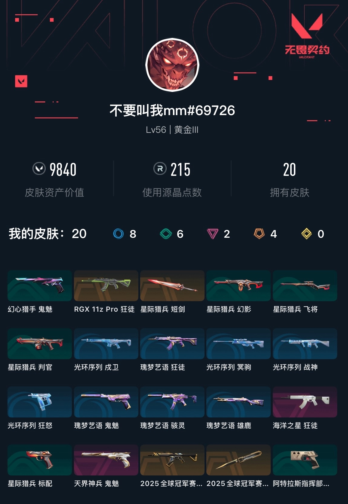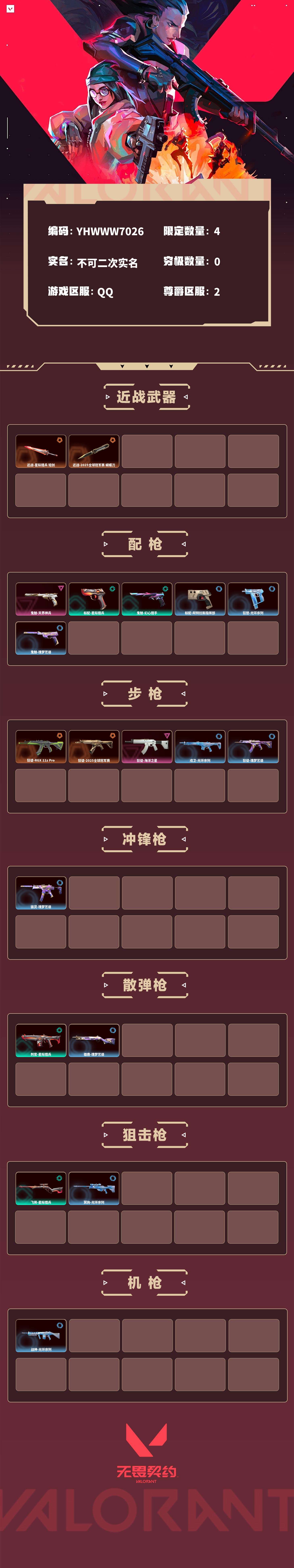 【无畏契约】【yhwww7026】等级:56,已用无畏点9840,已用源晶点215,紫皮:鬼魅-天界神兵|狂徒-海洋之星__段位:黄金__橙皮:狂徒-rgx 11z pro|近战-星际猎兵 短剑|狂徒-2025全球冠军赛|近战-2025全球冠军赛 蝴蝶刀__蓝皮:标配-阿特拉斯指挥部|狂怒-光环序列|戍卫-光环序列|冥驹-光环序列|战神-光环序列|狂徒-瑰梦艺语|鬼魅-瑰梦艺语|骇灵-瑰梦艺语|雄鹿-瑰梦艺语__绿皮:判官-星际猎兵|飞将-星际猎兵|标配-星际猎兵|鬼魅-幻心猎手__英雄:尚勃勒|暮蝶|海神|炼狱|贤者|猎枭|芮娜|捷风|不死鸟|禁灭