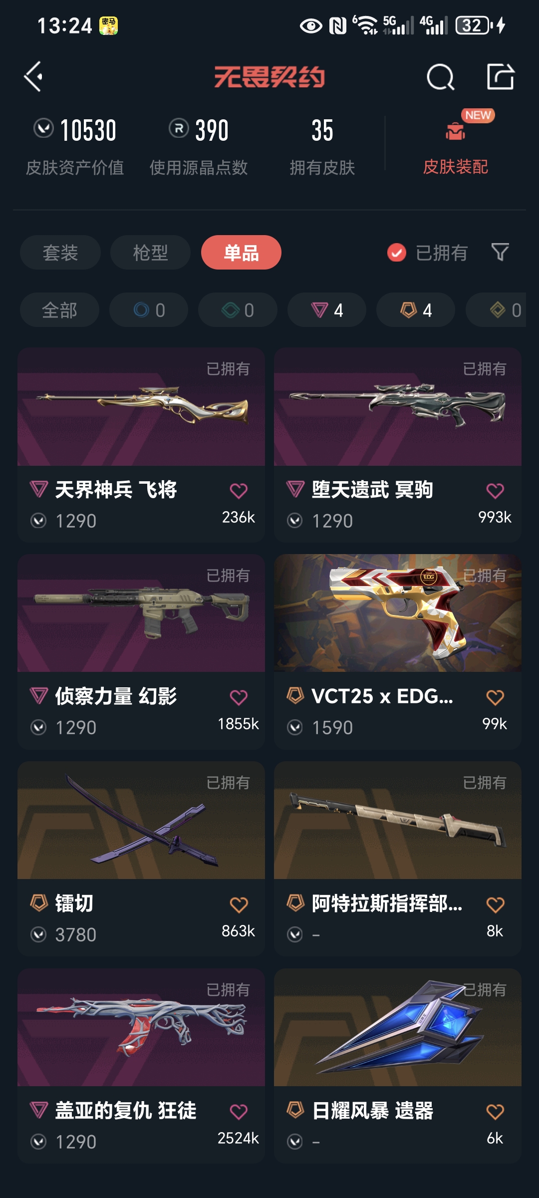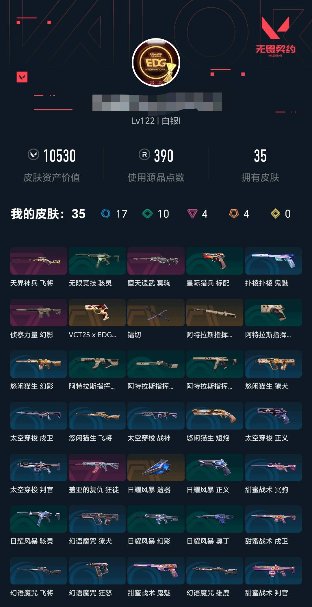 【游戏等级】lv122 【段位】 白银i 【r点】390 【皮肤总价值】10530 【英雄数量】21 【皮肤数量】35 【挂饰数量】45 【卡面数量】61 【喷漆数量】50 【飞将】飞将-天界神兵 飞将-悠闲猫生 飞将-幻语魔咒 【骇灵】骇灵-无限竞技 骇灵-阿特拉斯指挥部 骇灵-日耀风暴 【冥驹】冥驹-堕天遗武 冥驹-甜蜜战术 【标配】标配-星际猎兵 标配-vct25xe