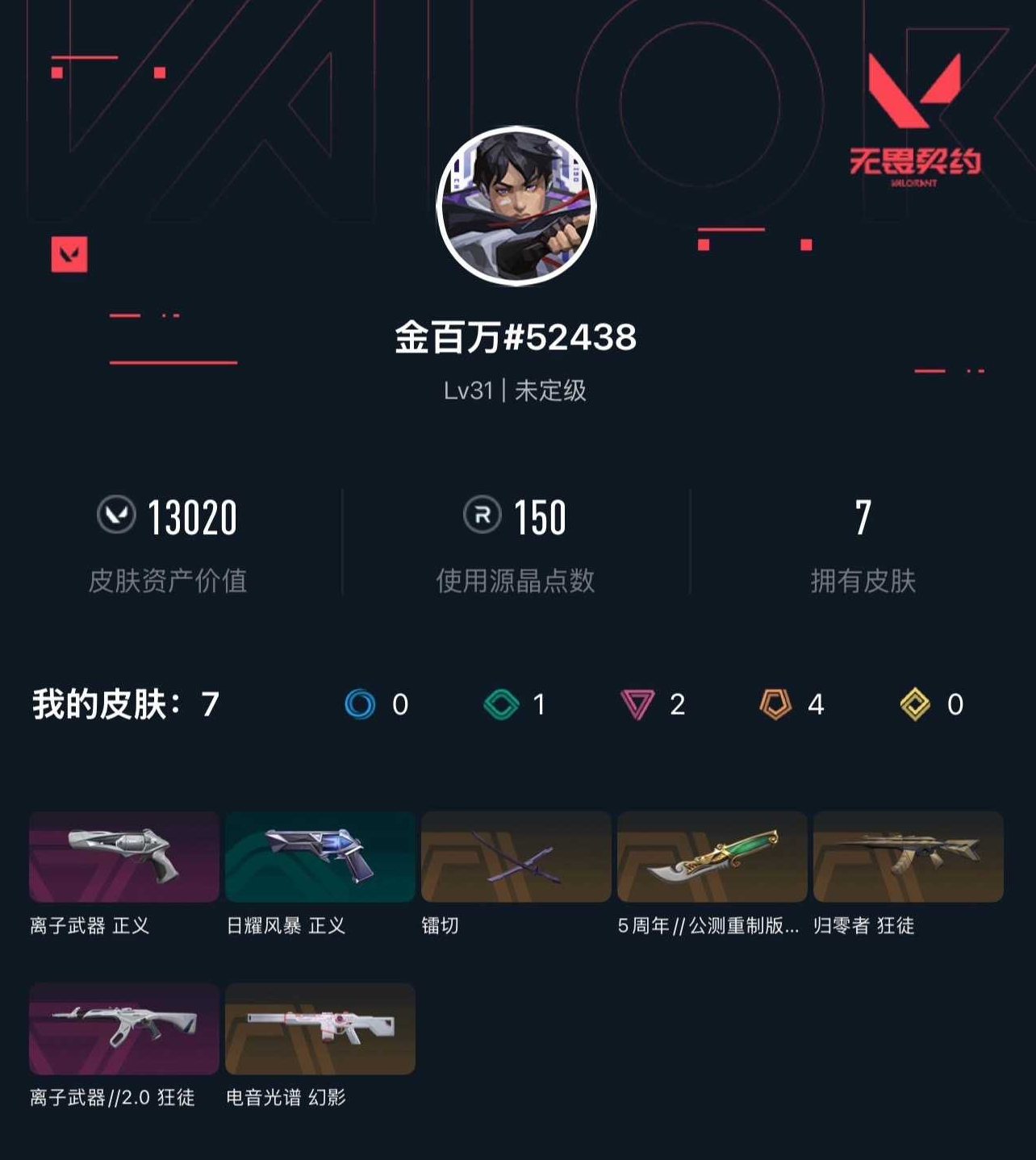 【无畏契约】【yhwww7050】等级:31,已用无畏点13020,已用源晶点150,橙皮:狂徒-归零者|近战-镭切|幻影-电音光谱|近战-5周年公测重制版 苍龙之刃__紫皮:正义-离子武器|狂徒-离子武器2.0__段位:未定级__绿皮:正义-日耀风暴__英雄:尚勃勒|暮蝶|壹决|炼狱|贤者|猎枭|芮娜|捷风|不死鸟