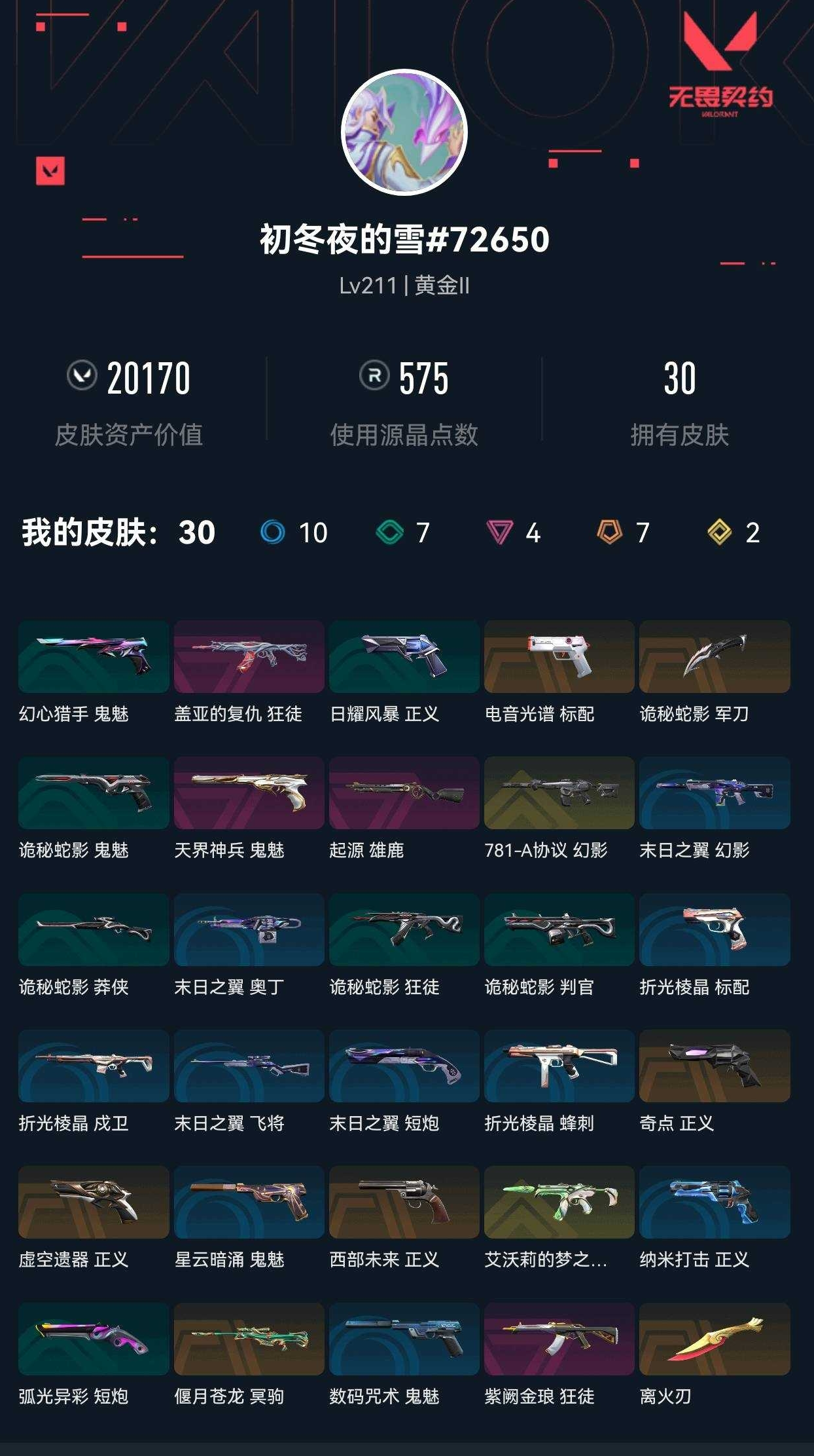 【无畏契约】【yhwww7055】等级:211,已用无畏点20170,已用源晶点575,金皮:幻影-781-a协议|骇灵-艾沃莉的梦之翼__橙皮:近战-离火刃|正义-奇点|冥驹-偃月苍龙|正义-西部未来|正义-虚空遗器|近战-诡秘蛇影 军刀|标配-电音光谱__紫皮:鬼魅-天界神兵|狂徒-盖亚的复仇|狂徒-紫阙金琅|雄鹿-起源__段位:黄金__蓝皮:鬼魅-数码咒术|正义-纳米打击|鬼魅-星云暗涌|蜂刺-折光棱晶|戍卫-折光棱晶|标配-折光棱晶|飞将-末日之翼|幻影-末日之翼|短炮-末日之翼|奥丁-末日之翼__绿皮:短炮-弧光异彩|判官-诡秘蛇影|鬼魅-诡秘蛇影|莽侠-诡秘蛇影|狂徒-诡秘蛇影|正义-日耀风暴|鬼魅-幻心猎手__英雄:尚勃勒|维斯|黑梦|斯凯|暮蝶|盖可|霓虹|壹决|星礈|k/o|幽影|夜露|钢锁|海神|奇乐|炼狱|铁臂|贤者|猎枭|钛狐|芮娜|零|捷风|蝰蛇|不死鸟|幻棱|雷兹|禁灭