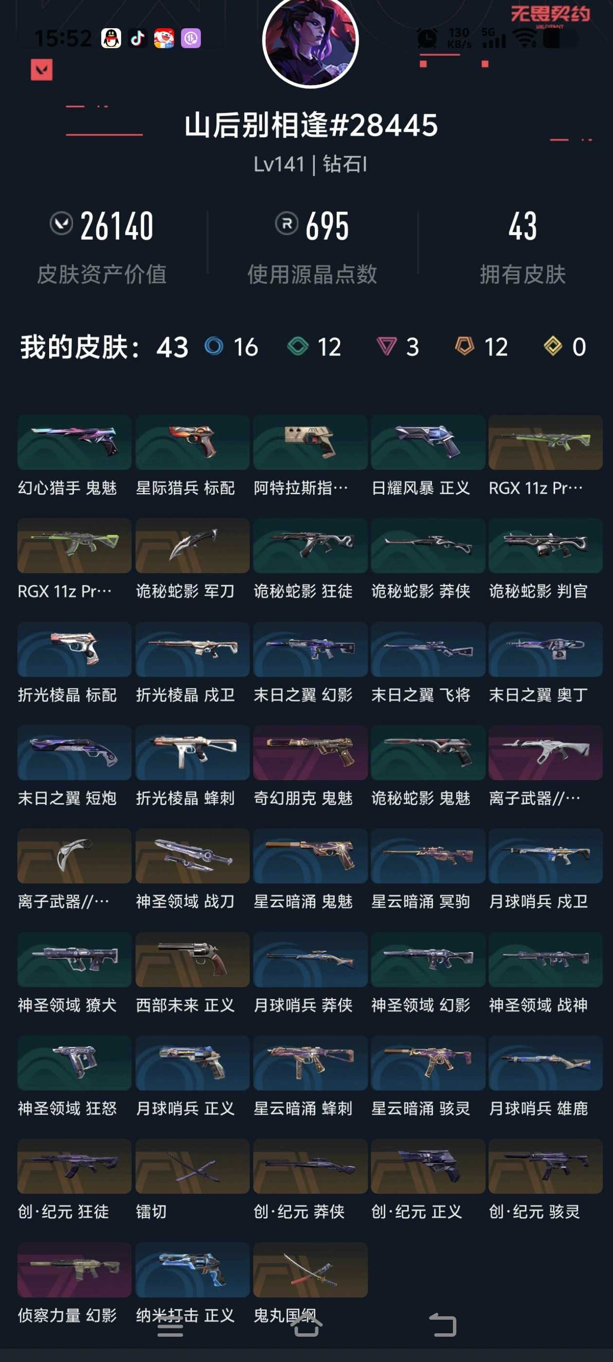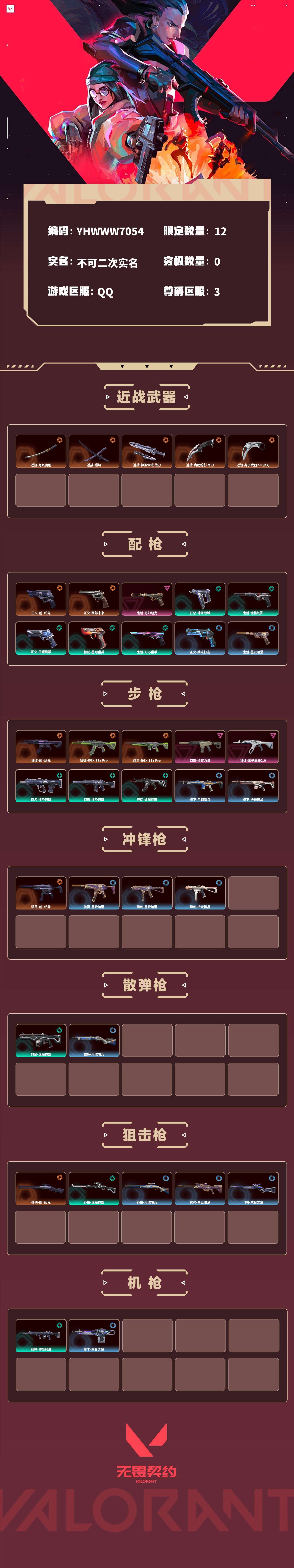 【无畏契约】【yhwww7054】等级:141,已用无畏点26140,已用源晶点695,紫皮:鬼魅-奇幻朋克|幻影-侦察力量|狂徒-离子武器2.0__段位:钻石__蓝皮:正义-纳米打击|鬼魅-星云暗涌|骇灵-星云暗涌|正义-月球哨兵|莽侠-月球哨兵|戍卫-月球哨兵|雄鹿-月球哨兵|冥驹-星云暗涌|蜂刺-星云暗涌|蜂刺-折光棱晶|戍卫-折光棱晶|标配-折光棱晶|飞将-末日之翼|幻影-末日之翼|短炮-末日之翼|奥丁-末日之翼|标配-阿特拉斯指挥部__橙皮:近战-鬼丸国纲|近战-镭切|骇灵-创·纪元|莽侠-创·纪元|狂徒-创·纪元|正义-创·纪元|近战-神圣领域 战刀|正义-西部未来|近战-诡秘蛇影 军刀|近战-离子武器2.0 爪刀|狂徒-rgx 11z pro|戍卫-rgx 11z pro__绿皮:獠犬-神圣领域|狂怒-神圣领域|战神-神圣领域|幻影-神圣领域|判官-诡秘蛇影|鬼魅-诡秘蛇影|莽侠-诡秘蛇影|狂徒-诡秘蛇影|正义-日耀风暴|标配-星际猎兵|鬼魅-幻心猎手__英雄:尚勃勒|维斯|黑梦|斯凯|暮蝶|盖可|霓虹|壹决|k/o|幽影|夜露|钢锁|奇乐|炼狱|铁臂|贤者|猎枭|钛狐|芮娜|零|捷风|蝰蛇|不死鸟|幻棱|雷兹|禁灭
