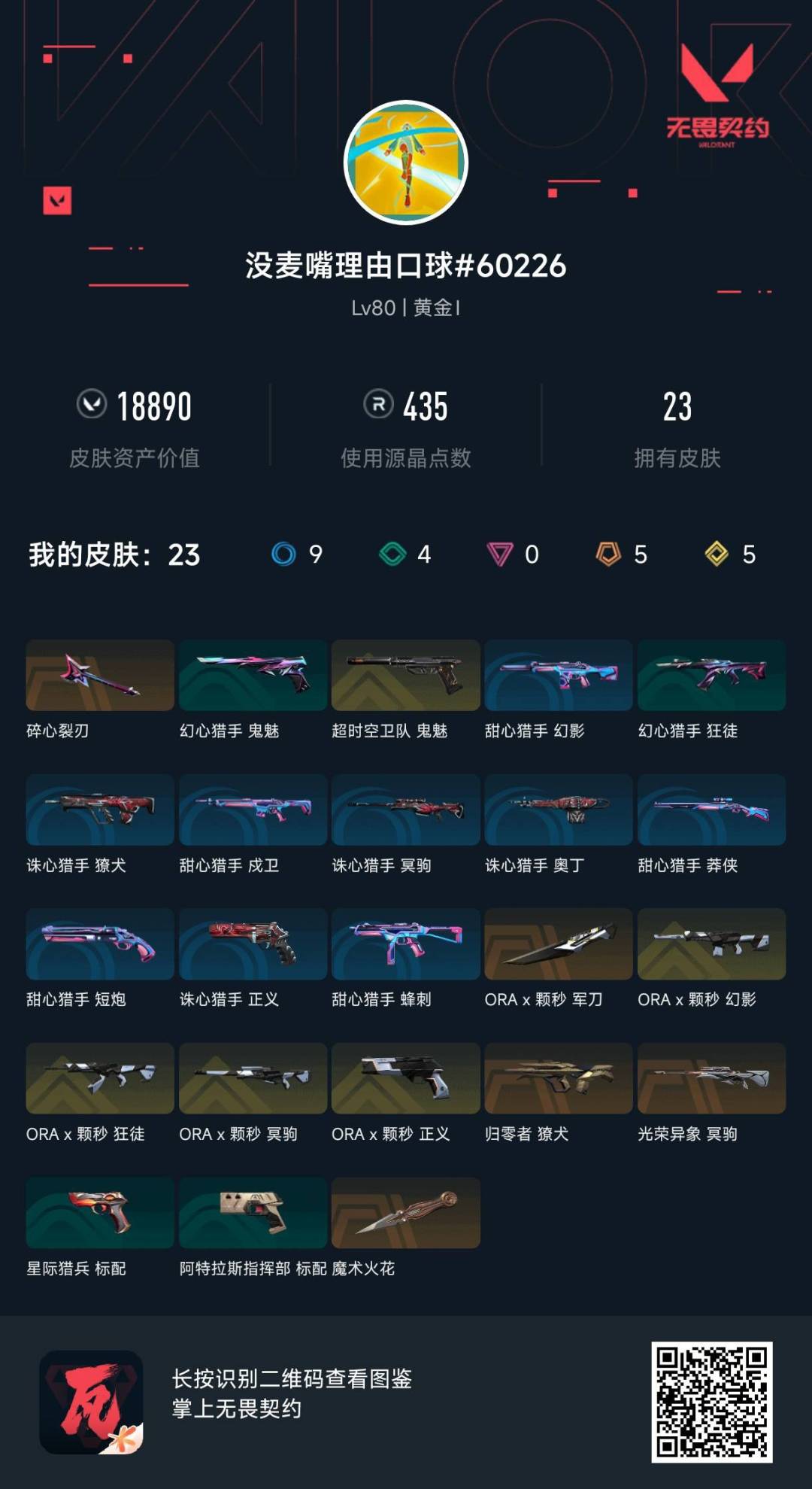 [14525115]5橙皮 5金皮 23皮肤 19英雄 50卡面 435已用源晶 黄金段位 【套装】:ax颗秒 【近战武器皮肤】:ax颗秒 军刀碎心裂刃魔术火花 【佩呛皮肤】:正义-ax颗秒鬼魅-超时空卫队 【步呛皮肤】:狂徒-ax颗秒幻影-ax颗秒獠犬-归零者 【狙击呛皮肤】:冥驹-光荣异象冥驹-ax颗秒 【挂饰】:神中神挂饰ax颗秒挂饰