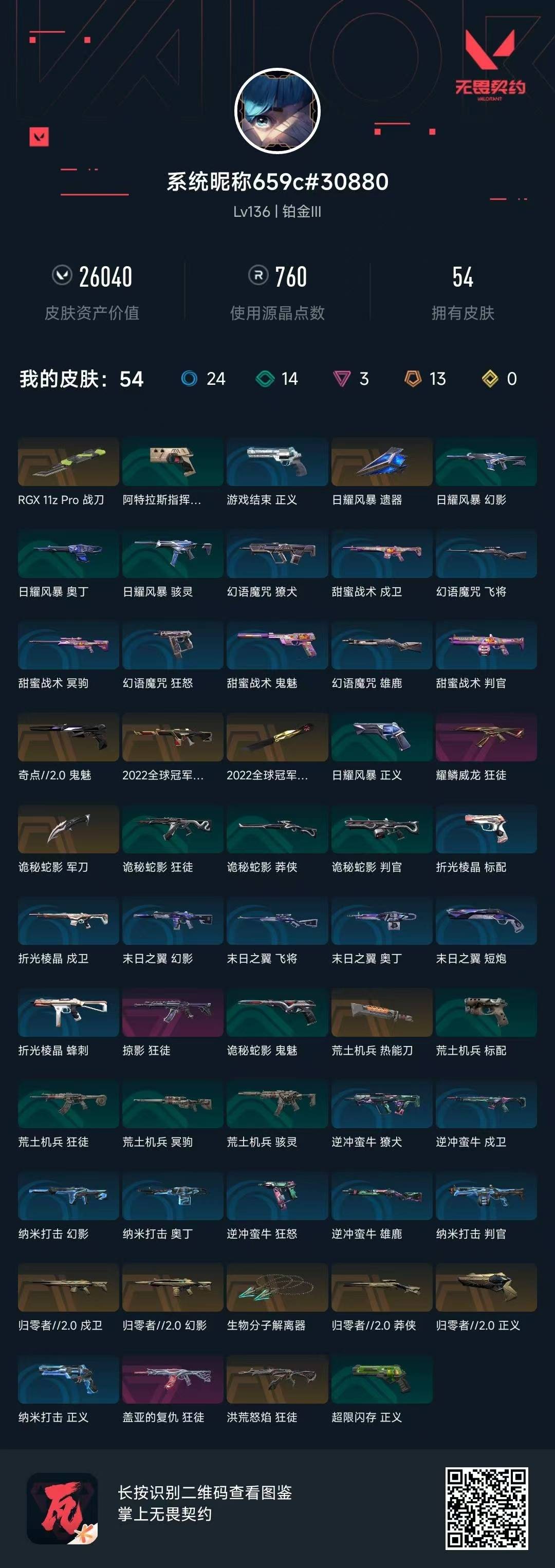 13橙皮 3紫皮 54皮肤 27英雄 79卡面 760已用源晶 未定级段位 【亮点皮肤】:幻影-2022全球冠军赛蝴蝶刀-2022全球冠军赛 【套装】:归零者//2.0套装2022全球冠军赛 【近战武器皮肤】:诡秘蛇影生物分子解离器荒土机兵热能刀rgx 11z pro 战刀 【佩呛皮肤】