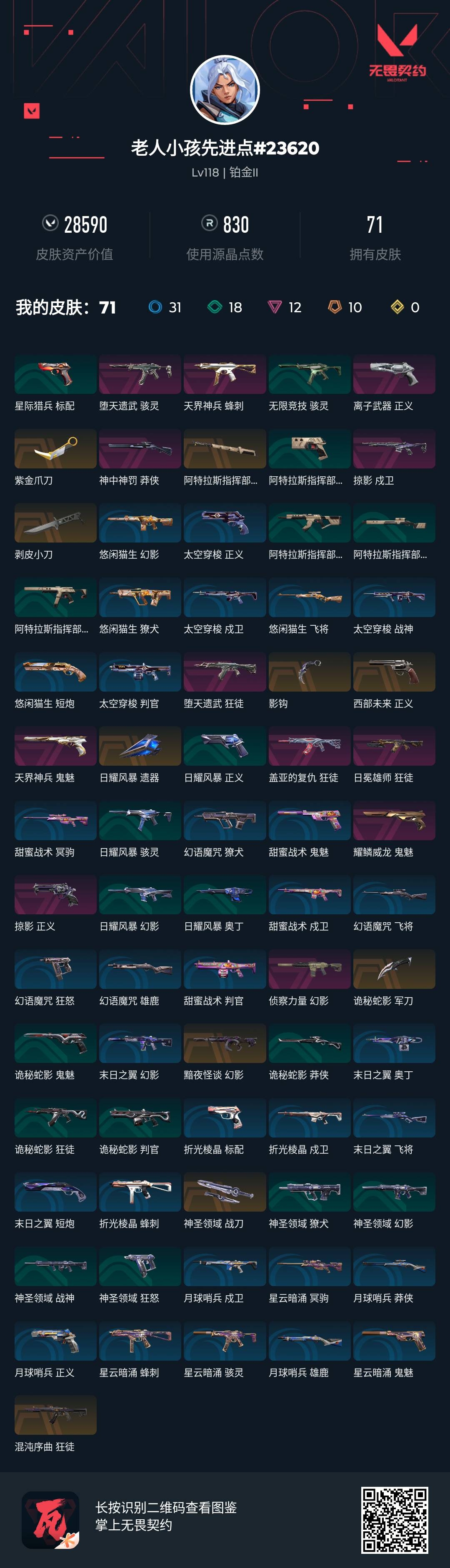 [14526547]q192381 无畏契约/等级118/段位铂金/英雄27/皮肤71/资产28590/已使用r点830/剩余r点125/阿特拉斯指挥部-甩棍,日耀风暴-遗器,诡秘蛇影-军刀,神圣领域-战刀,影钩,紫金爪刀,剥皮小刀,混沌序曲-狂徒,黯夜怪谈-幻影,堕天遗武-狂徒,盖亚的复仇-狂徒,侦察力量-幻影,日冕雄师-狂徒,掠影-戍卫,神中神罚-莽侠,堕天遗武-骇灵,天界神兵-蜂刺,西部未来-正义,天界神兵-鬼魅,耀鳞威龙-鬼魅,离子武器-正义,掠影-正义
