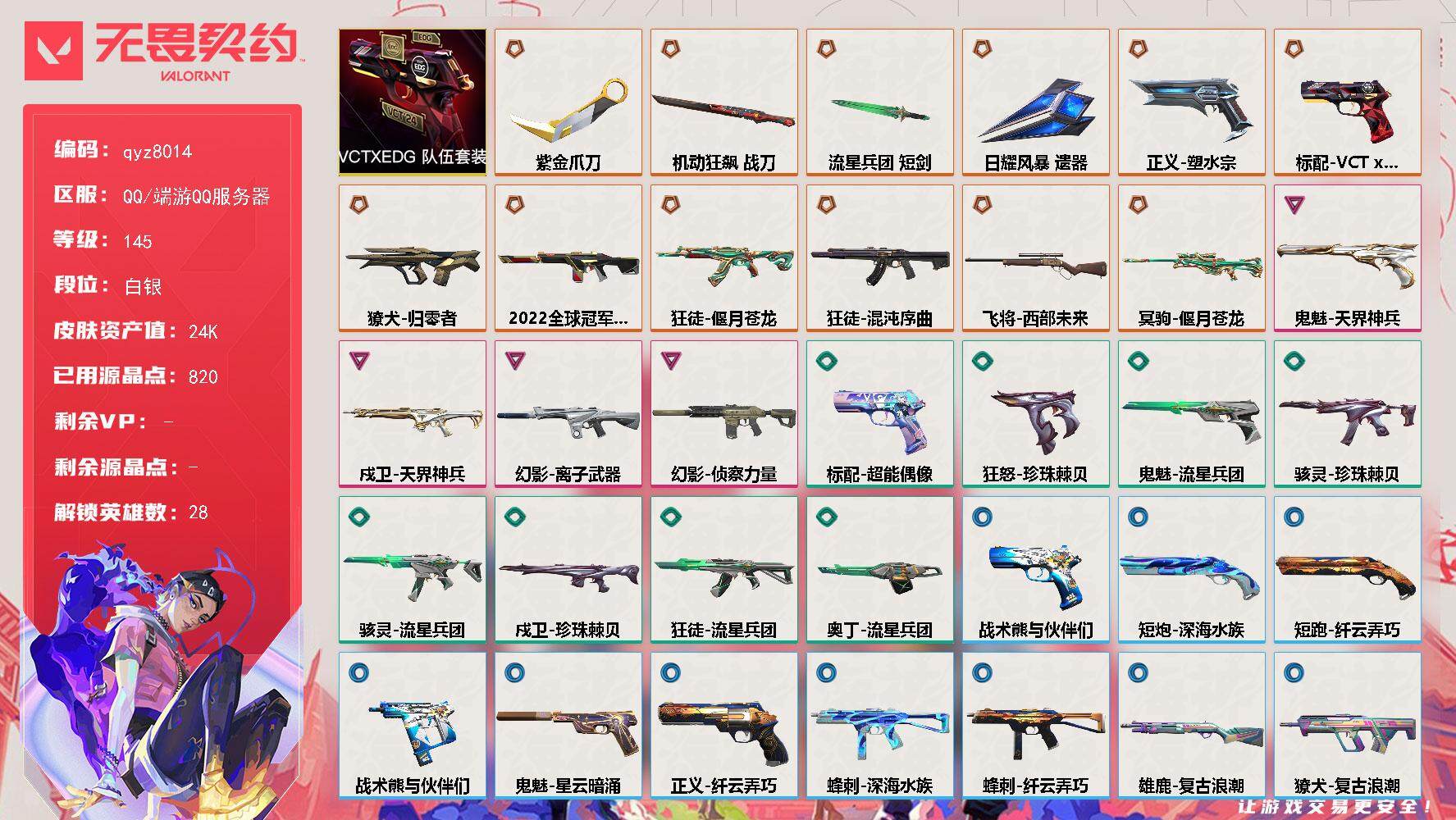 22冠军-紫金爪-混沌ak-qyz8014-亮点皮肤:-幻影-2022全球冠军赛-套装:-vctcn2025套装-近战武器皮肤:-机动狂飙战刀紫金爪刀短剑-流星兵团-步呛皮肤:-狂徒-偃月苍龙幻影-侦察力量獠犬-归零者戍卫-天界神兵幻影-离子武器狂徒-混沌序曲-佩呛皮肤:-鬼魅-天界神兵正义-塑水宗标配-vctxedg-狙击呛皮肤:-冥驹-偃月苍龙飞将-西部未来-亮点:-【qyz8014】【套装】:vctxedg-队伍套装【英雄】:幻棱,炼狱,维斯,暮蝶,钛狐,壹决,铁臂,捷风,雷兹,幽影,不死鸟,贤者,猎枭,蝰蛇,零,芮娜,奇乐,尚勃勒,霓虹,斯凯,夜露,星礈,k/o,海神,盖可,黑梦,钢锁【近战-武器】:近战武器-紫金爪刀,近战武器-流星兵团-短剑,近战武器-机动狂飙-战刀,近战武器-日耀风暴-遗器【狂徒】:狂徒-混沌序曲,狂徒-偃月苍龙,狂徒-流星兵团【幻影】:幻影-2022全球冠军赛,幻影-离子武器,幻影-侦察力量【戍卫】:戍卫-天界神兵,戍卫-珍珠棘贝,戍卫-战术熊与伙伴们【獠犬】:獠犬-归零者,獠犬-复古浪潮【冥驹】:冥驹-偃月苍龙,冥驹-复古浪潮【飞将】:飞将-西部未来,飞将-战术熊与伙伴们【莽侠】:莽侠-深海水族,莽侠-纤云弄巧【战神】:战神-深海水族【奥丁】:奥丁-流星兵团【雄鹿】:雄鹿-复古浪潮【骇灵】:骇灵-流星兵团,骇灵-珍珠棘贝【蜂刺】:蜂刺-深海水族,蜂刺-纤云弄巧【标配】:标配-超能偶像,标配-战术熊与伙伴们【vct手呛】:标配-vct-x-edg【正义】:正义-塑水宗,正义-纤云弄巧【鬼魅】:鬼魅-天界神兵,鬼魅-流星兵团,鬼魅-星云暗涌【狂怒】:狂怒-珍珠棘贝,狂怒-战术熊与伙伴们【短炮】:短炮-深海水族,短炮-纤云弄巧【卡面】:南瓜盛典-卡面,vct-cn首冠-卡面,修车达人-卡面,热舞环节-卡面,正义的化身-卡面,终章:生意人麦宝-卡面,铁之华-卡面,时间到-卡面,最高舞台-卡面,树懒大作战-卡面,声感陷阱设计图-卡面,梦幻奶茶-卡面,终章:打造专属狂徒-卡面,趁热吃-卡面,西装暴徒-卡面,失控边缘-卡面,哨卫者之领域-卡面,暮蝶工牌-卡面,战术熊与伙伴们-卡面,源能反应-卡面,流星兵团-卡面,纤云弄巧-卡面,暂别喧嚣-卡面,打造专属狂徒-卡面,零点嗅探设计图-卡面,脚踝终结者-卡面-,夜班-卡面,瓦娃脸雪糕-卡面-,沙雕爆能器-卡面,无