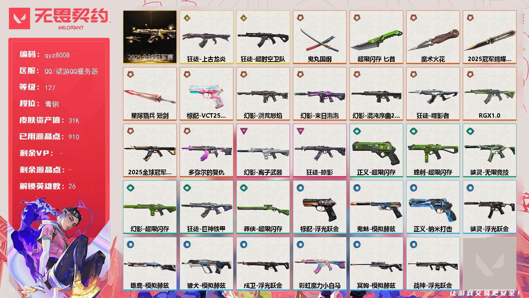 25套装-鬼丸刀-电光蝴蝶-显卡-超时空-多弥尔ak-qyz8008-套装:-2025全球冠军赛-近战武器皮肤:-匕首-超限闪存鬼丸国纲魔术火花2025全球冠军赛-蝴蝶刀-步呛皮肤:-幻影-洪荒怒焰幻影-离子武器狂徒-掠影狂徒-上古龙炎狂徒-噬影者狂徒-rgx-11z-pro狂徒-超时空卫队幻影-末日泡泡2025全球冠军赛-狂徒幻影-混沌序曲20-佩呛皮肤:-标配-vct25xblg-亮点:-【qyz8008】【套装】:2025全球冠军赛套装【英雄】:幻棱,炼狱,维斯,暮蝶,钛狐,壹决,铁臂,捷风,雷兹,幽影,不死鸟,贤者,猎枭,蝰蛇,零,芮娜,奇乐,尚勃勒,霓虹,斯凯,夜露,k/o,盖可,黑梦,钢锁【近战-武器】:近战武器-2025全球冠军赛-蝴蝶刀,近战武器-魔术火花,近战武器-鬼丸国纲,近战武器-超限闪存-匕首,近战武器-星际猎兵-短剑,近战武器-魔术火花【狂徒】:狂徒-上古龙炎,狂徒-超时空卫队,狂徒-2025全球冠军赛,狂徒-噬影者,狂徒-rgx-11z-pro,狂徒-多弥尔的复仇,狂徒-掠影,狂徒-巨神铁甲,狂徒-彩虹魔力小白马【幻影】:幻影-洪荒怒焰,幻影-末日泡泡,幻影-混沌序曲//20,幻影-离子武器,幻影-超限闪存【戍卫】:戍卫-浮光跃金【獠犬】:獠犬-模拟赫兹【冥驹】:冥驹-模拟赫兹【莽侠】:莽侠-超限闪存【战神】:战神-浮光跃金【雄鹿】:雄鹿-模拟赫兹【骇灵】:骇灵-无限竞技,骇灵-浮光跃金【蜂刺】:蜂刺-超限闪存【标配】:标配-浮光跃金【vct手呛】:标配-vct25-x-blg【正义】:正义-超限闪存,正义-纳米打击【鬼魅】:鬼魅-模拟赫兹【卡面】:终章:激斗汉堡-卡面,进入射程-卡面,《双城之战》拥抱-卡面,精灵大战-卡面,欢迎来到底城-卡面,南瓜盛典-卡面,唱片的故事-卡面,钢弓与箭弦-卡面,排除故障-卡面,战术桌游-卡面,悠享食光-卡面,修车达人-卡面,模拟赫兹-卡面,浮光跃金-卡面,超限闪存-卡面,维斯工牌-卡面,正义的化身-卡面,梦幻奶茶-卡面,零点嗅探设计图-卡面,无畏契约go!第一卷:芮娜-卡面,无畏契约go!第一卷:零-卡面,暗呛-卡面,代号红色-卡面,新兵报到-卡面,v契约-卡面,无畏契约-卡面【喷漆】:嗨宝南瓜灯-喷漆,都算到了-喷漆,控场勿近-喷漆,皮蛋呼呼-喷漆,像素星礈-喷漆,图谋不轨的零-喷漆,小丑猫-喷漆,模拟赫兹-喷漆,高丽风情小熊