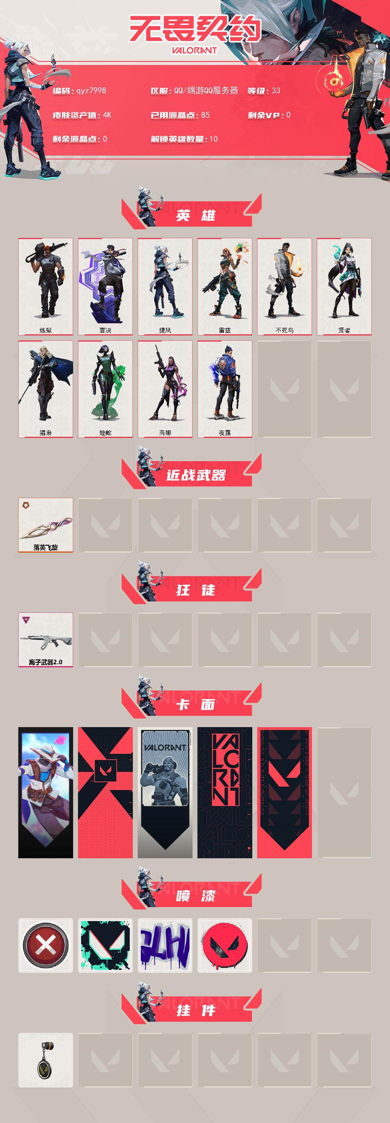 落英飞旋-带离子ak-qyz7998-近战武器皮肤:-落英飞旋-步呛皮肤:-狂徒-离子武器20-亮点:-【qyz7998】【英雄】:炼狱,壹决,捷风,雷兹,不死鸟,贤者,猎枭,蝰蛇,芮娜,夜露【近战-武器】:近战武器-落英飞旋【狂徒】:狂徒-离子武器//20【卡面】:无畏契约go!第一卷:零-卡面,代号红色-卡面,新兵报到-卡面,v契约-卡面,无畏契约-卡面【喷漆】:买装还是存钱-喷漆,胜利属于无畏契约-喷漆,glhf-喷漆,无畏契约-喷漆【挂饰】:无畏契约-纪念币-挂饰