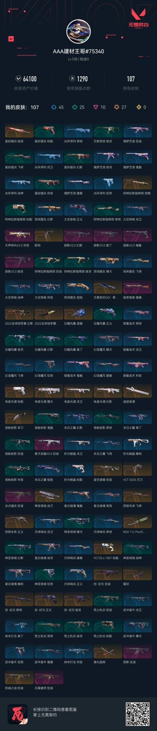 [14527759]27橙皮 10紫皮 107皮肤 28英雄 140卡面 1290已用源晶 铂金段位 【亮点皮肤】:幻影-2022全球冠军赛蝴蝶刀-2022全球冠军赛 【套装】:掠影2.0套装2022全球冠军赛电音光谱vct 2025赛季礼包vctcn2025套装创·纪元套装 【近战武器皮肤】:神圣领域 战刀rgx 11z pro//2.0 蝴蝶刀vct 2025 爪刀诡秘蛇影谐波音谱镭切鬼丸国纲星际猎兵 短剑影钩阿特拉斯指挥部匕首-无畏契约go!第三卷 【佩呛皮肤】:标配-vct25x100t正义-创·纪元标配-电音光谱鬼魅-掠影2.0正义-西部未来 【冲锋呛皮肤】:骇灵-掠影2.0骇灵-创·纪元 【霰弹呛皮肤】:判官-天界神兵2.0雄鹿-般若假面 【步呛皮肤】:狂徒-双城之战狂徒-掠影狂徒-创·纪元戍卫-电音光谱幻影-掠影2.0獠犬-电音光谱幻影-电音光谱狂徒-离子武器2.0狂徒-虚空遗器狂徒-冰点凝冻狂徒-日冕雄师 【狙击呛皮肤】:莽侠-创·纪元飞将-西部未来 【机呛皮肤】:奥丁-掠影2.0 【挂饰】:vctx100t挂饰薰衣草之心挂饰西部未来挂饰袖珍捷风挂饰鱼骨头挂饰双城之战小蛋糕挂饰双城之战魄罗挂饰神中神挂饰vct2025emea联赛挂饰vct2025太平洋联赛挂饰vct2025美洲联赛挂饰vct2025cn联赛挂饰2022全球冠军赛弯檐帽挂饰星荷璀璨挂饰创纪元挂饰
