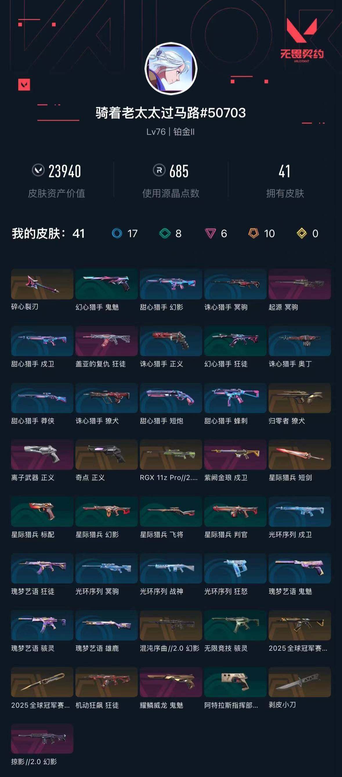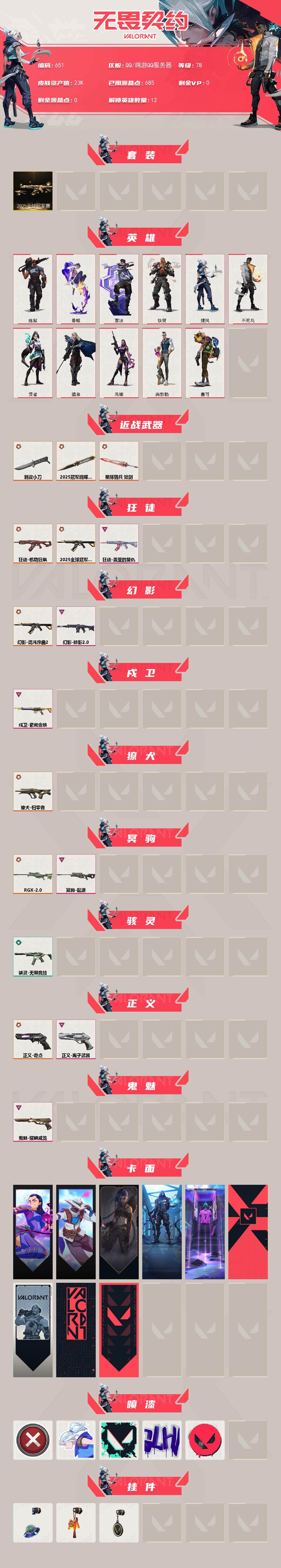 [14528793]【套装】:2025全球冠军赛套装 【英雄】:炼狱,暮蝶,壹决,铁臂,捷风,不死鸟,贤者,猎枭,芮娜,尚勃勒,盖可 【近战 武器】:近战武器-2025全球冠军赛 蝴蝶刀,近战武器-剥皮小刀,近战武器-星际猎兵 短剑 【狂徒】:狂徒-2025全球冠军赛,狂徒-机动狂飙,狂徒-盖亚的复仇 【幻影】:幻影-混沌序曲//2.0,幻影-掠影//2.0 【戍卫】:戍卫-紫阙金琅 【獠犬】:獠犬-归零者 【冥驹】:冥驹-rgx 11z pro//2.0,冥驹-起源 【骇灵】:骇灵-无限竞技 【正义】:正义-奇点,正义-离子武器 【鬼魅】:鬼魅-耀鳞威龙 【卡面】:无畏契约go!第一卷:芮娜 卡面,无畏契约go!第一卷:零 卡面,《双城之战》金克丝 卡面,暗呛 卡面,"luie" 卡面,代号红色 卡面,新兵报到 卡面,v契约 卡面,无畏契约 卡面 【喷漆】:买装还是存钱 喷漆,无畏契约go!第一卷:捷风 喷漆,胜利属于无畏契约 喷漆,glhf 喷漆,无畏契约 喷漆 【挂饰】:天外飞客 挂饰,好运福爪 挂饰,无畏契约 纪念币 挂饰