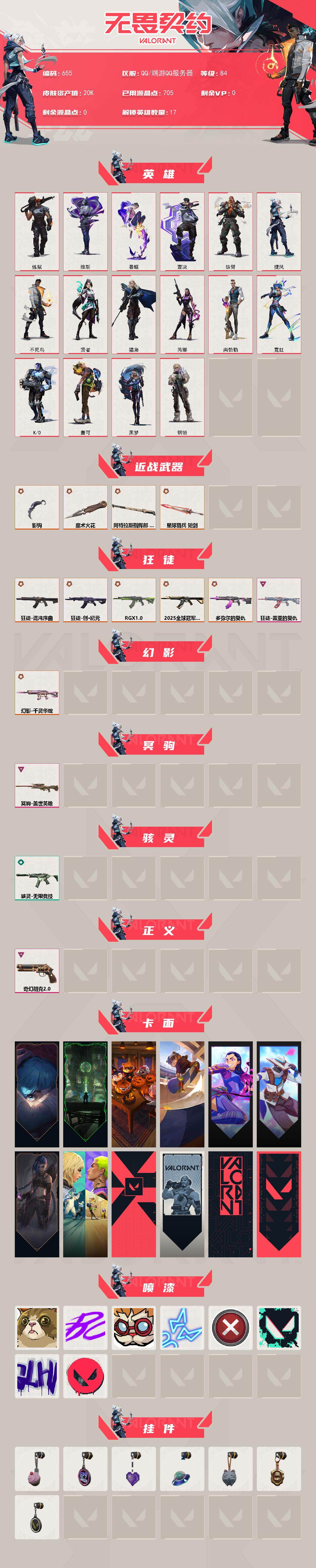 [14529217]【英雄】:炼狱,维斯,暮蝶,壹决,铁臂,捷风,不死鸟,贤者,猎枭,芮娜,尚勃勒,霓虹,k/o,盖可,黑梦,钢锁 【近战 武器】:近战武器-魔术火花,近战武器-影钩,近战武器-阿特拉斯指挥部 甩棍,近战武器-星际猎兵 短剑,近战武器-魔术火花 【狂徒】:狂徒-2025全球冠军赛,狂徒-混沌序曲,狂徒-创·纪元,狂徒-rgx 11z pro,狂徒-多弥尔的复仇,狂徒-盖亚的复仇 【幻影】:幻影-千灵华绽 【冥驹】:冥驹-盖世英雄 【骇灵】:骇灵-无限竞技 【正义】:正义-奇幻朋克//2.0 【卡面】:《双城之战》拥抱 卡面,欢迎来到底城 卡面,南瓜盛典 卡面,clutch 卡面,无畏契约go!第一卷:芮娜 卡面,无畏契约go!第一卷:零 卡面,《双城之战》金克丝 卡面,钢锁vs盖可 卡面,代号红色 卡面,新兵报到 卡面,v契约 卡面,无畏契约 卡面 【喷漆】:啊? 喷漆,嘭! 喷漆,都算到了 喷漆,霓光四射 喷漆,买装还是存钱 喷漆,胜利属于无畏契约 喷漆,glhf 喷漆,无畏契约 喷漆 【挂饰】:《双城之战》小蛋糕 挂饰,第九季//第三幕 纪念币 挂饰,薰衣草之心 挂饰,天外飞客 挂饰,《双城之战》魄罗 挂饰,海豹的认可 挂饰,无畏契约 纪念币 挂饰
