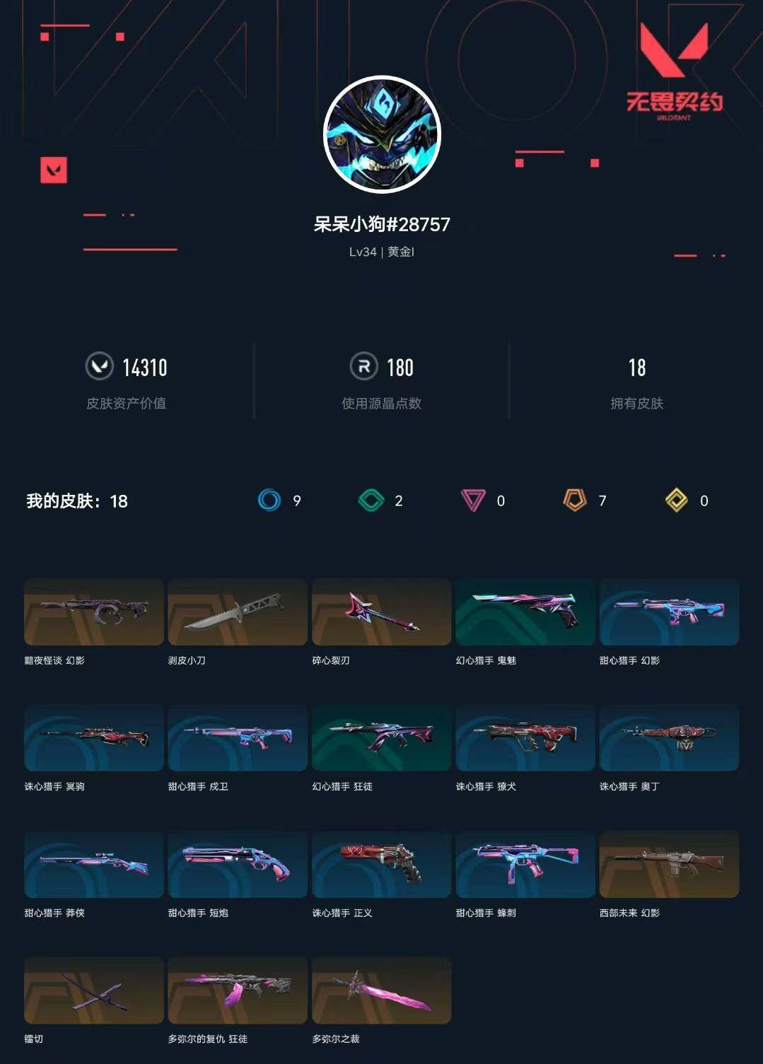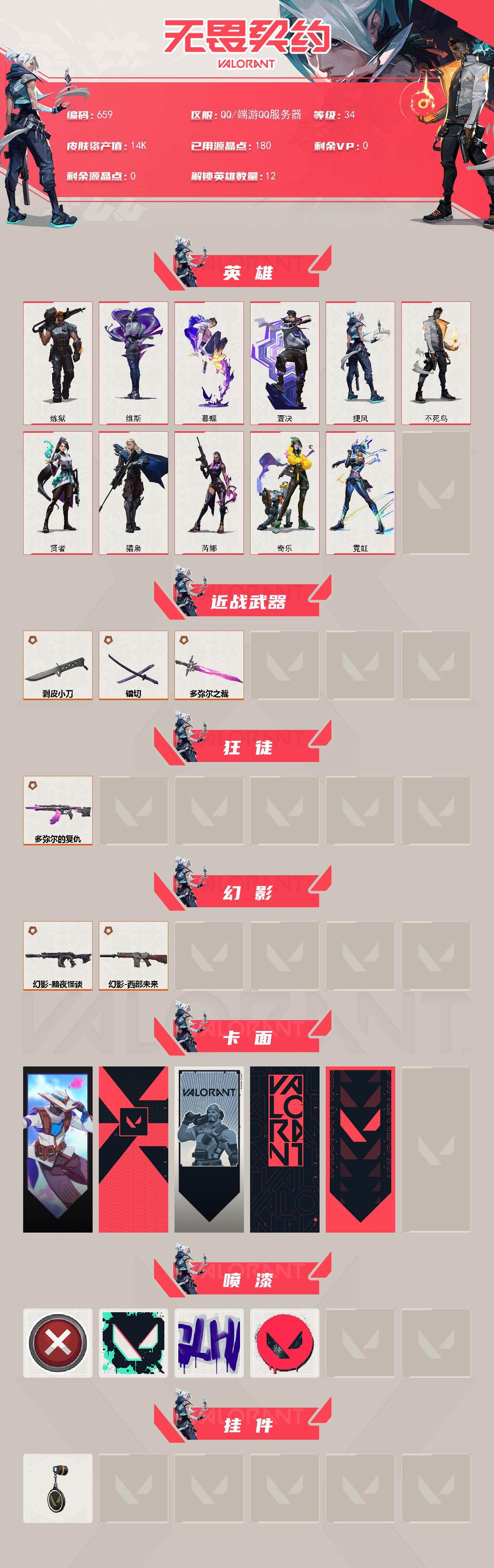 [14529553]【英雄】:炼狱,维斯,暮蝶,壹决,捷风,不死鸟,贤者,猎枭,芮娜,奇乐,霓虹 【近战 武器】:近战武器-多弥尔之裁,近战武器-剥皮小刀,近战武器-镭切 【狂徒】:狂徒-多弥尔的复仇 【幻影】:幻影-黯夜怪谈,幻影-西部未来,幻影-西部未来 【卡面】:无畏契约go!第一卷:零 卡面,代号红色 卡面,新兵报到 卡面,v契约 卡面,无畏契约 卡面 【喷漆】:买装还是存钱 喷漆,胜利属于无畏契约 喷漆,glhf 喷漆,无畏契约 喷漆 【挂饰】:无畏契约 纪念币 挂饰