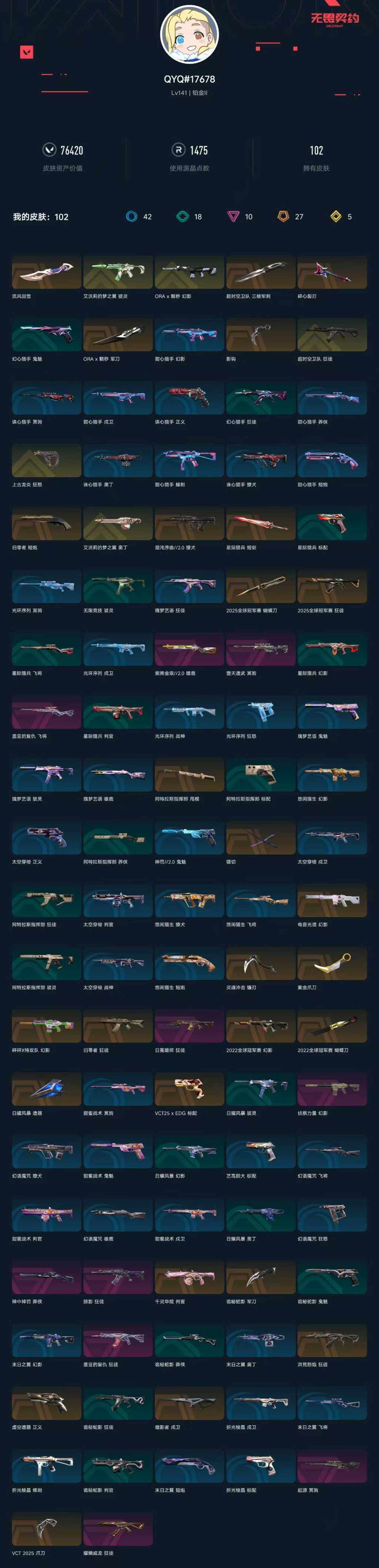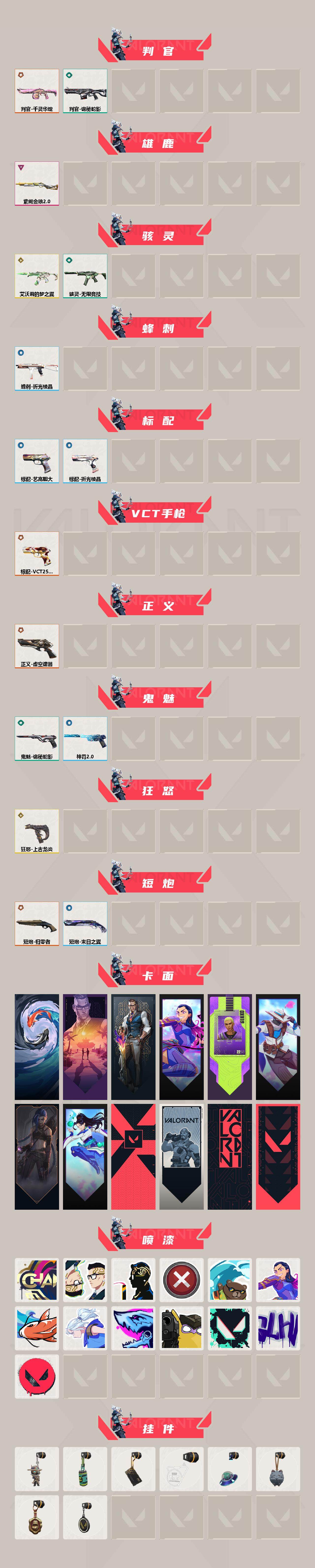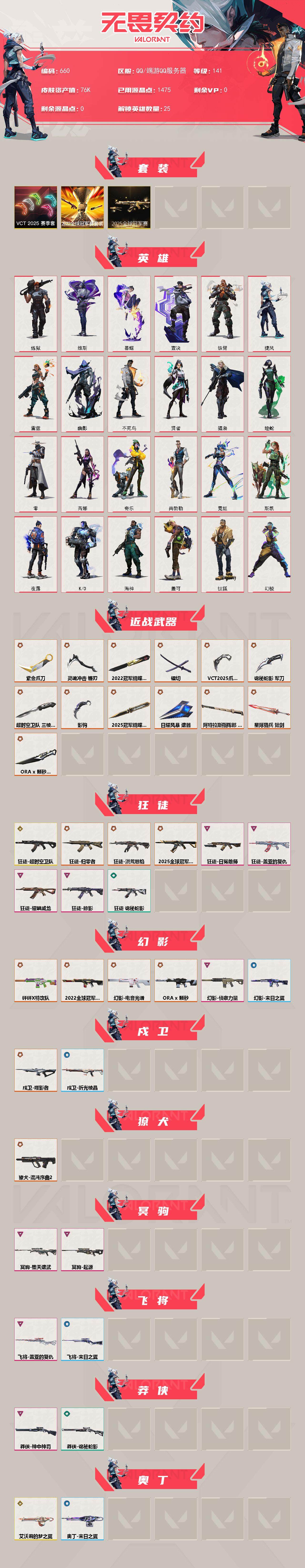 [14529620]【套装】:2025全球冠军赛套装,2022全球冠军赛套装,vct 2025 赛季套装 【英雄】:幻棱,炼狱,维斯,暮蝶,钛狐,壹决,铁臂,捷风,雷兹,幽影,不死鸟,贤者,猎枭,蝰蛇,零,芮娜,奇乐,尚勃勒,霓虹,斯凯,夜露,k/o,海神,盖可 【近战 武器】:近战武器-2025全球冠军赛 蝴蝶刀,近战武器-2022全球冠军赛 蝴蝶刀,近战武器-流风回雪,近战武器-a x 颗秒 军刀,近战武器-影钩,近战武器-超时空卫队 三棱军刺,近战武器-vct 2025 爪刀,近战武器-紫金爪刀,近战武器-镭切,近战武器-灵魂冲击 镰刃,近战武器-诡秘蛇影 军刀,近战武器-日耀风暴 遗器,近战武器-阿特拉斯指挥部 甩棍,近战武器-星际猎兵 短剑 【狂徒】:狂徒-超时空卫队,狂徒-2025全球冠军赛,狂徒-归零者,狂徒-洪荒怒焰,狂徒-掠影,狂徒-盖亚的复仇,狂徒-日冕雄师,狂徒-耀鳞威龙,狂徒-诡秘蛇影 【幻影】:幻影-2022全球冠军赛,幻影-砰砰x特攻队,幻影-电音光谱,幻影-a x 颗秒,幻影-侦察力量,幻影-末日之翼,幻影-电音光谱 【戍卫】:戍卫-噬影者,戍卫-折光棱晶 【獠犬】:獠犬-混沌序曲//2.0 【冥驹】:冥驹-堕天遗武,冥驹-起源 【飞将】:飞将-盖亚的复仇,飞将-末日之翼 【莽侠】:莽侠-神中神罚,莽侠-诡秘蛇影 【奥丁】:奥丁-艾沃莉的梦之翼,奥丁-末日之翼 【判官】:判官-千灵华绽,判官-诡秘蛇影 【雄鹿】:雄鹿-紫阙金琅//2.0 【骇灵】:骇灵-艾沃莉的梦之翼,骇灵-无限竞技 【蜂刺】:蜂刺-折光棱晶 【标配】:标配-艺高胆大,标配-折光棱晶 【vct手呛】:标配-vct25 x edg 【正义】:正义-虚空遗器 【鬼魅】:鬼魅-诡秘蛇影,鬼魅-神罚//2.0 【狂怒】:狂怒-上古龙炎 【短炮】:短炮-归零者,短炮-末日之翼 【卡面】:红鳞松叶 卡面,风险合作 卡面,无畏契约:尚勃勒 卡面,无畏契约go!第一卷:芮娜 卡面,盖可工牌 卡面,无畏契约go!第一卷:零 卡面,《双城之战》金克丝 卡面,无畏契约go!第一卷:贤者 卡面,代号红色 卡面,新兵报到 卡面,v契约 卡面,无畏契约 卡面 【喷漆】:尚勃勒 喷漆,分身有术 喷漆,致命优雅 喷漆,买装还是存钱 喷漆,酷熊冲浪 喷漆,无畏契约go!第一卷:芮娜 喷漆,红鳞 喷漆,无畏契约go