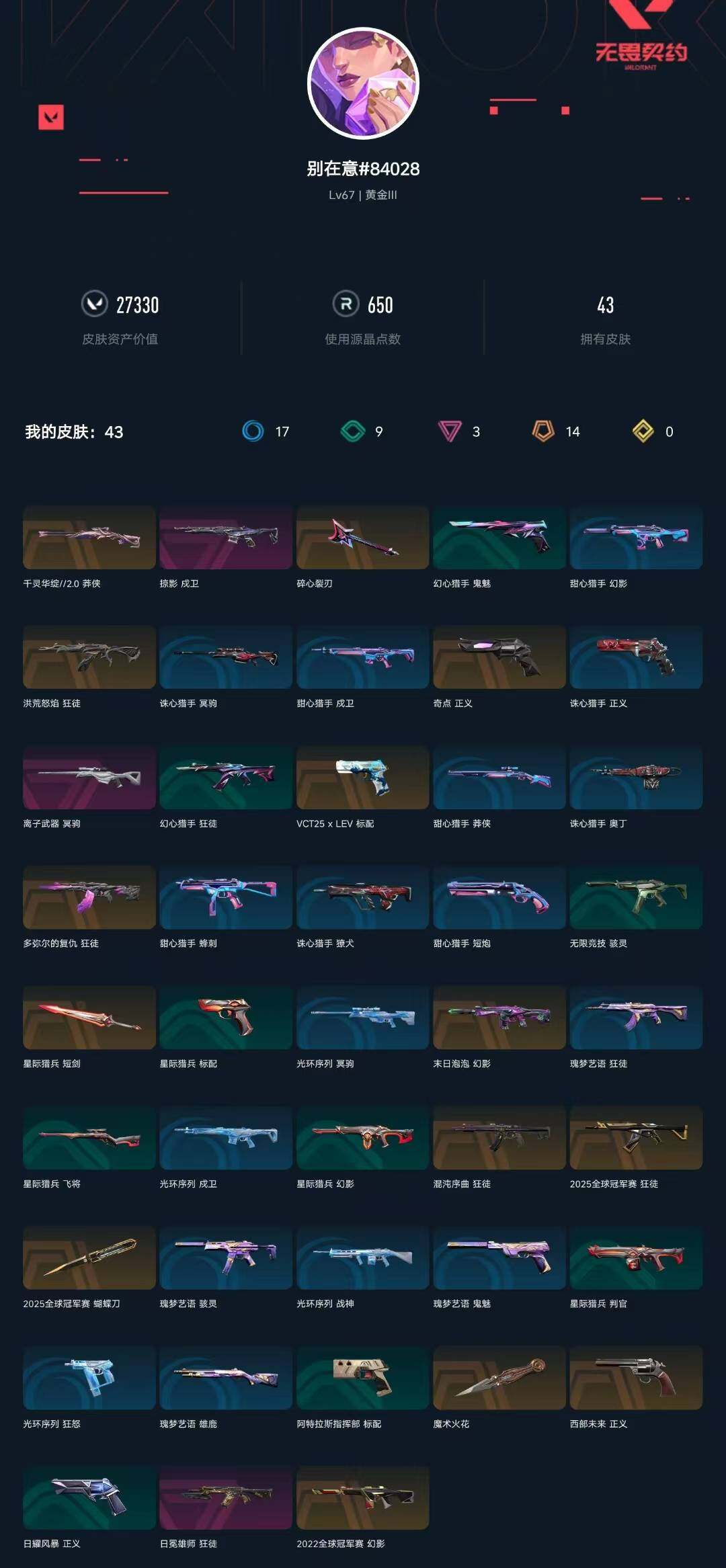 [14529945]【套装】:2025全球冠军赛套装 【英雄】:幻棱,炼狱,暮蝶,壹决,捷风,幽影,不死鸟,贤者,猎枭,蝰蛇,零,芮娜,尚勃勒,霓虹,k/o,海神,盖可,黑梦,钢锁 【近战 武器】:近战武器-2025全球冠军赛 蝴蝶刀,近战武器-魔术火花,近战武器-星际猎兵 短剑,近战武器-魔术火花 【狂徒】:狂徒-2025全球冠军赛,狂徒-洪荒怒焰,狂徒-混沌序曲,狂徒-多弥尔的复仇,狂徒-日冕雄师 【幻影】:幻影-2022全球冠军赛,幻影-末日泡泡 【戍卫】:戍卫-掠影 【冥驹】:冥驹-离子武器 【莽侠】:莽侠-千灵华绽//2.0 【骇灵】:骇灵-无限竞技 【vct手呛】:标配-vct25 x lev 【正义】:正义-奇点,正义-西部未来 【卡面】:无畏契约:尚勃勒 卡面,无畏契约go!第一卷:芮娜 卡面,无畏契约go!第一卷:零 卡面,《双城之战》金克丝 卡面,钢锁vs盖可 卡面,别冒尖 卡面,代号红色 卡面,新兵报到 卡面,v契约 卡面,无畏契约 卡面 【喷漆】:分身有术 喷漆,致命优雅 喷漆,霓光四射 喷漆,买装还是存钱 喷漆,关门放狗 喷漆,酷熊冲浪 喷漆,无畏契约go!第一卷:芮娜 喷漆,无畏契约go!第一卷:贤者 喷漆,暴走萝莉 喷漆,胜利属于无畏契约 喷漆,glhf 喷漆,无畏契约 喷漆 【挂饰】:无畏契约go!第一卷 零 挂饰,天外飞客 挂饰,《双城之战》魄罗 挂饰,无畏契约 纪念币 挂饰
