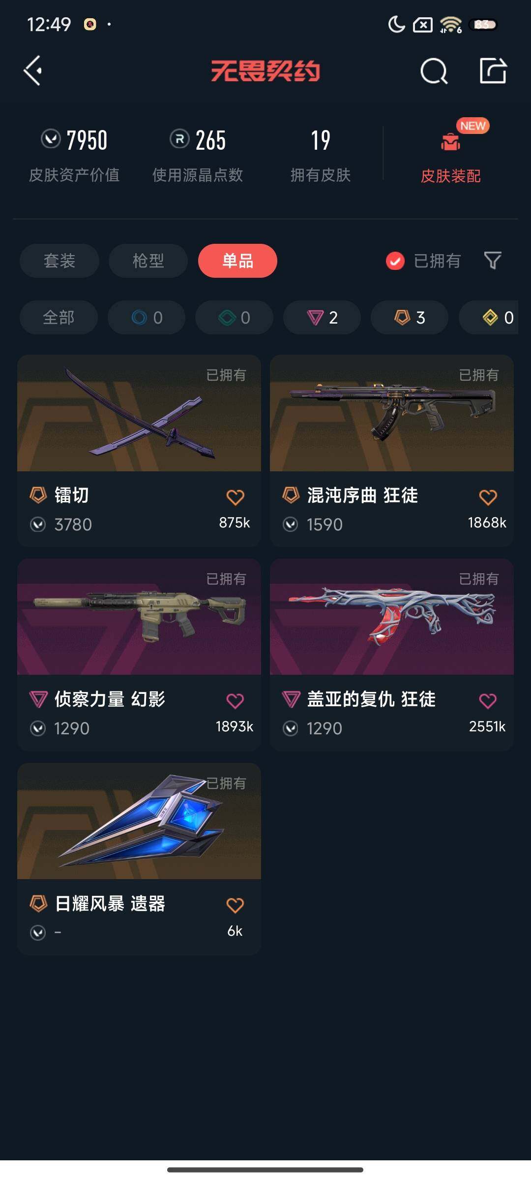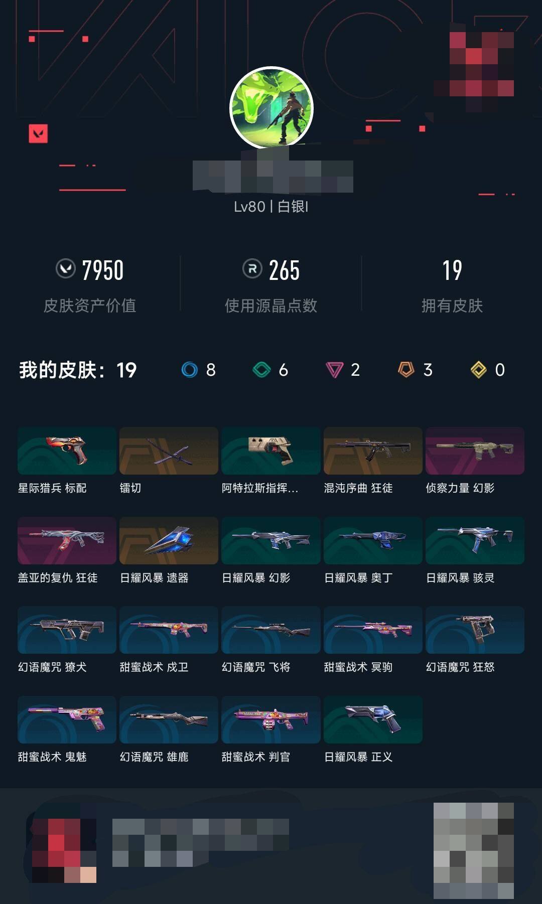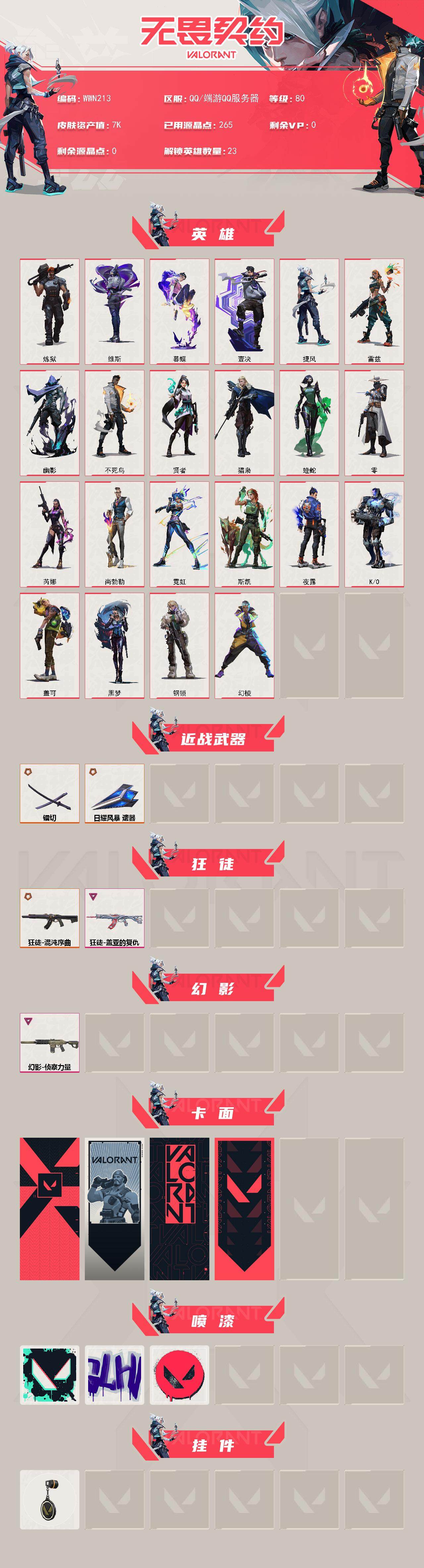 【wwn213】终极3/卓越2/皮肤19/等级80/段位:白银/幻棱/炼狱/维斯/暮蝶/壹决/捷风/雷兹/幽影/不死鸟/贤者/猎枭/蝰蛇/零/芮娜/尚勃勒/霓虹/斯凯/夜露/k/o/盖可/黑梦/钢锁/近战武器-镭切/近战武器-日耀风暴 遗器/狂徒-混沌序曲/狂徒-盖亚的复仇/幻影-侦察力量/代号红色 卡面/新兵报到 卡面/v契约 卡面/无畏契约 卡面/胜利属于无畏契约 喷漆/glhf 喷漆/无畏契约 喷漆/无畏契约 纪念币 挂饰