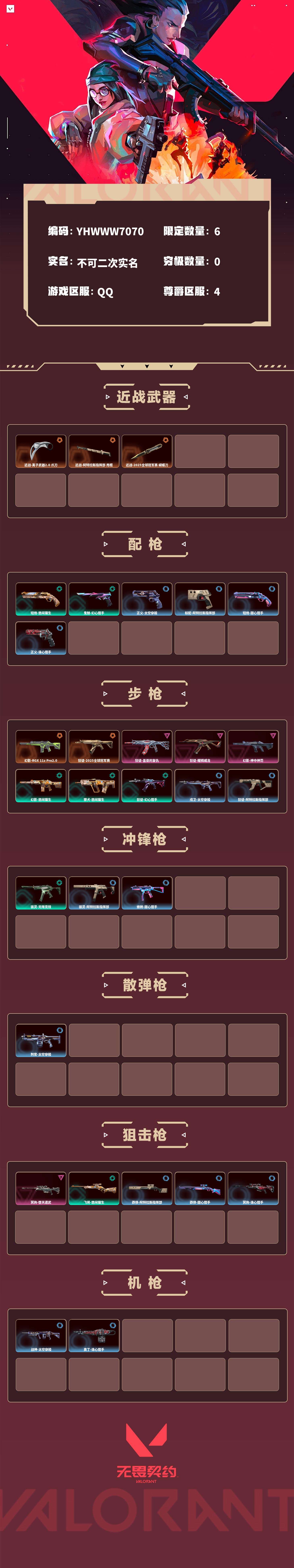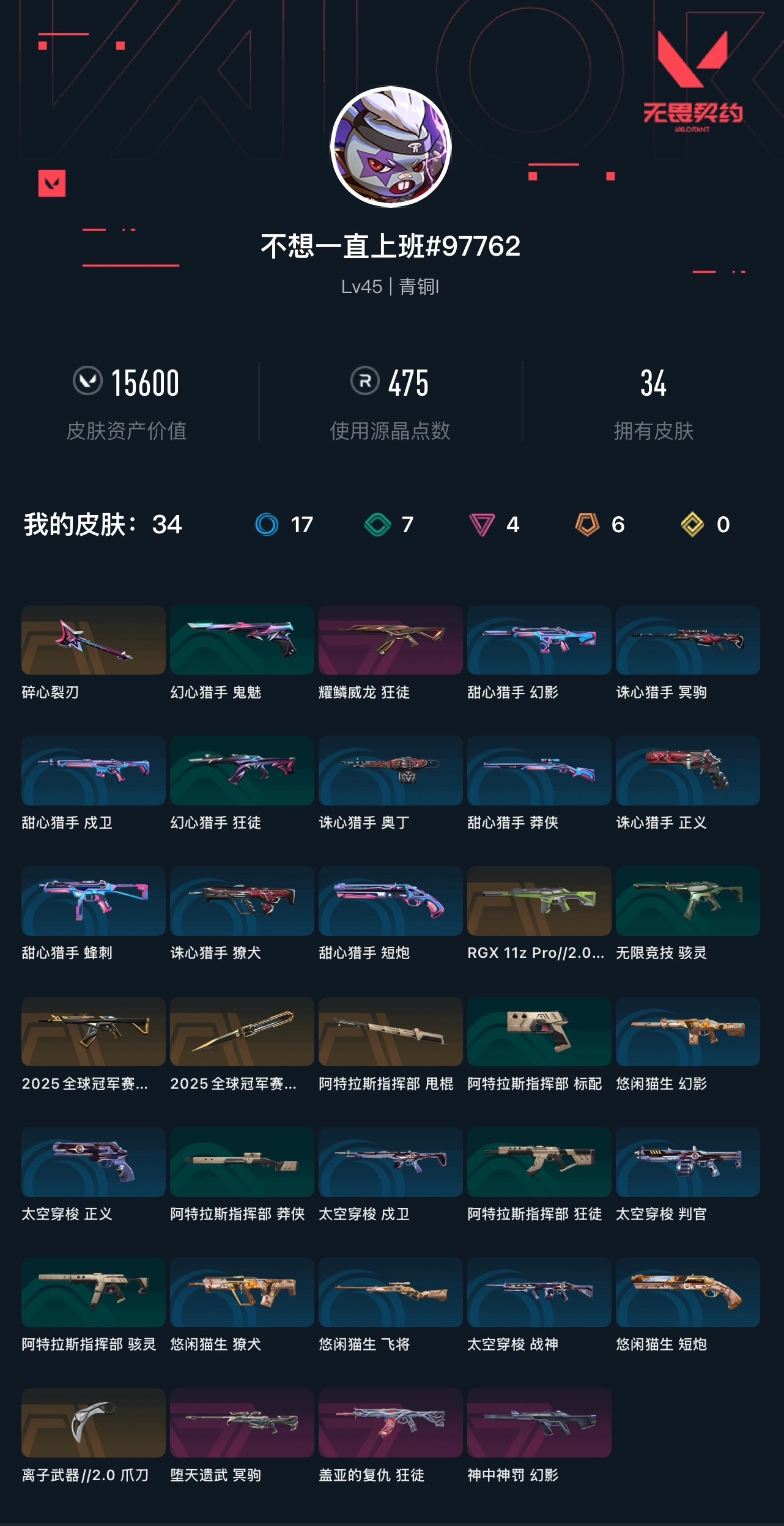 【无畏契约】【yhwww7070】等级:45,已用无畏点15600,已用源晶点475,紫皮:狂徒-盖亚的复仇|冥驹-堕天遗武|狂徒-耀鳞威龙|幻影-神中神罚__段位:青铜__绿皮:骇灵-无限竞技|短炮-悠闲猫生|飞将-悠闲猫生|幻影-悠闲猫生|獠犬-悠闲猫生|狂徒-幻心猎手|鬼魅-幻心猎手__橙皮:幻影-rgx 11z pro2.0|近战-离子武器2.0 爪刀|近战-阿特拉斯指挥部 甩棍|狂徒-2025全球冠军赛|近战-2025全球冠军赛 蝴蝶刀__蓝皮:正义-太空穿梭|战神-太空穿梭|判官-太空穿梭|戍卫-太空穿梭|骇灵-阿特拉斯指挥部|莽侠-阿特拉斯指挥部|标配-阿特拉斯指挥部|狂徒-阿特拉斯指挥部|蜂刺-甜心猎手|短炮-甜心猎手|莽侠-甜心猎手|幻影-甜心猎手|戍卫-甜心猎手|正义-诛心猎手|冥驹-诛心猎手|獠犬-诛心猎手|奥丁-诛心猎手__英雄:尚勃勒|黑梦|斯凯|暮蝶|壹决|奇乐|炼狱|贤者|猎枭|芮娜|零|捷风|不死鸟|禁灭