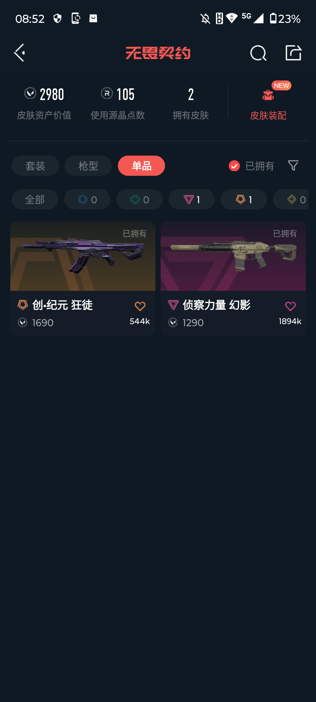 [14526674]q192393无畏契约/等级23/段位青铜/英雄10/皮肤2/资产2980/已使用r点105/剩余r点45/创·纪元-狂徒,侦察力量-幻影