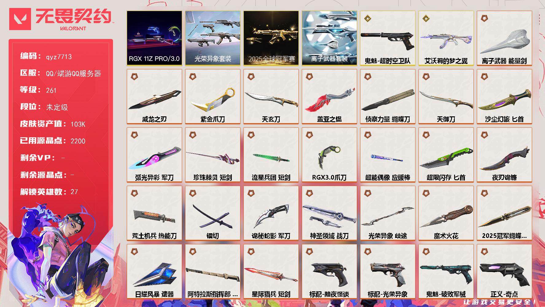 25套装-精品大库存-手慢无-qyz7713-套装:-离子武器套装rgx-11z-pro//30套装光荣异象2025全球冠军赛-近战武器皮肤:-军刀-弧光异彩蝴蝶刀-侦察力量盖亚之愠天玄刀匕首-沙尘幻旅紫金爪刀威龙之刃短剑-珍珠棘贝天御刀离子武器-能量剑超能偶像-应援棒爪刀-rgx-11z-pro-30短剑-流星兵团夜刃诡镰匕首-超限闪存荒土机兵热能刀镭切神圣领域-战刀诡秘蛇影歧途魔术火花2025全球冠军赛-蝴蝶刀-步呛皮肤:-狂徒-紫阙金琅狂徒-盖亚的复仇幻影-侦察力量狂徒-冰点凝冻狂徒-归零者戍卫-破败军械狂徒-塑水宗狂徒-洪荒怒焰狂徒-海洋之星幻影-离子武器狂徒-日冕雄师狂徒-艾沃莉的梦之翼狂徒-混沌序曲獠犬-黯夜怪谈狂徒-奇点//20狂徒-掠影狂徒-双城之战狂徒-噬影者狂徒-rgx-11z-pro狂徒-光荣异象幻影-末日泡泡2025全球冠军赛-狂徒-佩呛皮肤:-正义-奇点鬼魅-天界神兵鬼魅-破败军械正义-塑水宗正义-千灵华绽正义-离子武器正义-rgx-11z-pro-30标配-黯夜怪谈正义-毁灭骑士标配-vct25xg2正义-西部未来标配-光荣异象鬼魅-超时空卫队-狙击呛皮肤:-冥驹-堕天遗武冥驹-离子武器莽侠-rgx-11z-pro-30飞将-黯夜怪谈冥驹-光荣异象-霰弹呛皮肤:-雄鹿-离子武器判官-光荣异象-亮点:-【qyz7713】25套装-精品大库存-手慢无-qyz7713-lv261-未定级,-刀皮数量25,呛皮数量189-限定52终极2卓越13-;皮肤资产价值103920,已用r点2200;【刀皮】:近战武器-2025全球冠军赛蝴蝶刀,近战武器-显卡30爪刀,近战武器-闪耀之星荧光棒,近战武器-魔术火花,近战武器-紫金爪刀,近战武器-超限闪存匕首,近战武器-离子武器能量剑,近战武器-夜刃诡镰,近战武器-威龙之刃,近战武器-天玄刀,近战武器-盖亚之愠,近战武器-侦察力量蝴蝶刀,近战武器-天御刀,近战武器-沙尘幻旅匕首,近战武器-弧光异彩军刀,近战武器-珍珠棘贝短剑,近战武器-流星兵团短剑,近战武器-荒土机兵热能刀,近战武器-诡秘蛇影军刀,近战武器-神圣领域战刀,近战武器-镭切,近战武器-光荣异象歧途,近战武器-日耀风暴遗器,近战武器-阿特拉斯指